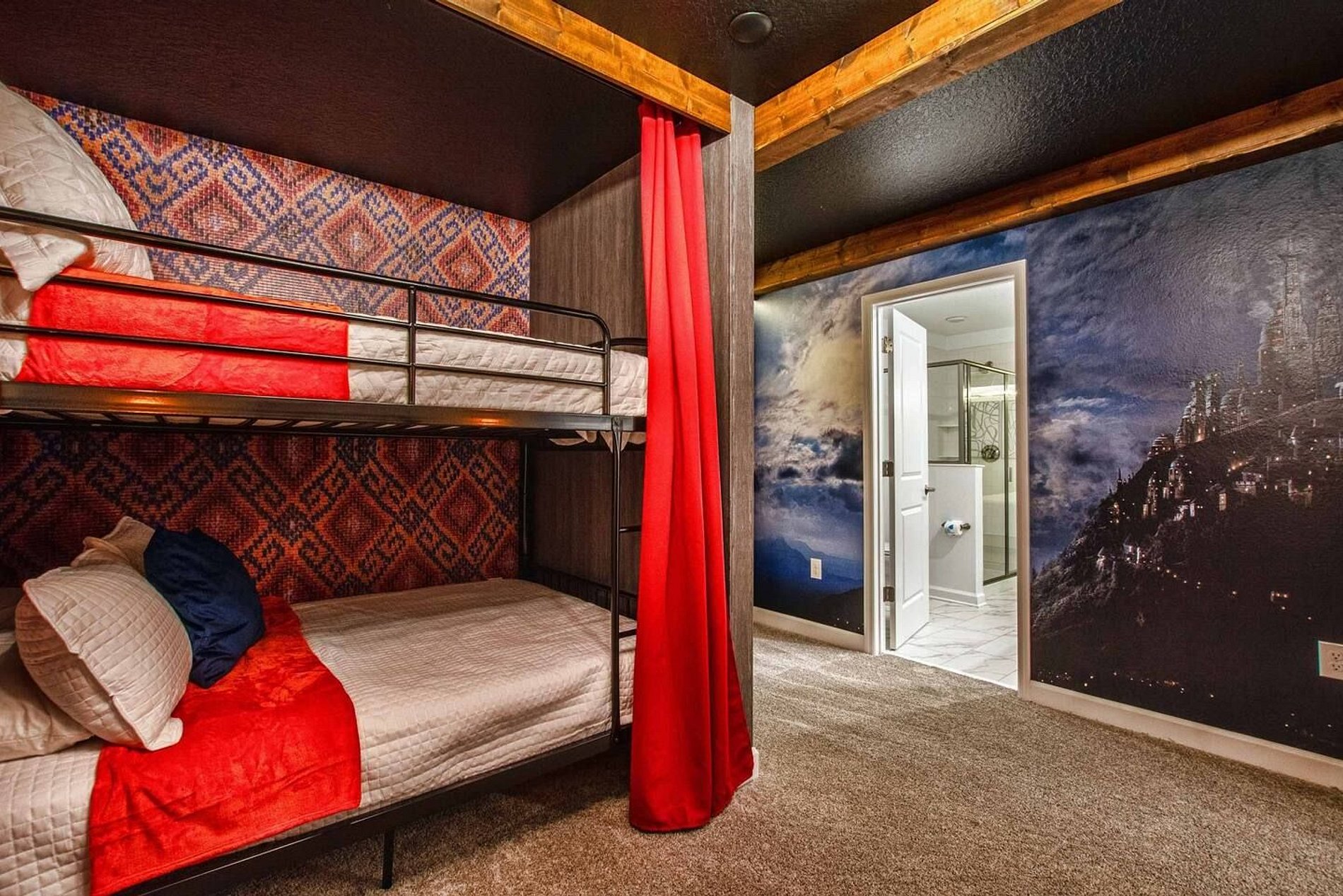 2nd floor: -Room with king-size bed, shared suite (2 people). -Minions themed room with a queen bed plus a bunk bed, shared suite (4 people) -Harry Potter themed room with a bunk bed, two double beds, shared suite (4 people). -Room with king-size bed, shared suite (2 people). -Mickey themed room, a bunk bed with two double beds (4 people). -Star Wars themed room, one queen-size bed, plus a bunk bed, two double beds (sleeps 6) -Bedroom with king-size bed. (2 people). This house has 2 private suites, 4 shared suites and 3 bedrooms and they share the same bathroom.