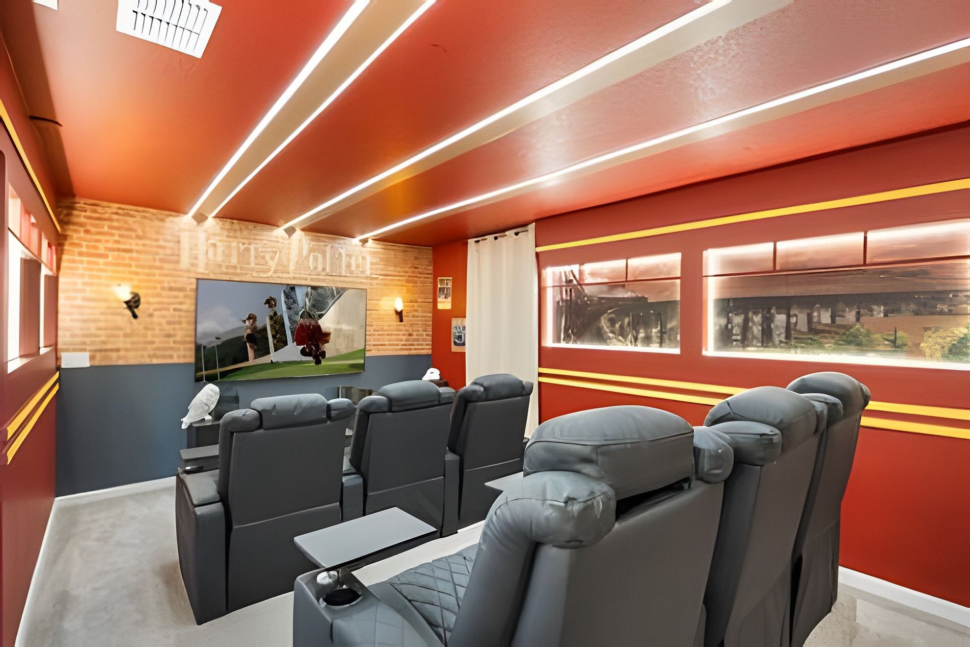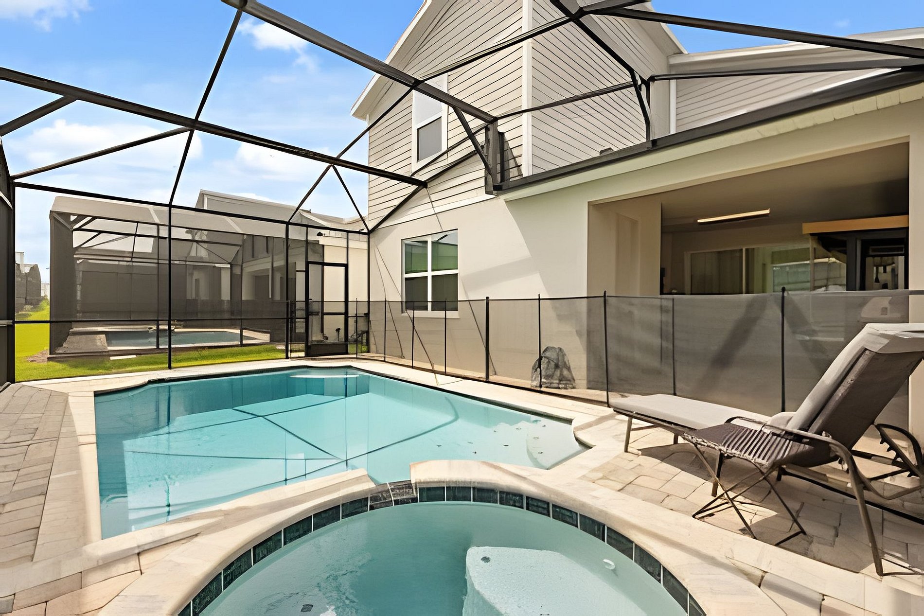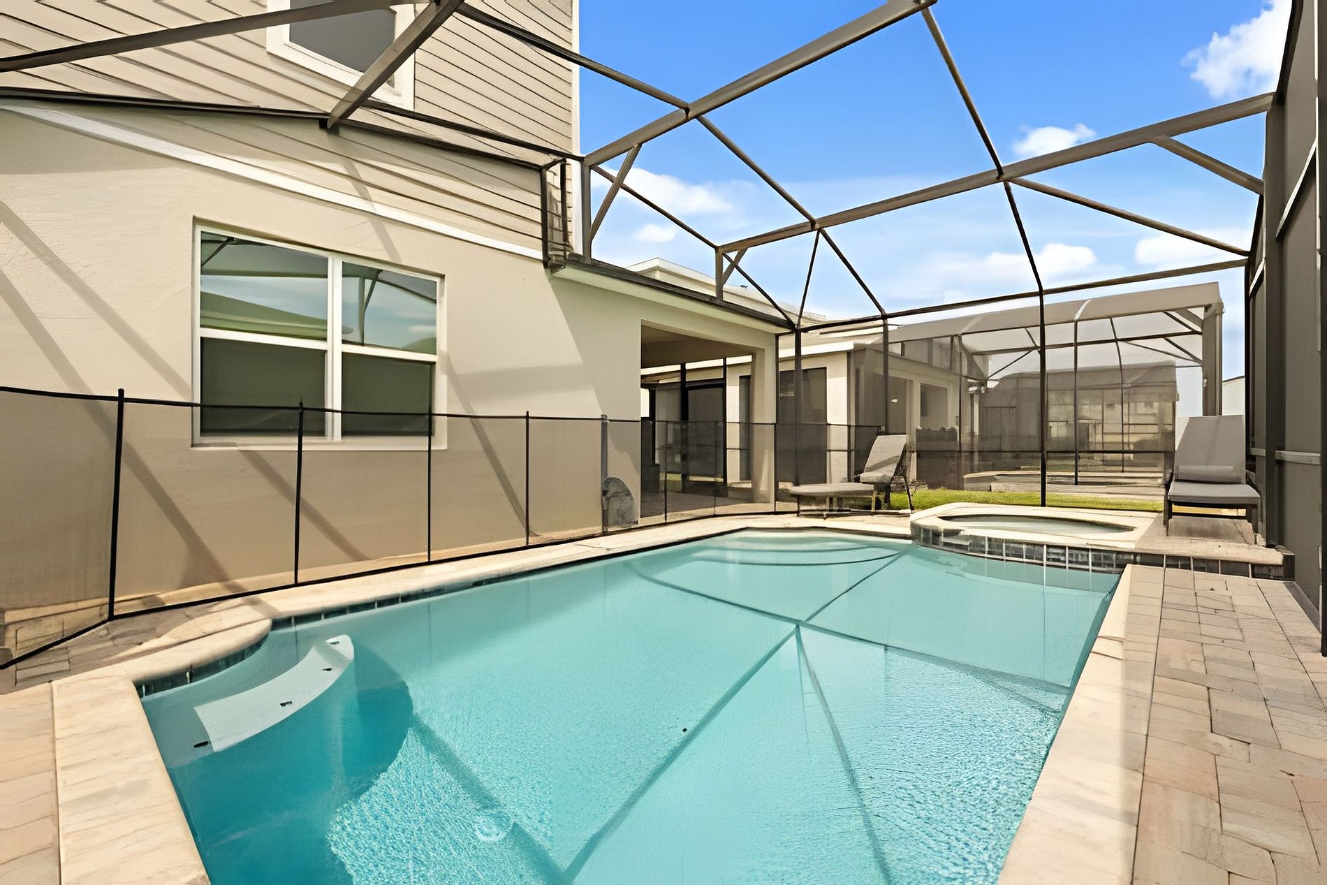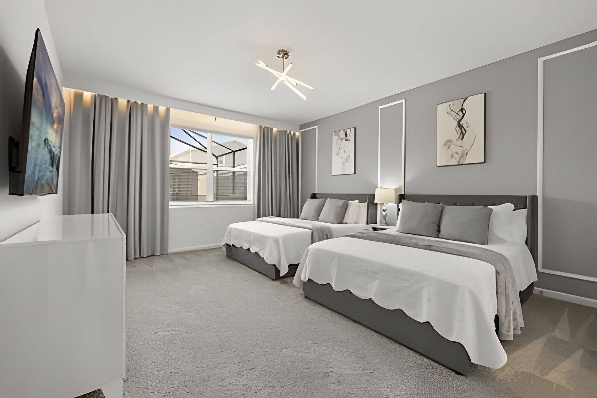 CONFIGURAÇÃO DE CAMAS: 1º andar Quarto 1: 1 cama king size Quarto 2: 2 camas queen size, banheiro privativo 1 sala de jogos 1 banheiro compartilhado 1 lavabo na área externa 2º andar Quarto 3: 1 cama king size, banheiro privativo Quarto 4: 1 cama king size, banheiro privativo Quarto 5: 1 beliche com 2 camas de casal, tema Como Treinar Seu Dragão Quarto 6: 1 beliche com 2 camas de casal, tema A Bela e a Fera, banheiro compartilhado Quarto 7: 1 cama king size, banheiro compartilhado 1 sala de cinema 2 banheiros compartilhados. Esta casa possui 3 suítes completas. * Ar condicionado central * Código de porta privativo para cada hóspede * Cozinha totalmente equipada * Máquina de lavar e secar * Toalhas e lençóis fornecidos * Toalhas de rosto não são fornecidas * Secadores de cabelo, ferro e tábua de passar * TV em todos os quartos * Sala de estar com TV de tela plana * TV a cabo e Wi-Fi gratuitos * Piscina privativa com tela + cerca de segurança para crianças * Móveis para pátio externo com espreguiçadeiras, berço portátil / cadeira alta (grátis mediante solicitação)