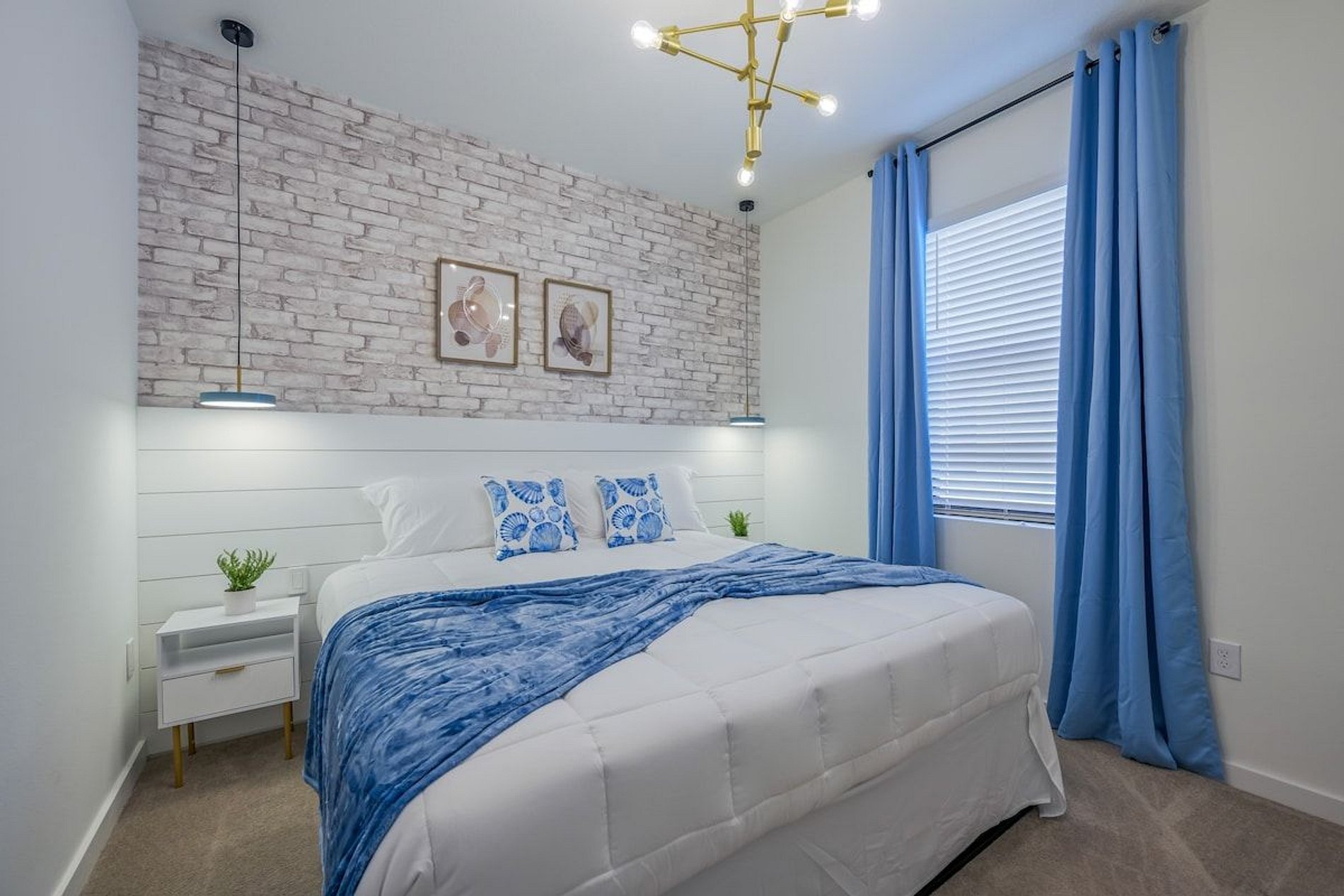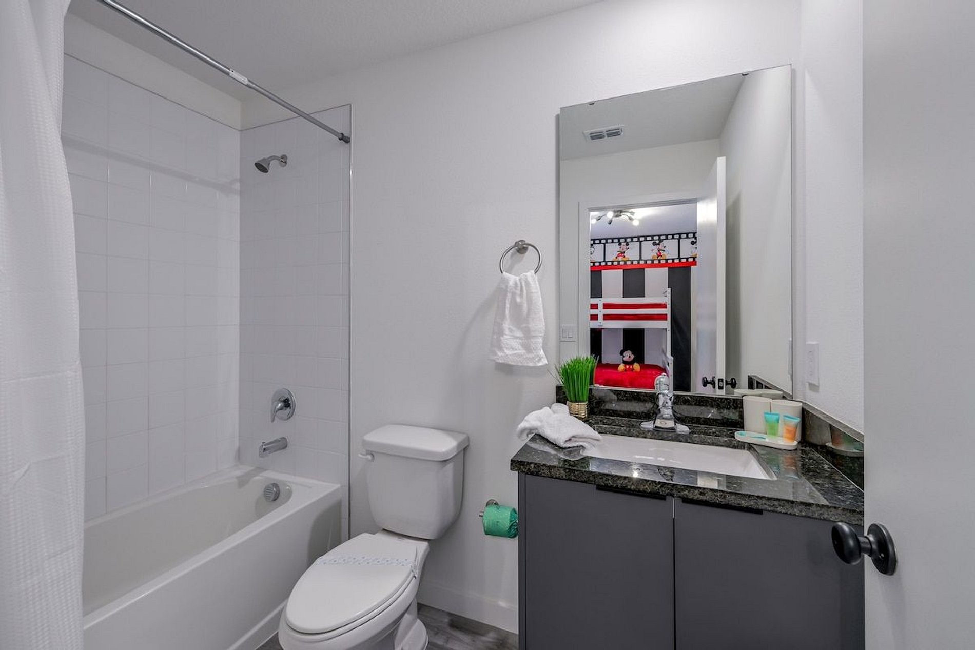 1st Floor - 1 bedroom with queen bed (shared suite with hallway) 2nd Floor - 1 suite with king bed - 1 suite with bunk bed, 1 full bed, 1 twin bed and 1 auxiliary twin bed; Mickey Mouse theme. THIS HOUSE HAS 2 ENTIRE SUITES.