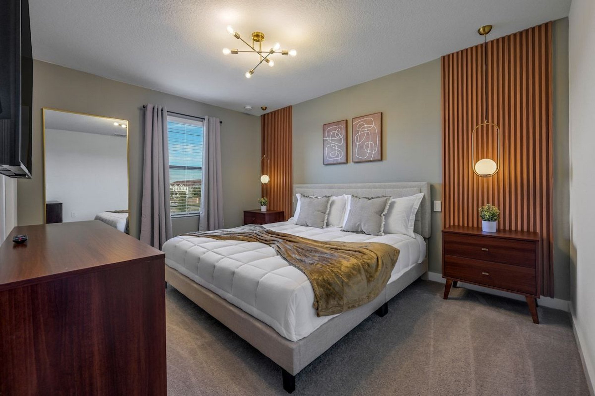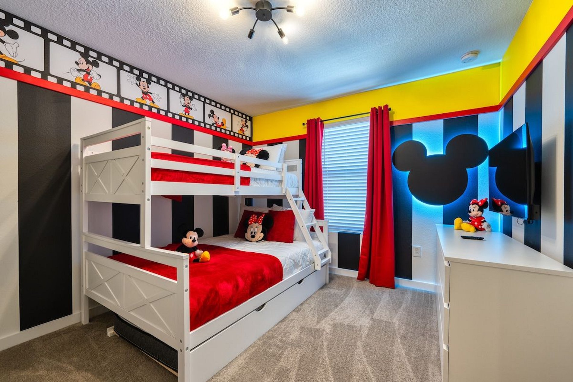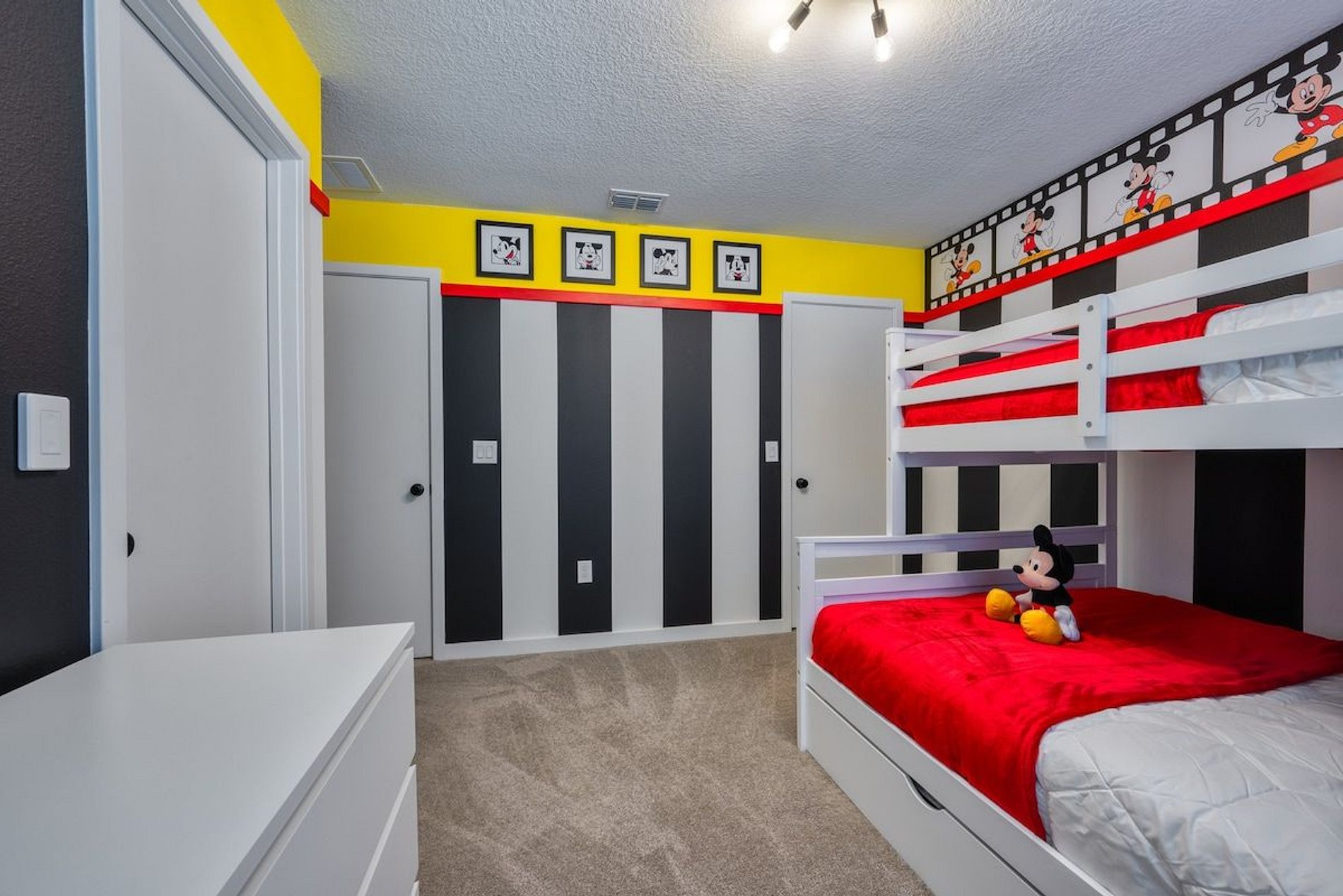 1st Floor - 1 bedroom with queen bed (shared suite with hallway) 2nd Floor - 1 suite with king bed - 1 suite with bunk bed, 1 full bed, 1 twin bed and 1 auxiliary twin bed; Mickey Mouse theme. THIS HOUSE HAS 2 ENTIRE SUITES.