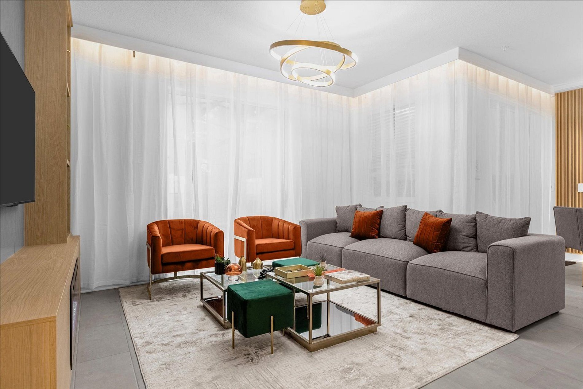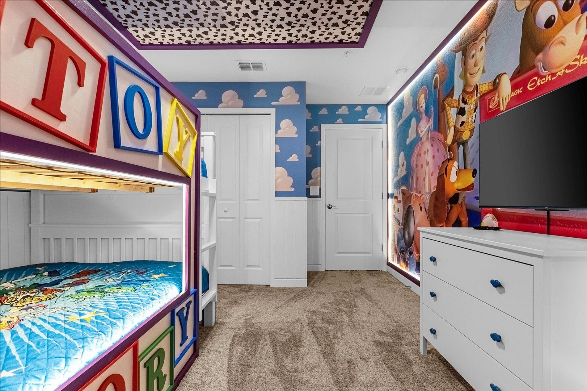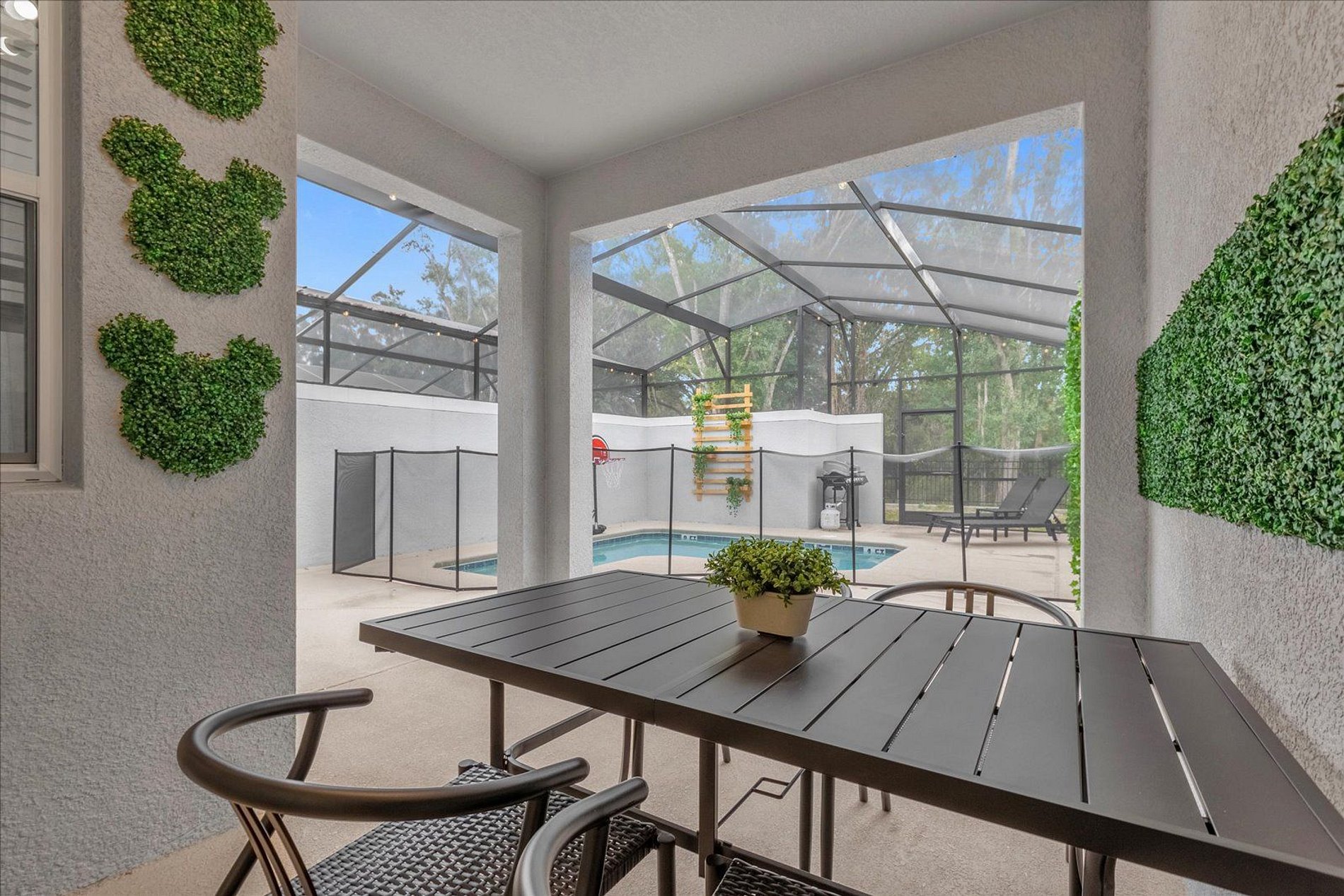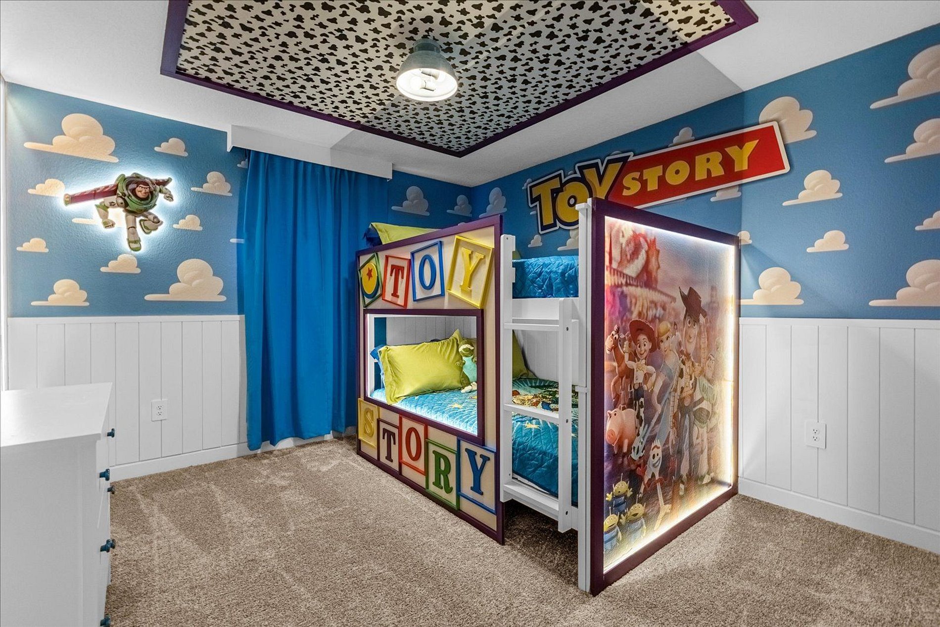 The house offers four bedrooms - two fun themed bedrooms for the kids -, three bathrooms, a fully equipped kitchen, private pool and family living room. Your family will be close to all attractions during your stay in this well-located home: restaurants, shops, theme parks and outlets. The perfect location for those looking for space and comfort when visiting the beautiful Orlando region. Toy Story and Mickey Mouse themed room. Sophisticated living room and kitchen. Modern house.