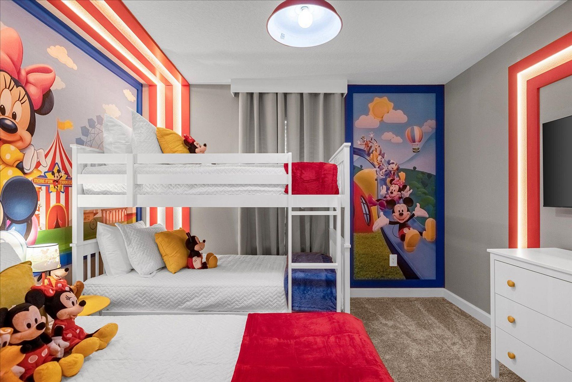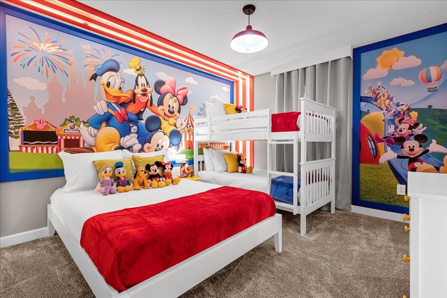 1 ° floor 1 bedroom, double bed; 1 full bathroom; 2nd Floor 1 bedroom, king-size bed. Suite; 1 Mickey Mouse room, with 1 double bed and 1 bunk bed (Twin); 1 Toy Story bedroom, 1 bunk bed (Full); The house has 1 suite.