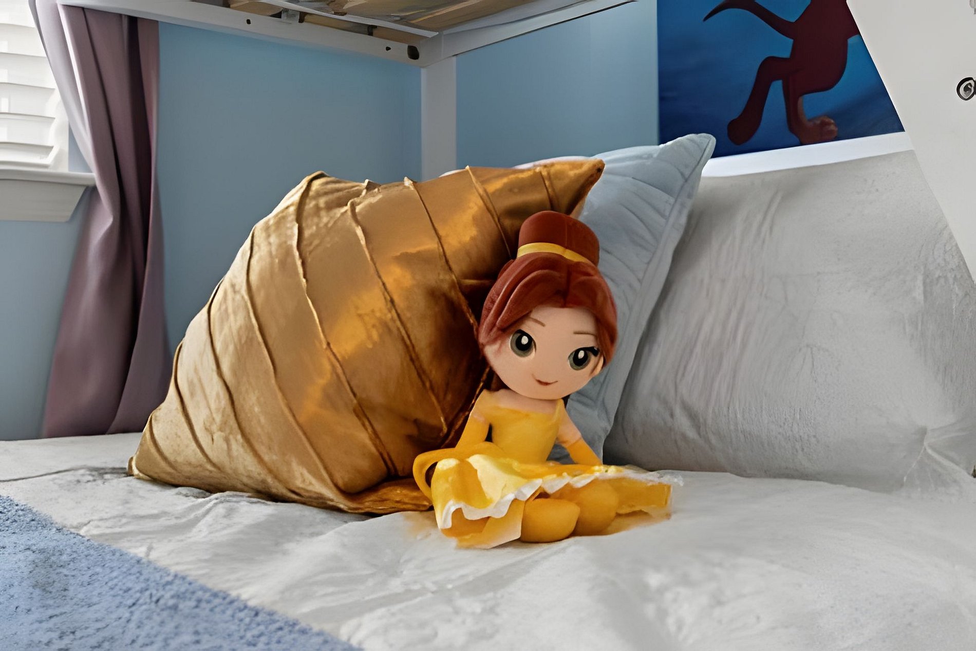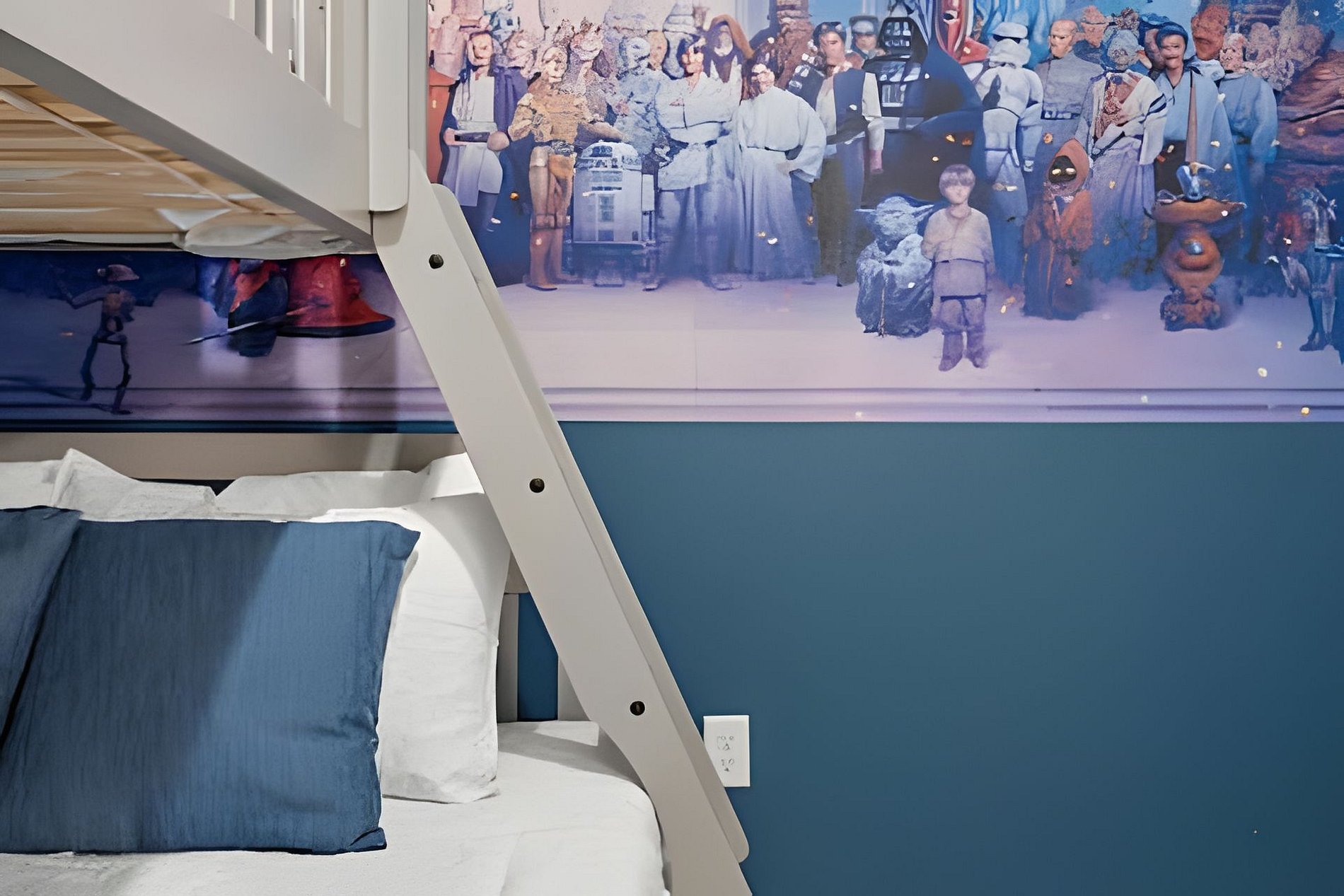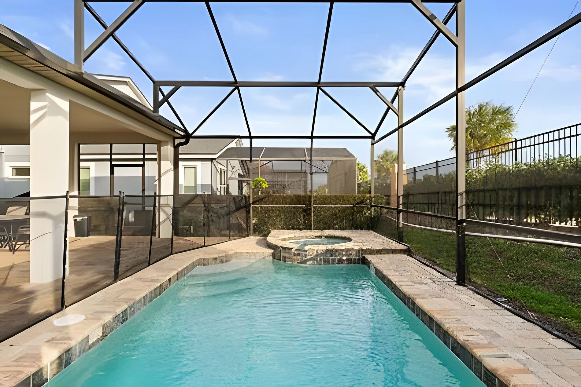 BED CONFIGURATION: 1st floor - Bedroom 1: 1 King bed, en-suite 2nd floor - Bedroom 2: 1 King bed, en-suite; - Bedroom 3: 1 bunk bed with a full bed on the bottom, a twin bed on the top, and 1 auxiliary twin bed, shared bathroom - Bedroom 4: 1 Queen bed, shared bathroom - Bedroom 5: 1 bunk bed with a full bed on the bottom, a twin bed on the top, and 1 auxiliary twin bed (Star Wars) - shared bathroom - Bedroom 6: 1 bunk bed with a full bed on the bottom, a twin bed on the top, and 1 auxiliary twin bed (Princesas) - shared bathroom THIS HAS 2 ENTIRE SUITES AND 4 SHARED SUITES. *Central AC *Private Door Code for Each Guest Stay *Fully Equipped Kitchen *Washer & Dryer *Towels & Linens Provided *Washcloths Are Not Provided *Hair Dryers, Iron & Ironing Board *TV in Every Bedroom *Family Room with Flat Screen TV *Free Cable TV & WiFi *Private Screened-in Pool + Child Safety Pool Fence *Outdoor Patio Furniture with Sun Loungers *Pack ’n Play / High Chair (Free Upon Request)