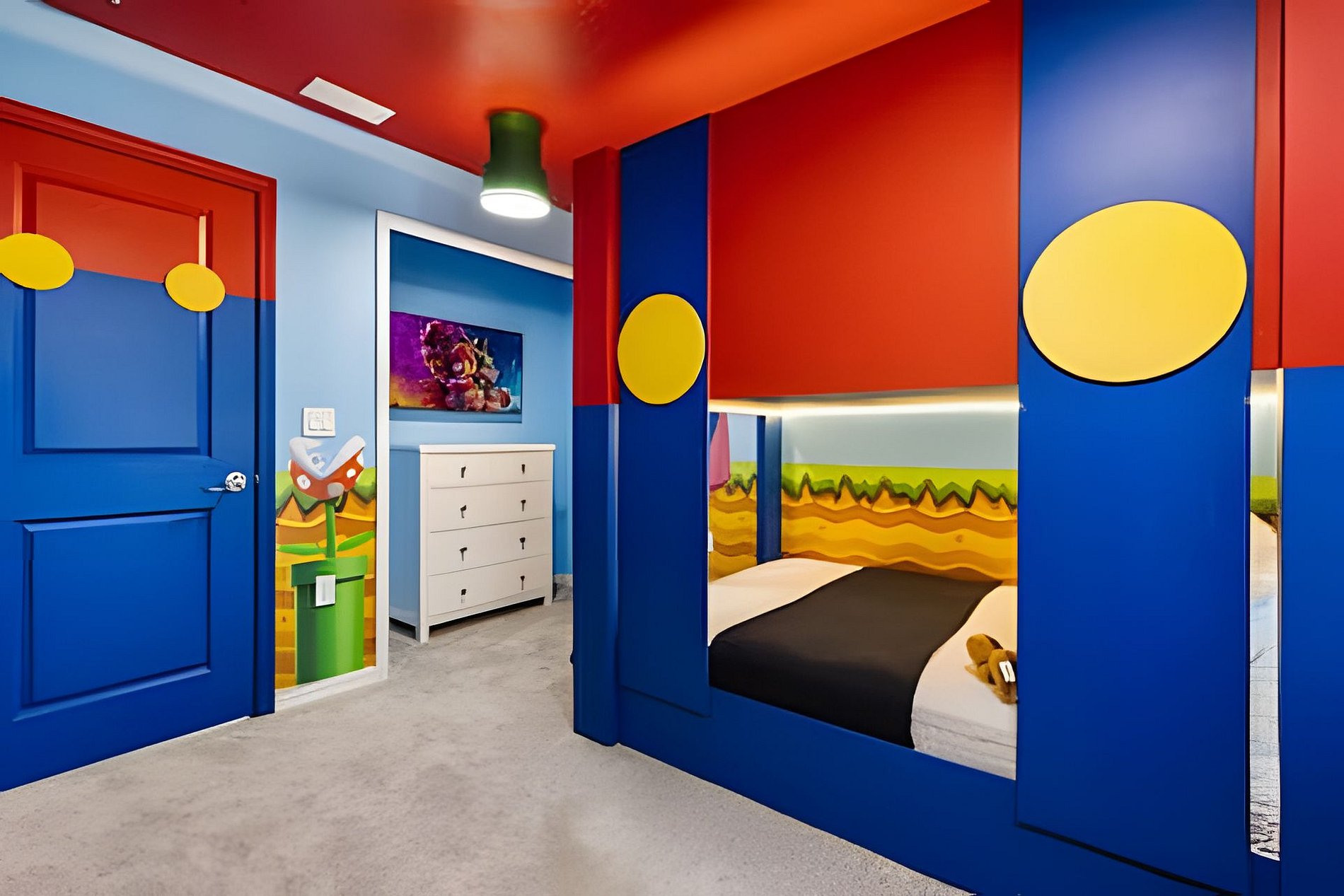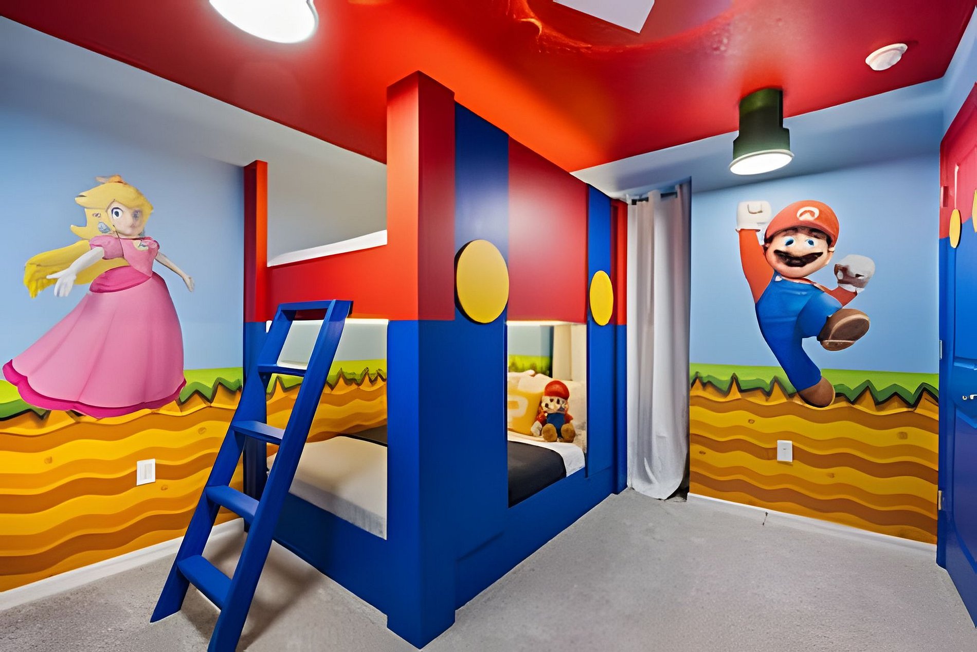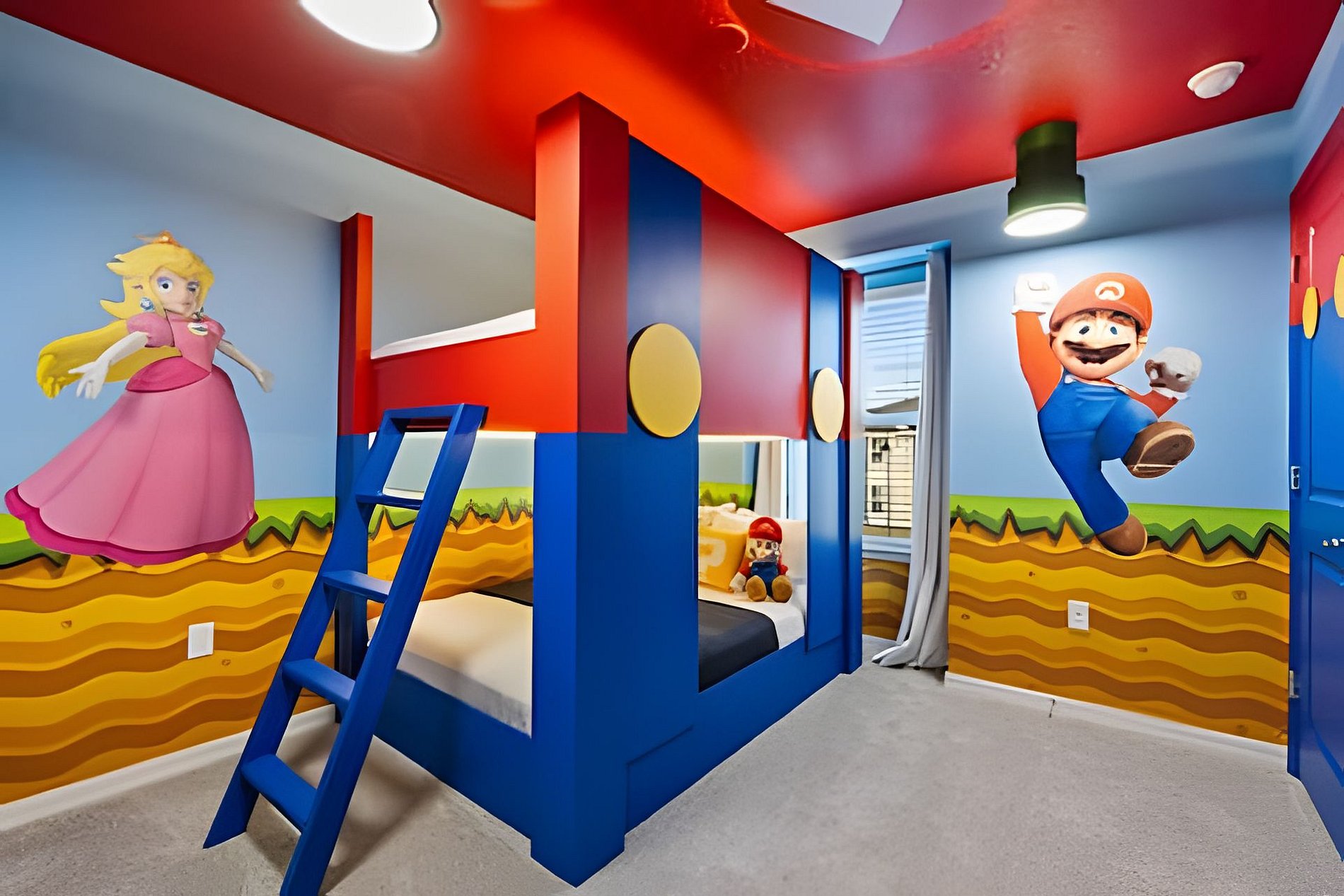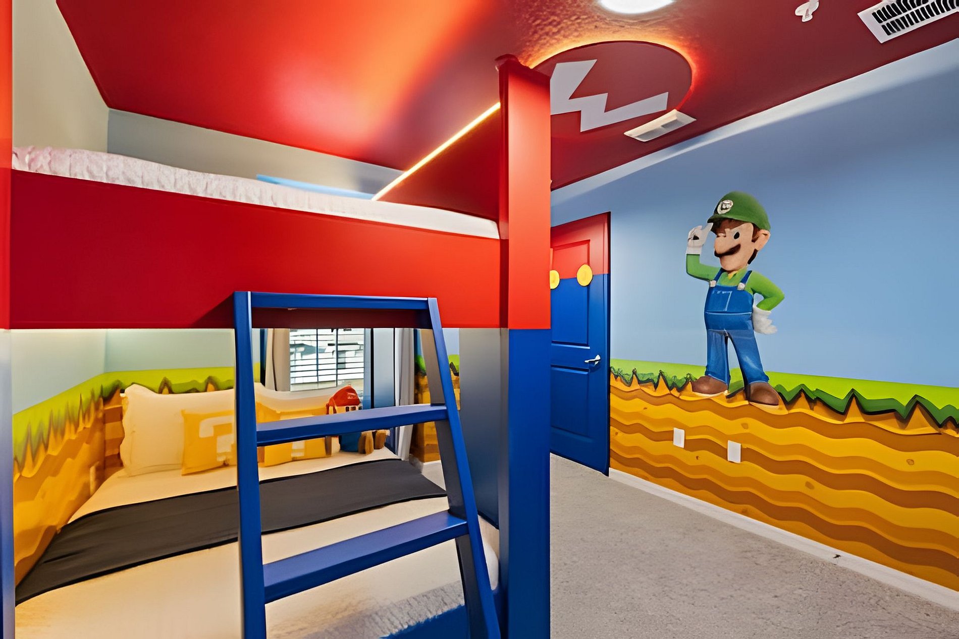 BED CONFIGURATION: 1ST FLOOR Bedroom 1: With Queen Bed; 1 Social bathroom 1 Half bathroom in the outdoor area 2ND FLOOR Bedroom 2: With a King Bed, suite; Bedroom 3: With a King Bed, suite; Bedroom 4: Bunk Bed with two Full Beds, Tangled; Bedroom 5: Bunk Bed with two Full Beds, Mario Bros; 1 Social bathroom THIS HOUSE HAS 02 COMPLETE SUITES. *Central AC *Private Door Code for Each Guest Stay *Fully Equipped Kitchen *Washer & Dryer *Towels & Linens Provided *Washcloths Are Not Provided *Hair Dryers, Iron & Ironing Board *TV in Every Bedroom *Family Room with Flat Screen TV *Free Cable TV & WiFi *Private Screened-in Pool + Child Safety Pool Fence *Outdoor Patio Furniture with Sun Loungers *Pack ’n Play / High Chair (Free Upon Request)