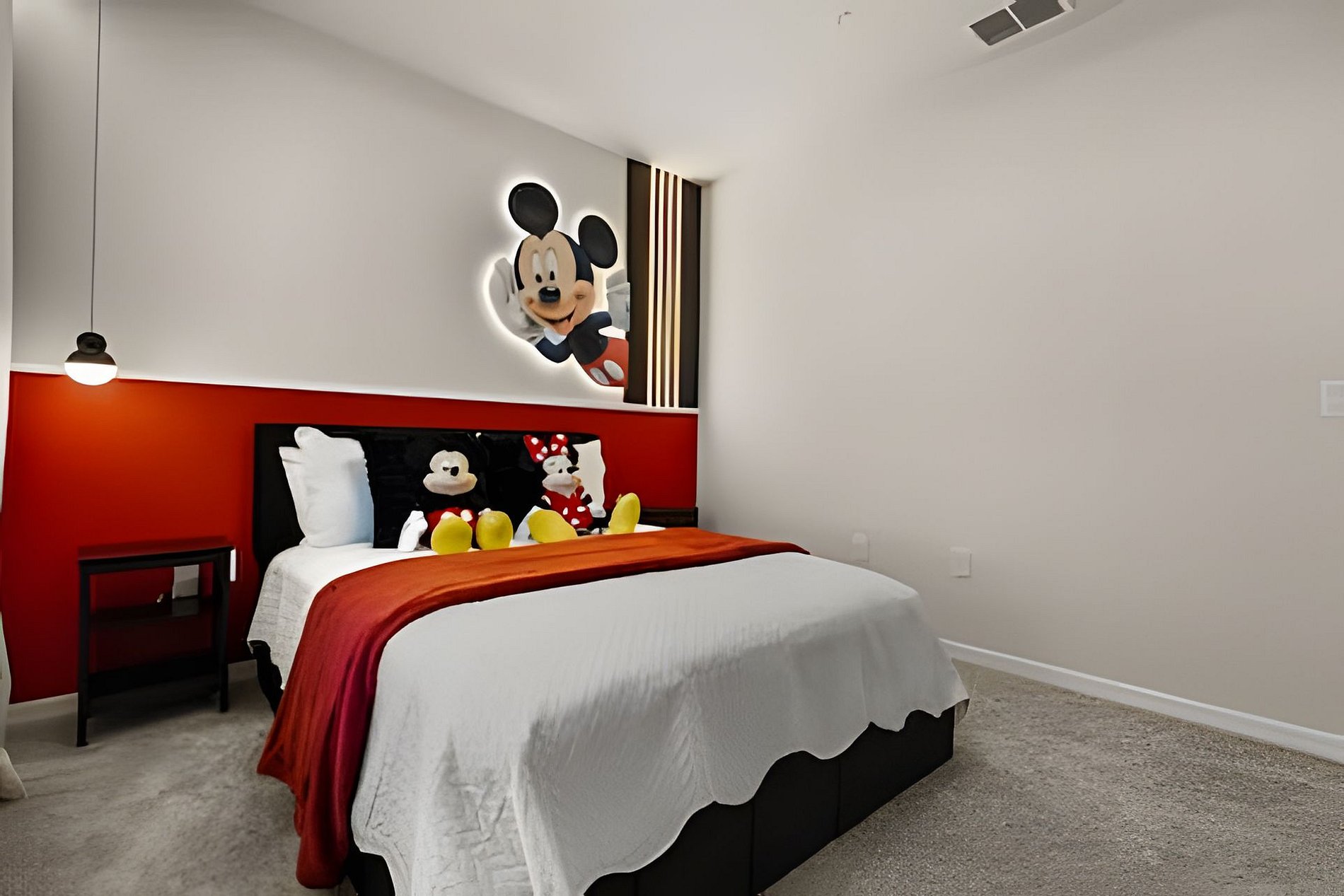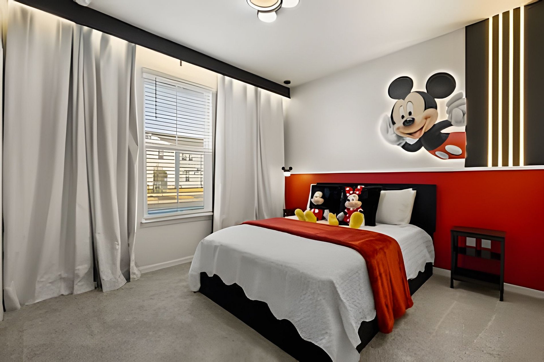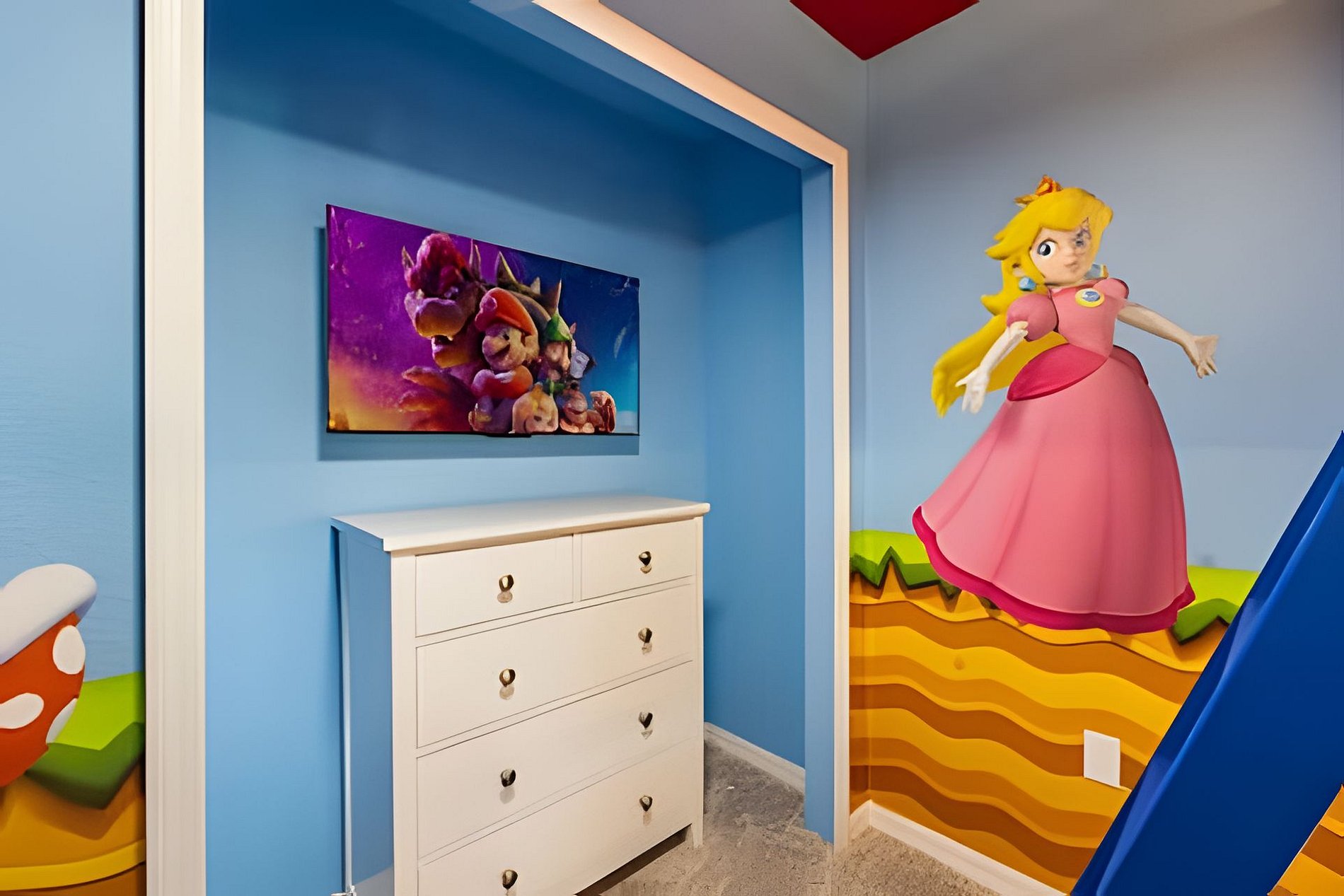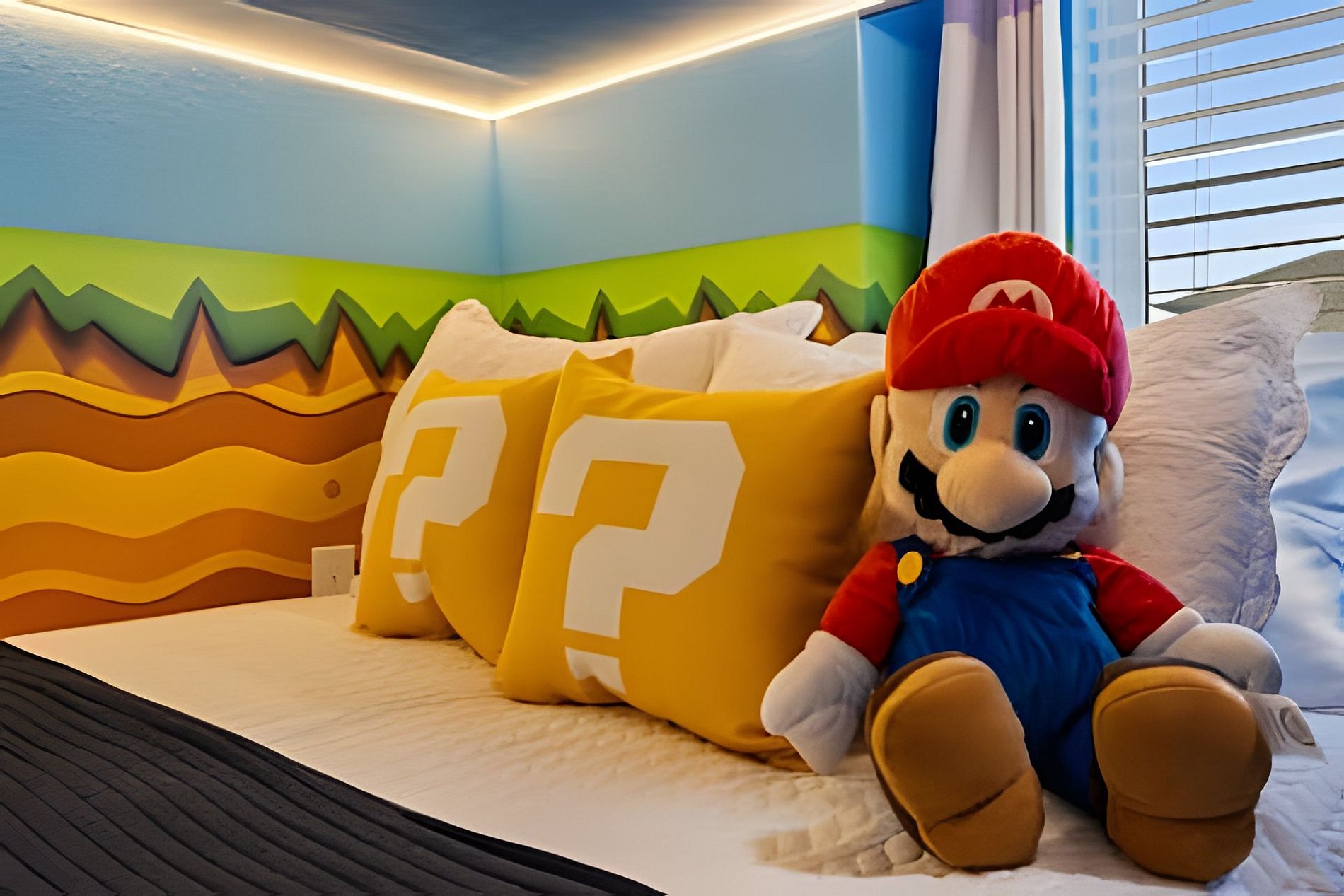 BED CONFIGURATION: 1ST FLOOR Bedroom 1: With Queen Bed; 1 Social bathroom 1 Half bathroom in the outdoor area 2ND FLOOR Bedroom 2: With a King Bed, suite; Bedroom 3: With a King Bed, suite; Bedroom 4: Bunk Bed with two Full Beds, Tangled; Bedroom 5: Bunk Bed with two Full Beds, Mario Bros; 1 Social bathroom THIS HOUSE HAS 02 COMPLETE SUITES. *Central AC *Private Door Code for Each Guest Stay *Fully Equipped Kitchen *Washer & Dryer *Towels & Linens Provided *Washcloths Are Not Provided *Hair Dryers, Iron & Ironing Board *TV in Every Bedroom *Family Room with Flat Screen TV *Free Cable TV & WiFi *Private Screened-in Pool + Child Safety Pool Fence *Outdoor Patio Furniture with Sun Loungers *Pack ’n Play / High Chair (Free Upon Request)