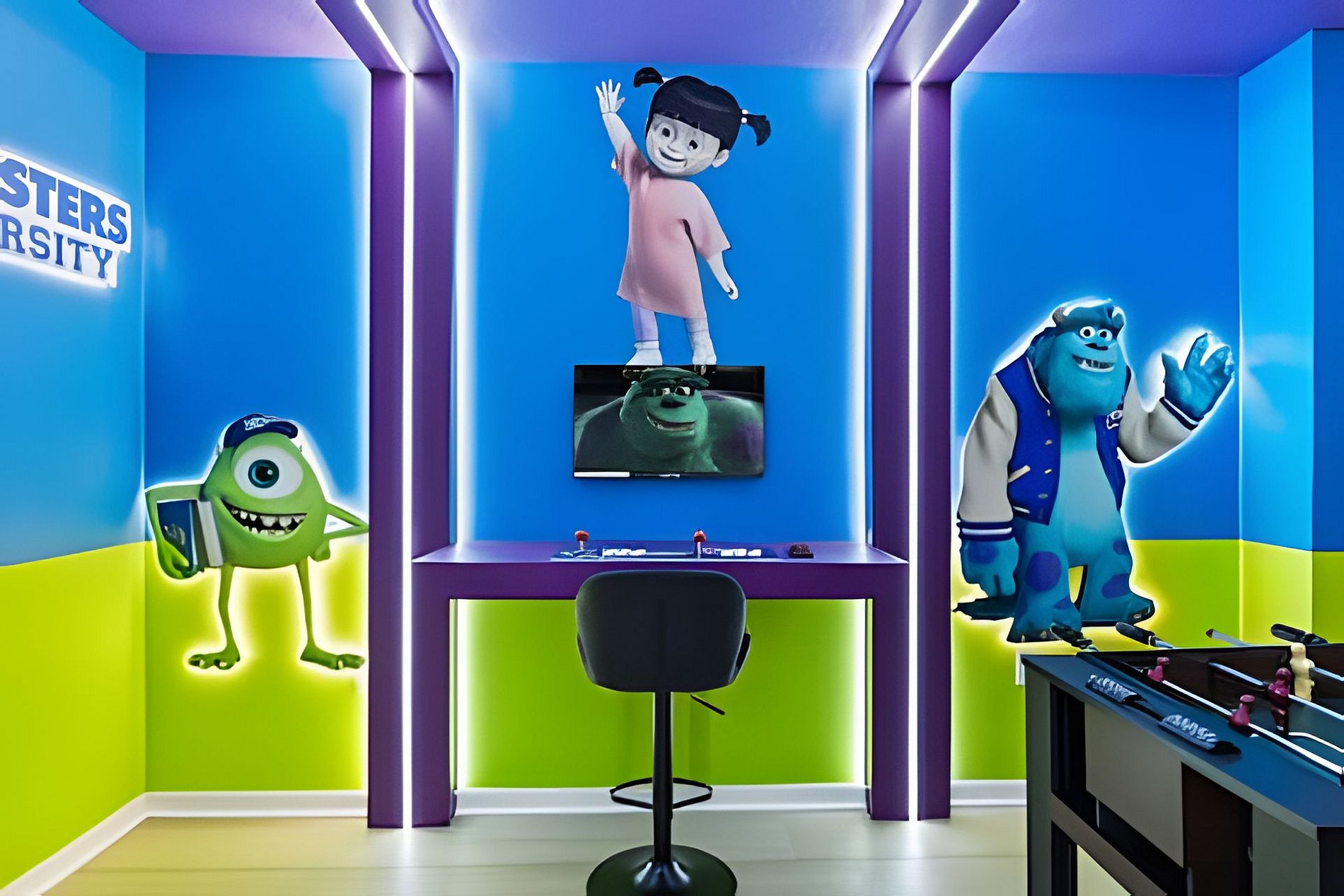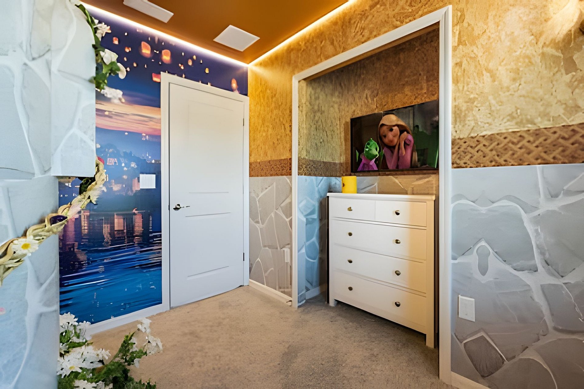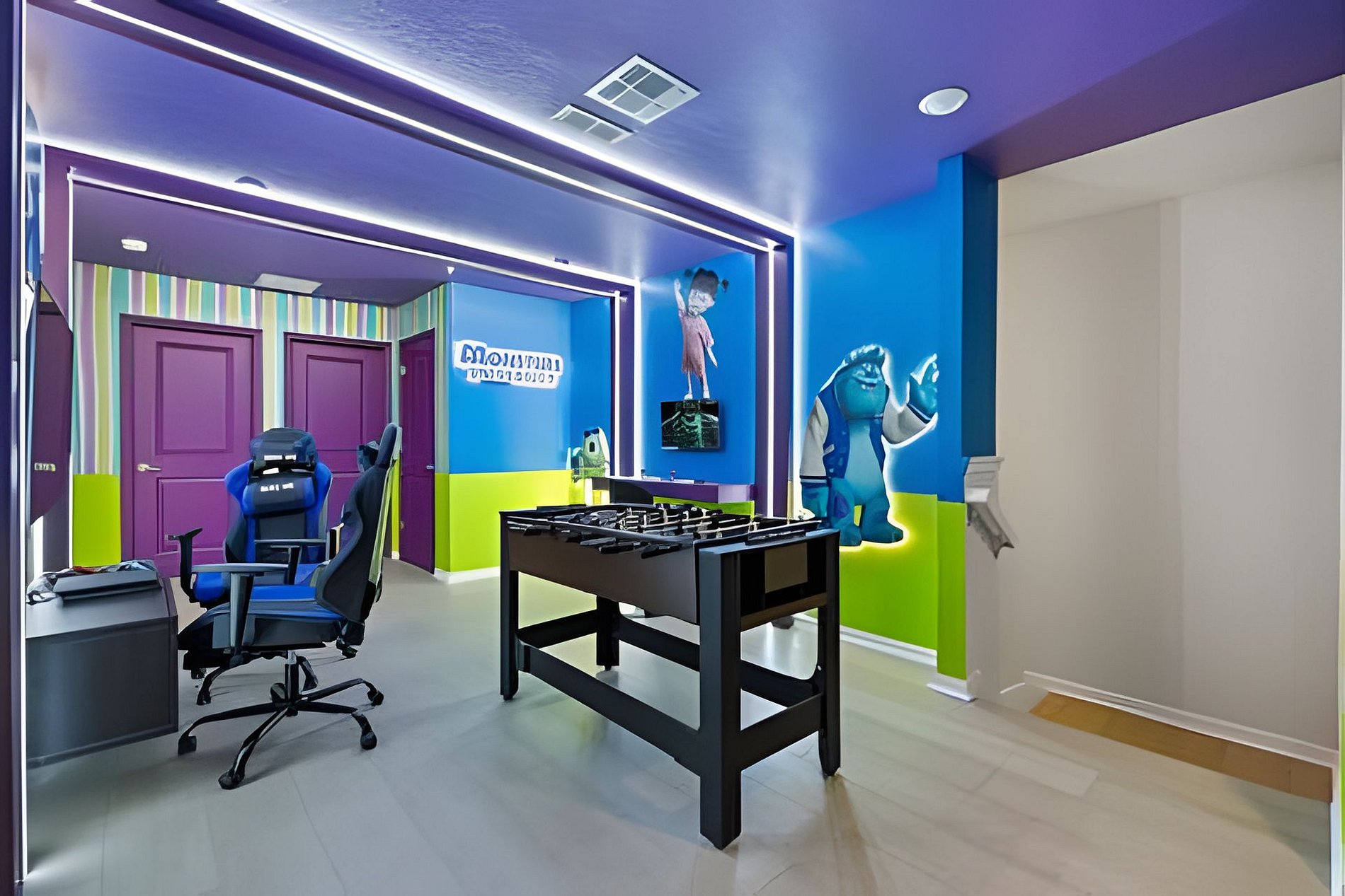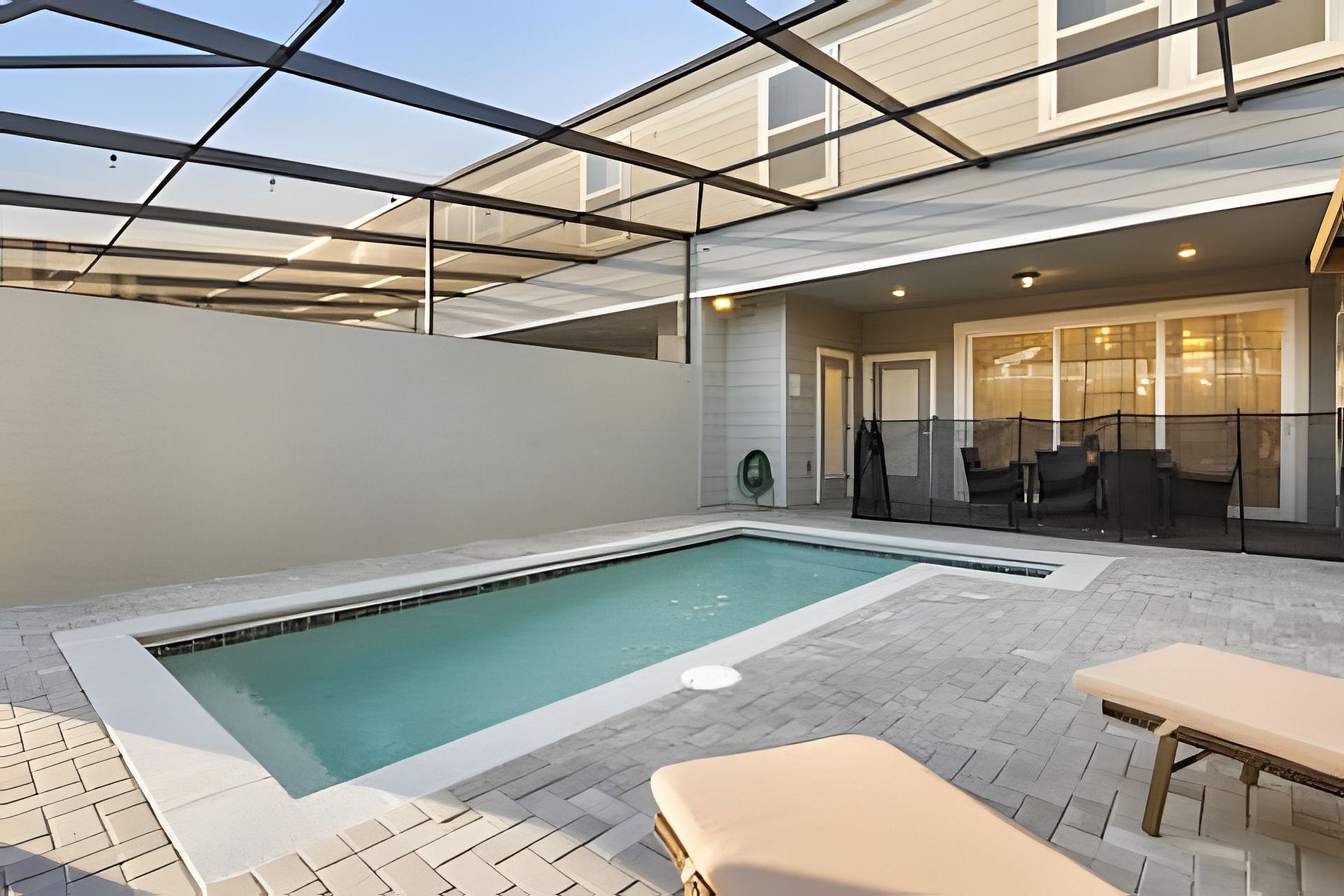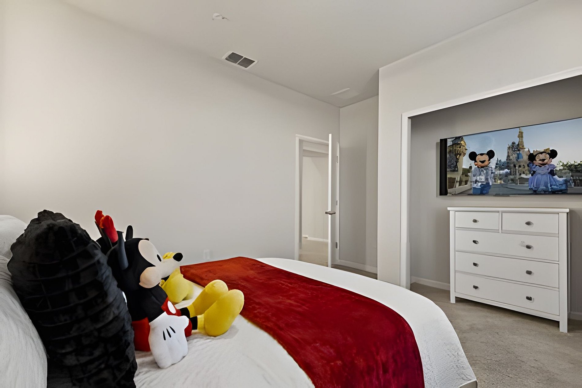 BED CONFIGURATION: 1ST FLOOR Bedroom 1: With Queen Bed; 1 Social bathroom 1 Half bathroom in the outdoor area 2ND FLOOR Bedroom 2: With a King Bed, suite; Bedroom 3: With a King Bed, suite; Bedroom 4: Bunk Bed with two Full Beds, Tangled; Bedroom 5: Bunk Bed with two Full Beds, Mario Bros; 1 Social bathroom THIS HOUSE HAS 02 COMPLETE SUITES. *Central AC *Private Door Code for Each Guest Stay *Fully Equipped Kitchen *Washer & Dryer *Towels & Linens Provided *Washcloths Are Not Provided *Hair Dryers, Iron & Ironing Board *TV in Every Bedroom *Family Room with Flat Screen TV *Free Cable TV & WiFi *Private Screened-in Pool + Child Safety Pool Fence *Outdoor Patio Furniture with Sun Loungers *Pack ’n Play / High Chair (Free Upon Request)