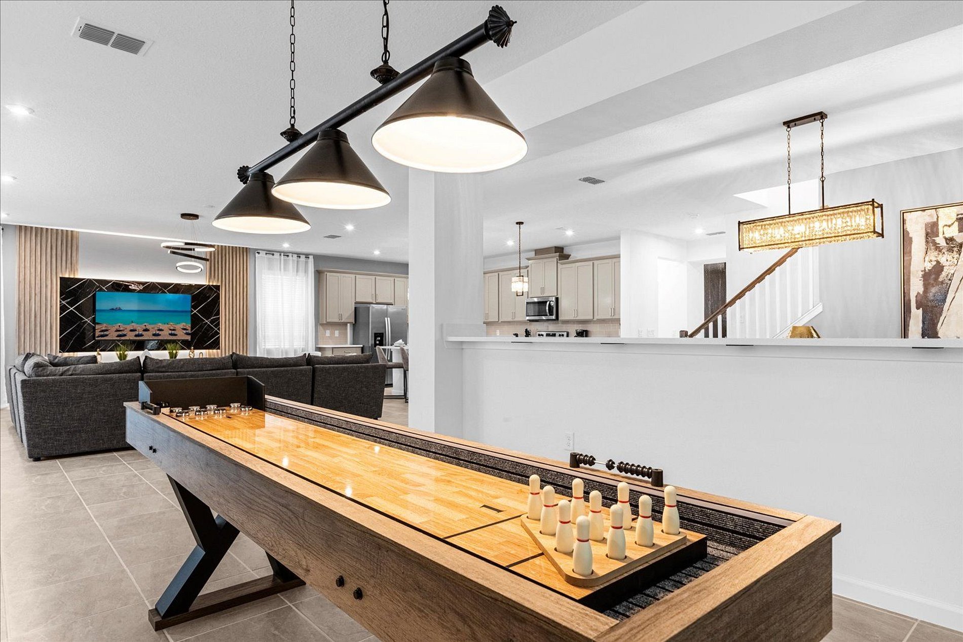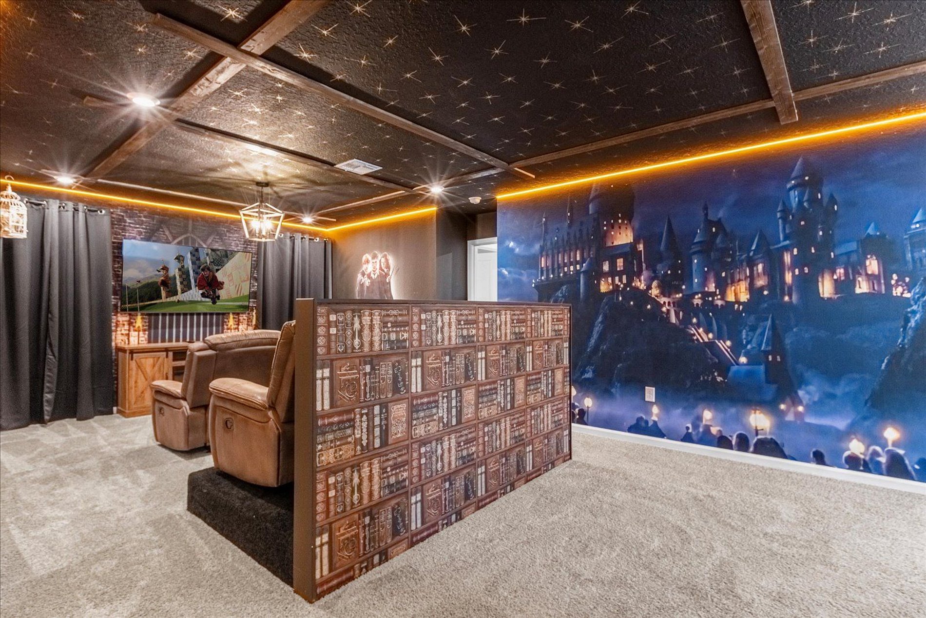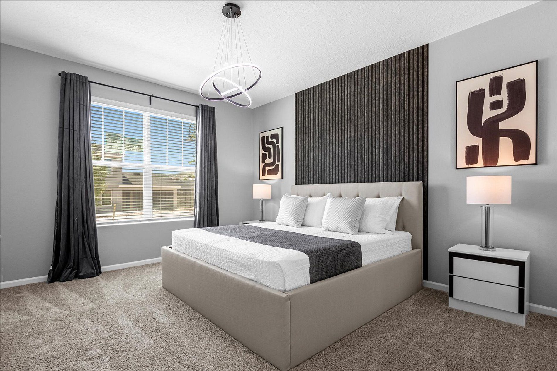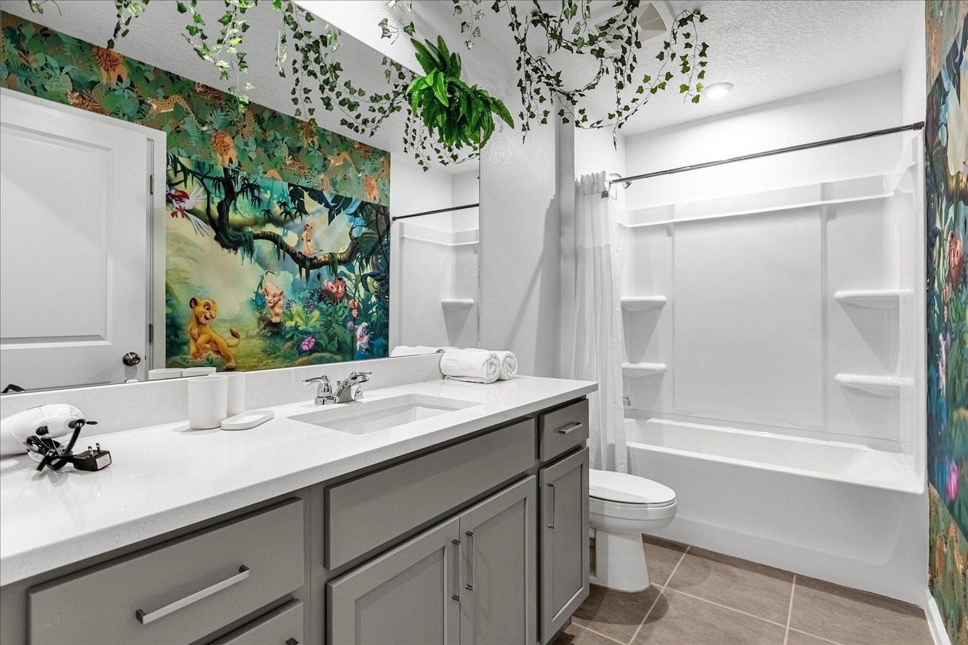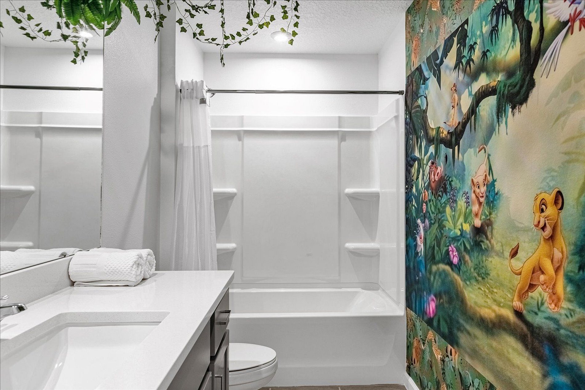 This 9-bedroom house, located in Solara Resort, features 8 themed suites decorated with motifs such as Minions, Toy Story, and Frozen, along with 6 bathrooms, accommodating up to 22 people. Enjoy entertainment with a private cinema, where you can watch movies in style. Challenge your friends and family to a game of table bowling and relax in the private pool while enjoying the Florida sun. With ample lounge space and a refreshing poolside atmosphere, relaxation comes naturally.