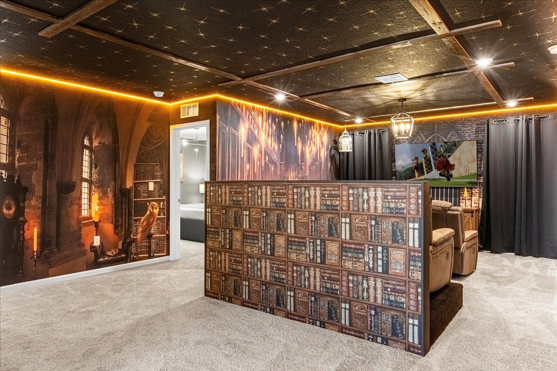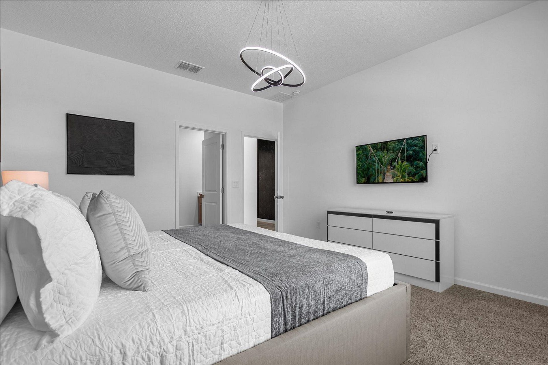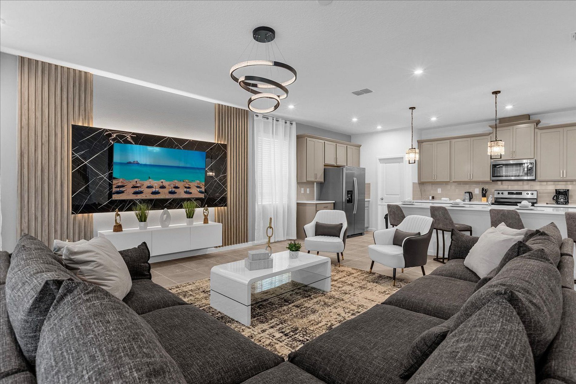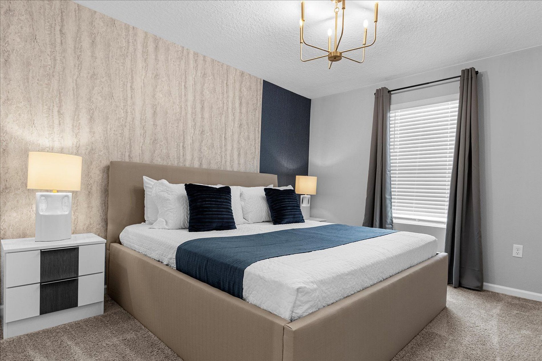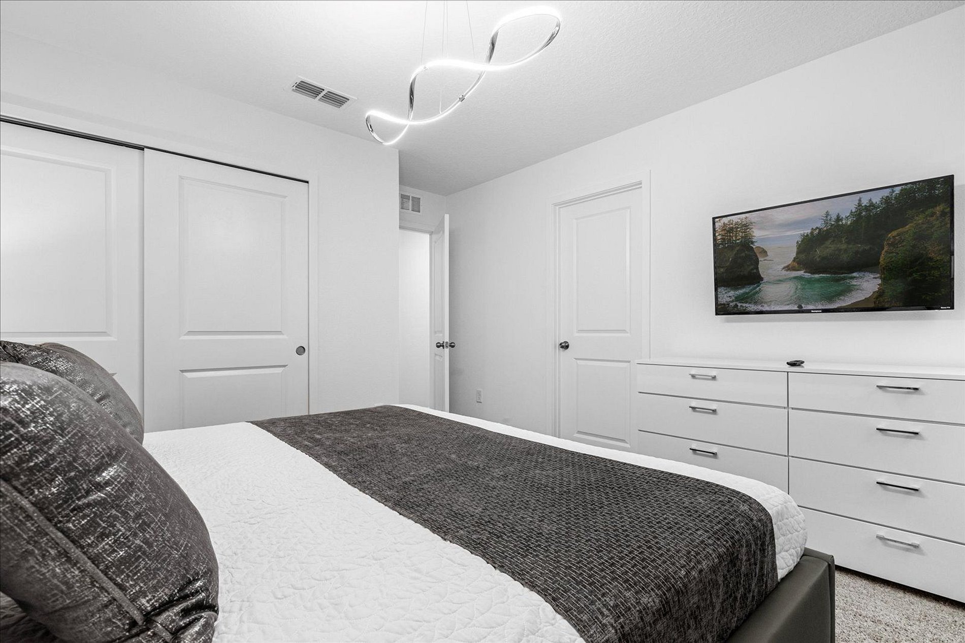 This 9-bedroom house, located in Solara Resort, features 8 themed suites decorated with motifs such as Minions, Toy Story, and Frozen, along with 6 bathrooms, accommodating up to 22 people. Enjoy entertainment with a private cinema, where you can watch movies in style. Challenge your friends and family to a game of table bowling and relax in the private pool while enjoying the Florida sun. With ample lounge space and a refreshing poolside atmosphere, relaxation comes naturally.