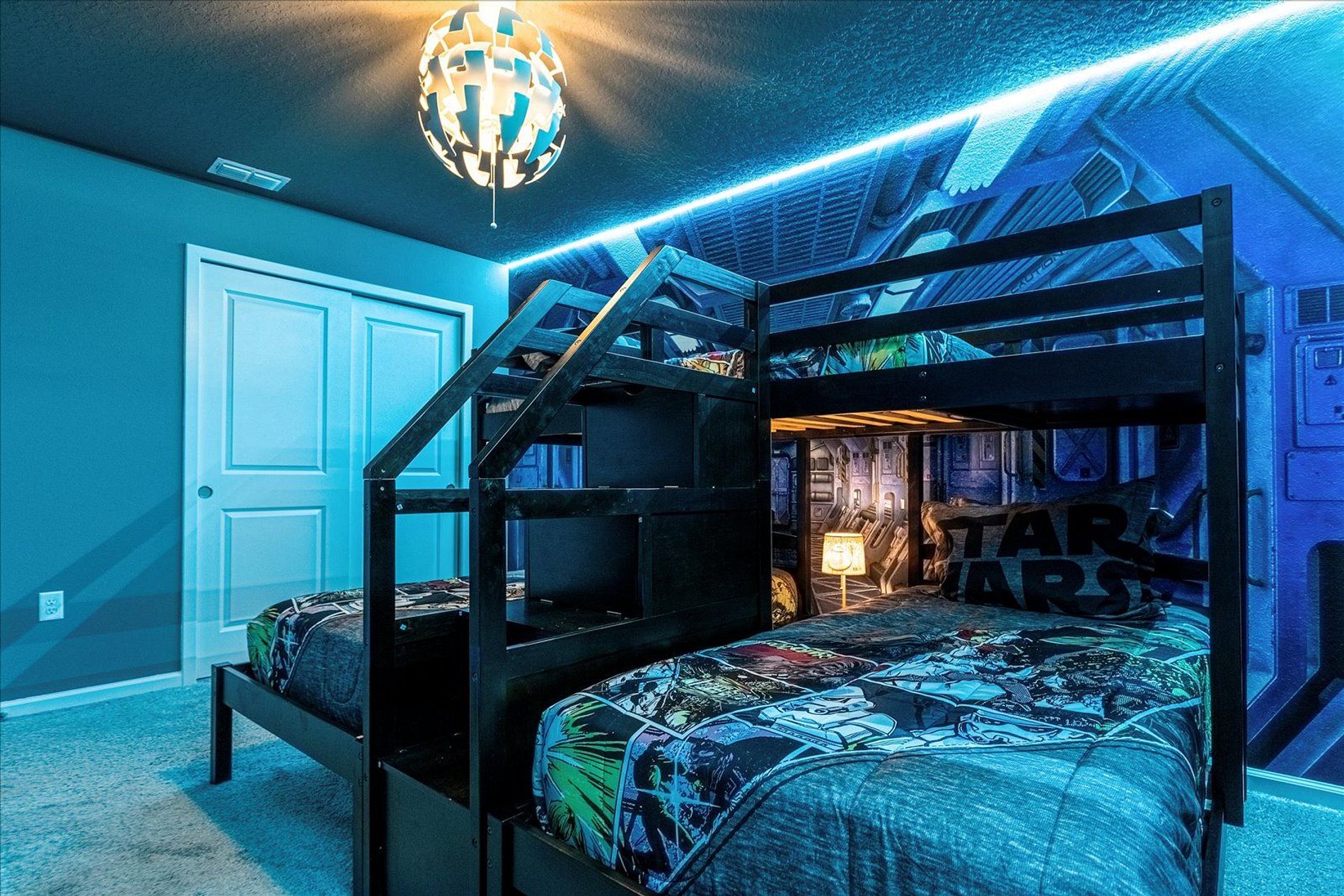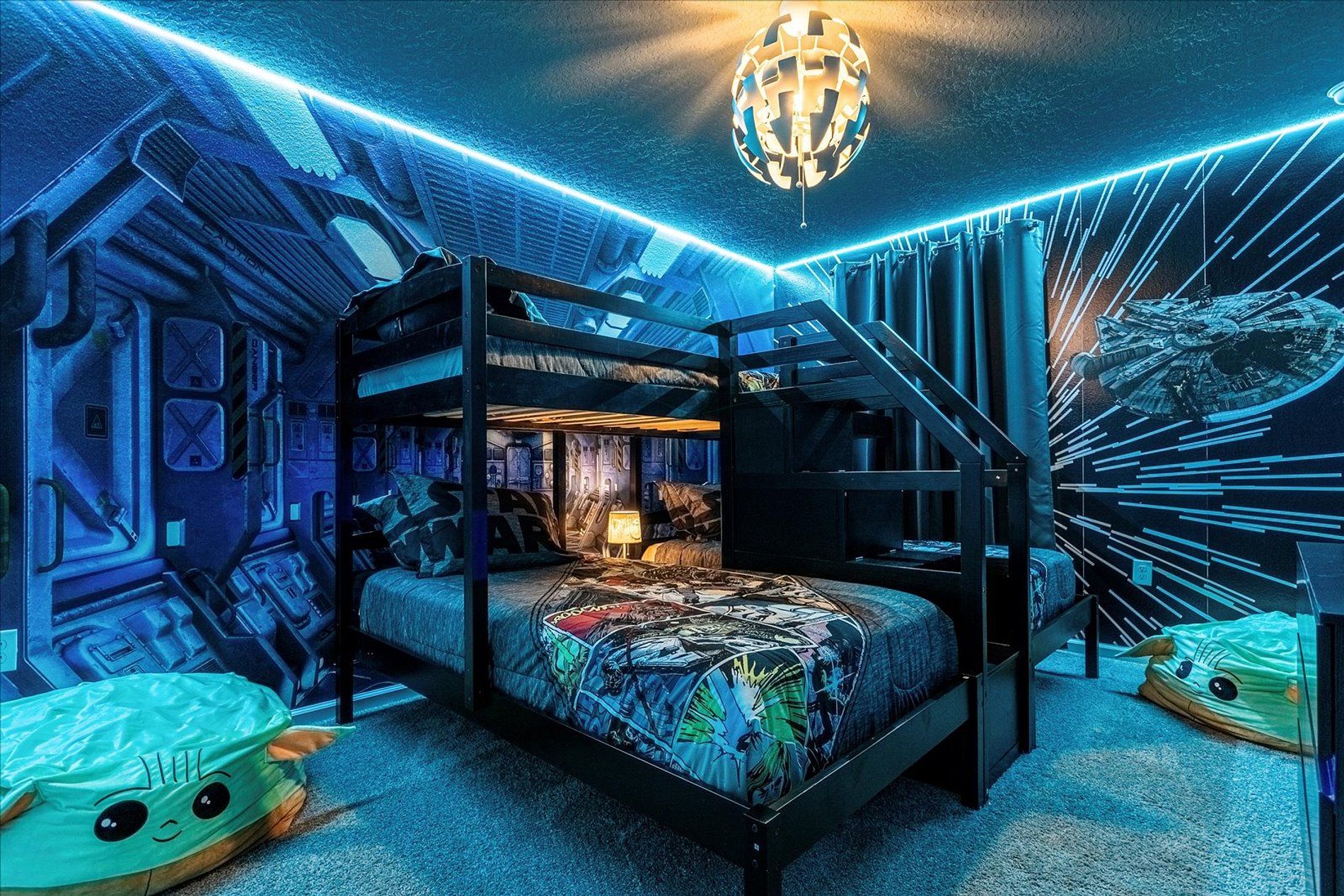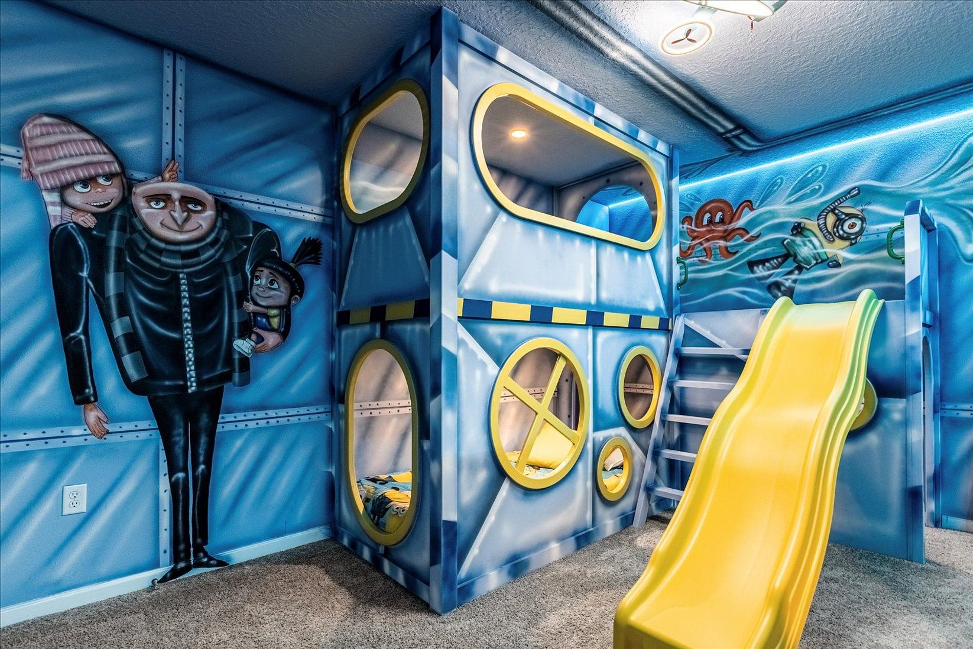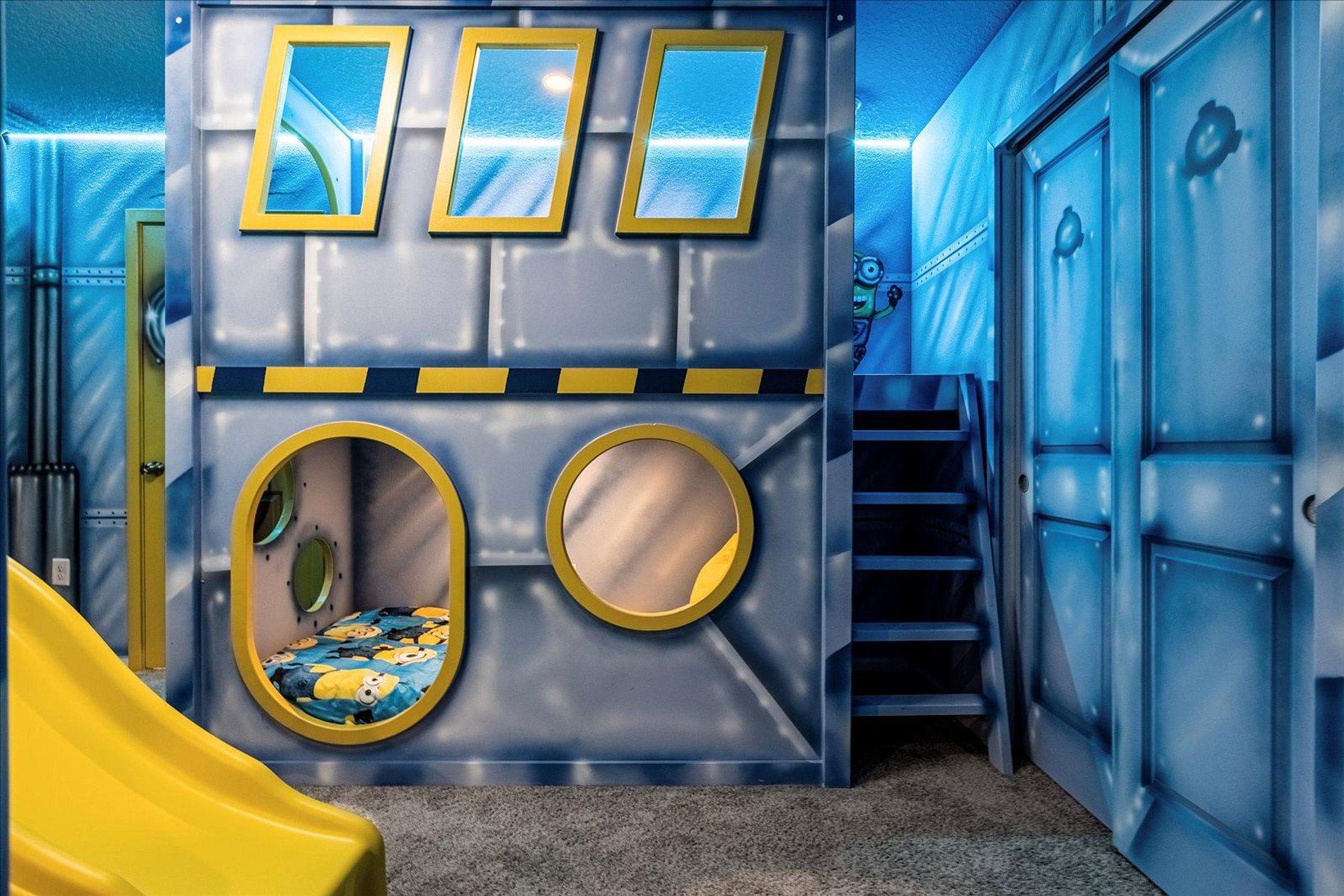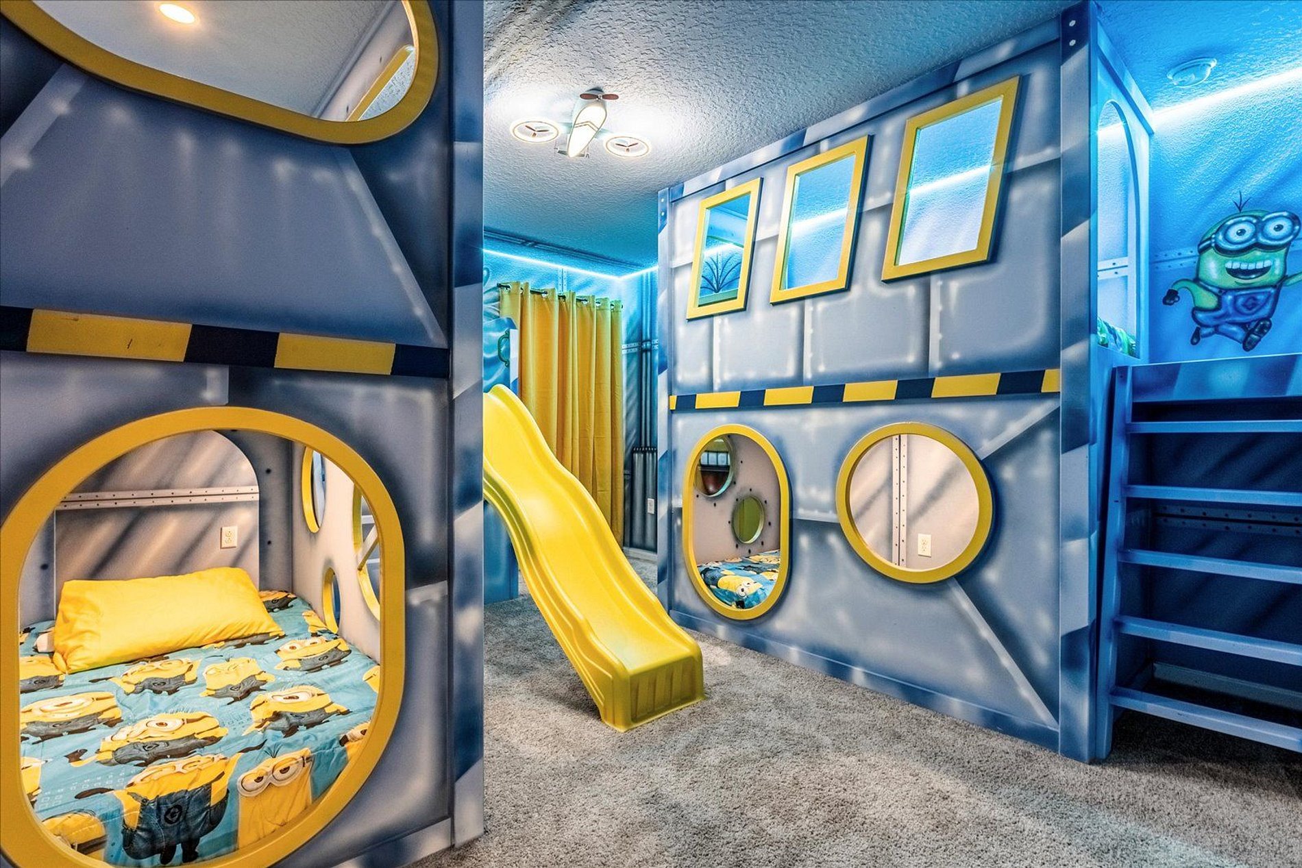 1st Floor -1 bedroom with Queen bed - suite. 2nd Floor -1 bedroom with a King bed - shared suite. -1 bedroom with two twin beds (Frozen theme) - shared suite. -1 bedroom with a bunk bed, totaling 3 twin beds (Star Wars theme) -1 bedroom with a King bed - suite. -1 bedroom with a King bed - shared suite. -1 bedroom with 3 twin beds (Toy Story theme) - shared suite (Room -connected by a tunnel). -1 bedroom with 2 bunk beds, totaling 4 twin beds (Minions theme) - shared -suite (Room connected by a tunnel). -1 bedroom with a King bed - shared suite. This house has 2 full suites and 6 shared suites.