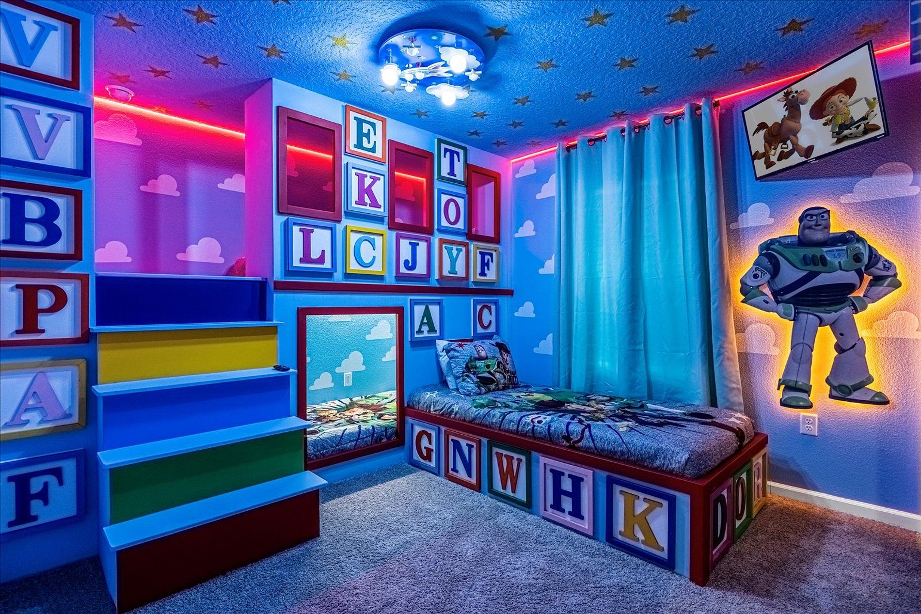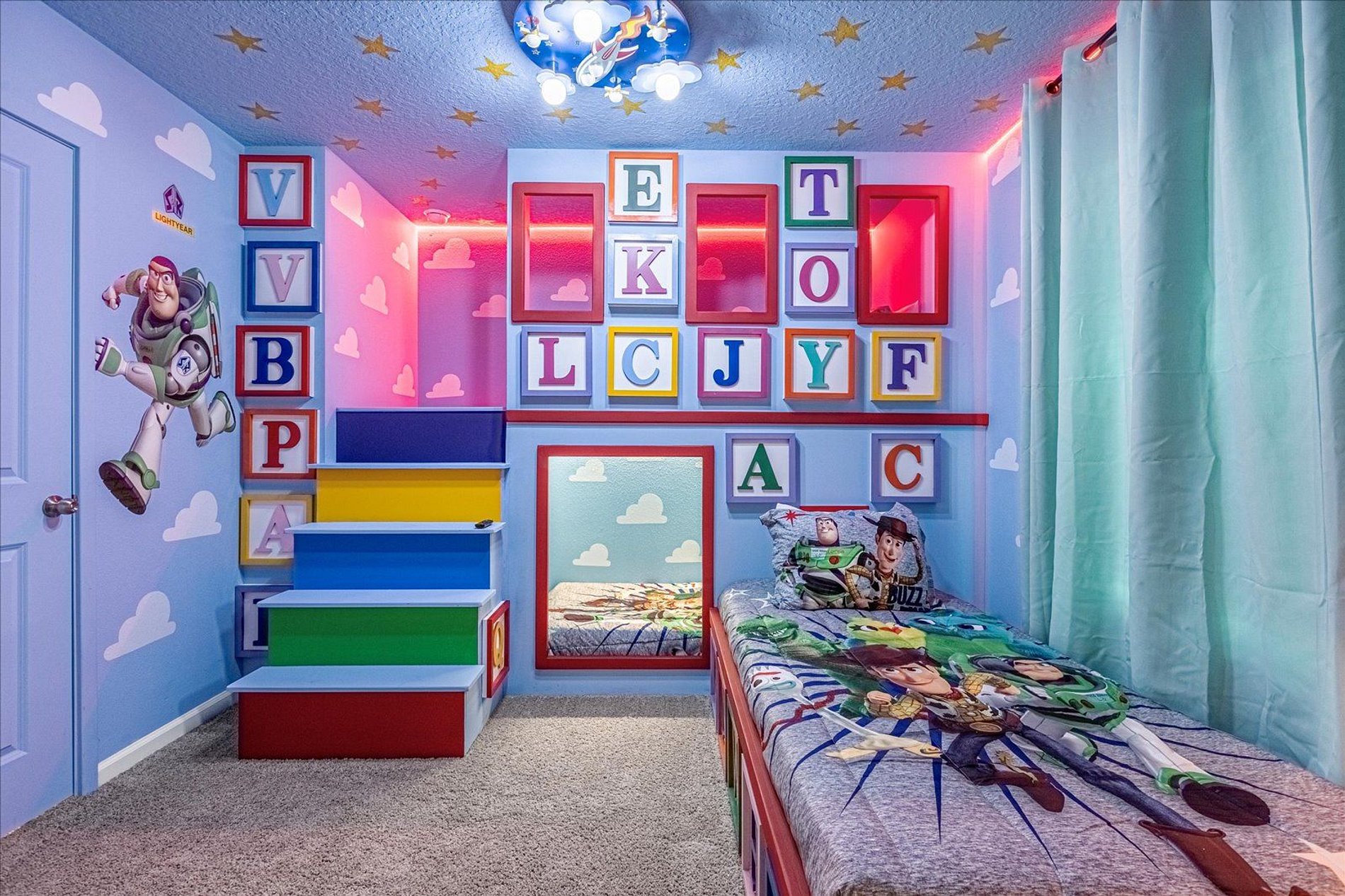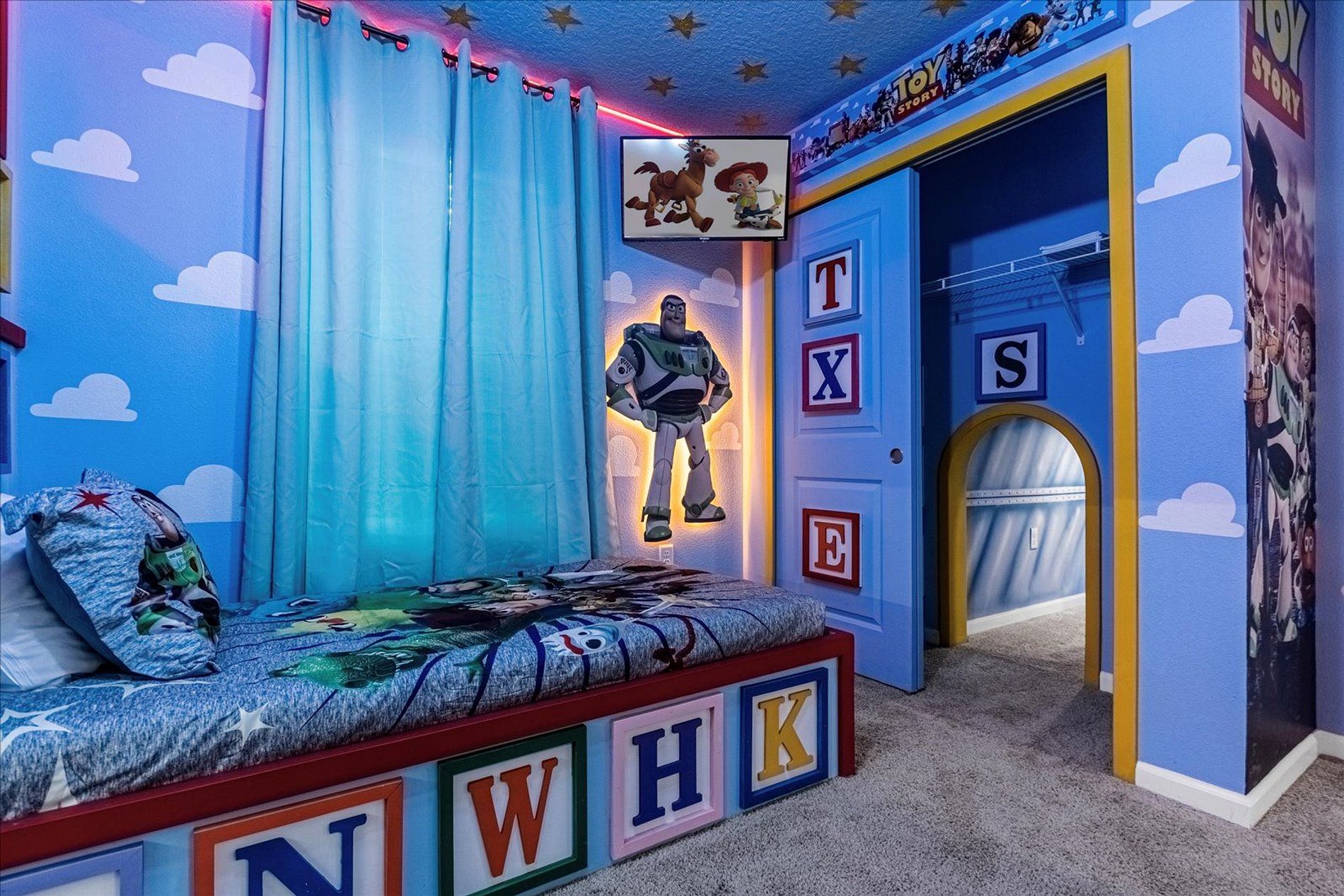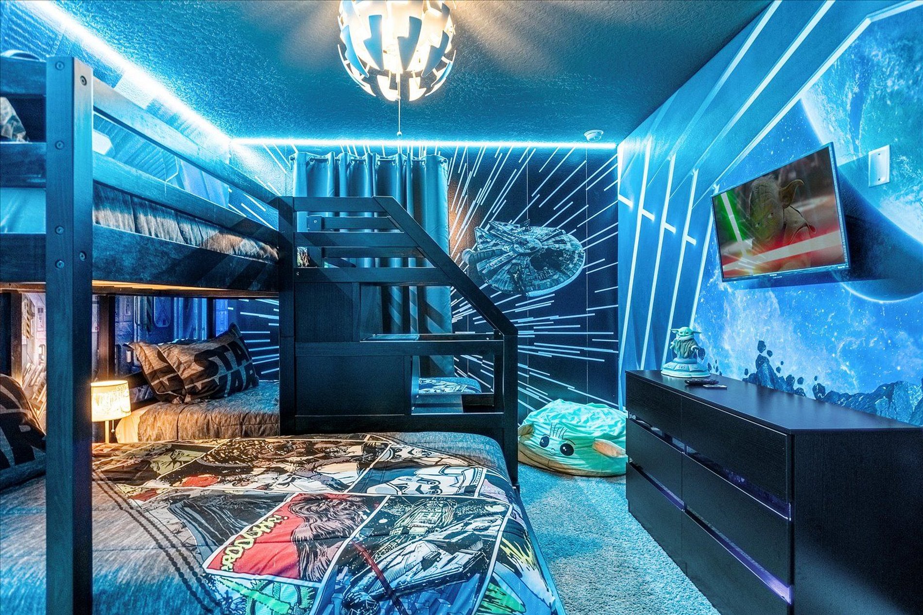 1st Floor -1 bedroom with Queen bed - suite. 2nd Floor -1 bedroom with a King bed - shared suite. -1 bedroom with two twin beds (Frozen theme) - shared suite. -1 bedroom with a bunk bed, totaling 3 twin beds (Star Wars theme) -1 bedroom with a King bed - suite. -1 bedroom with a King bed - shared suite. -1 bedroom with 3 twin beds (Toy Story theme) - shared suite (Room -connected by a tunnel). -1 bedroom with 2 bunk beds, totaling 4 twin beds (Minions theme) - shared -suite (Room connected by a tunnel). -1 bedroom with a King bed - shared suite. This house has 2 full suites and 6 shared suites.