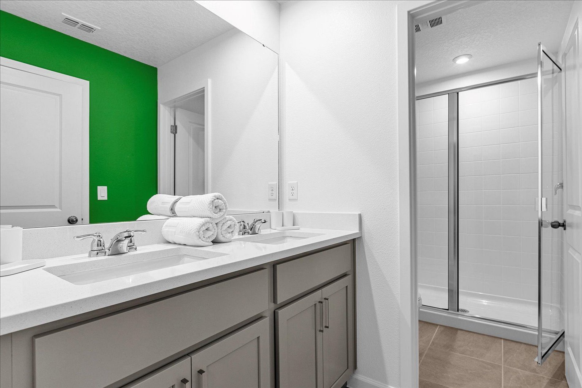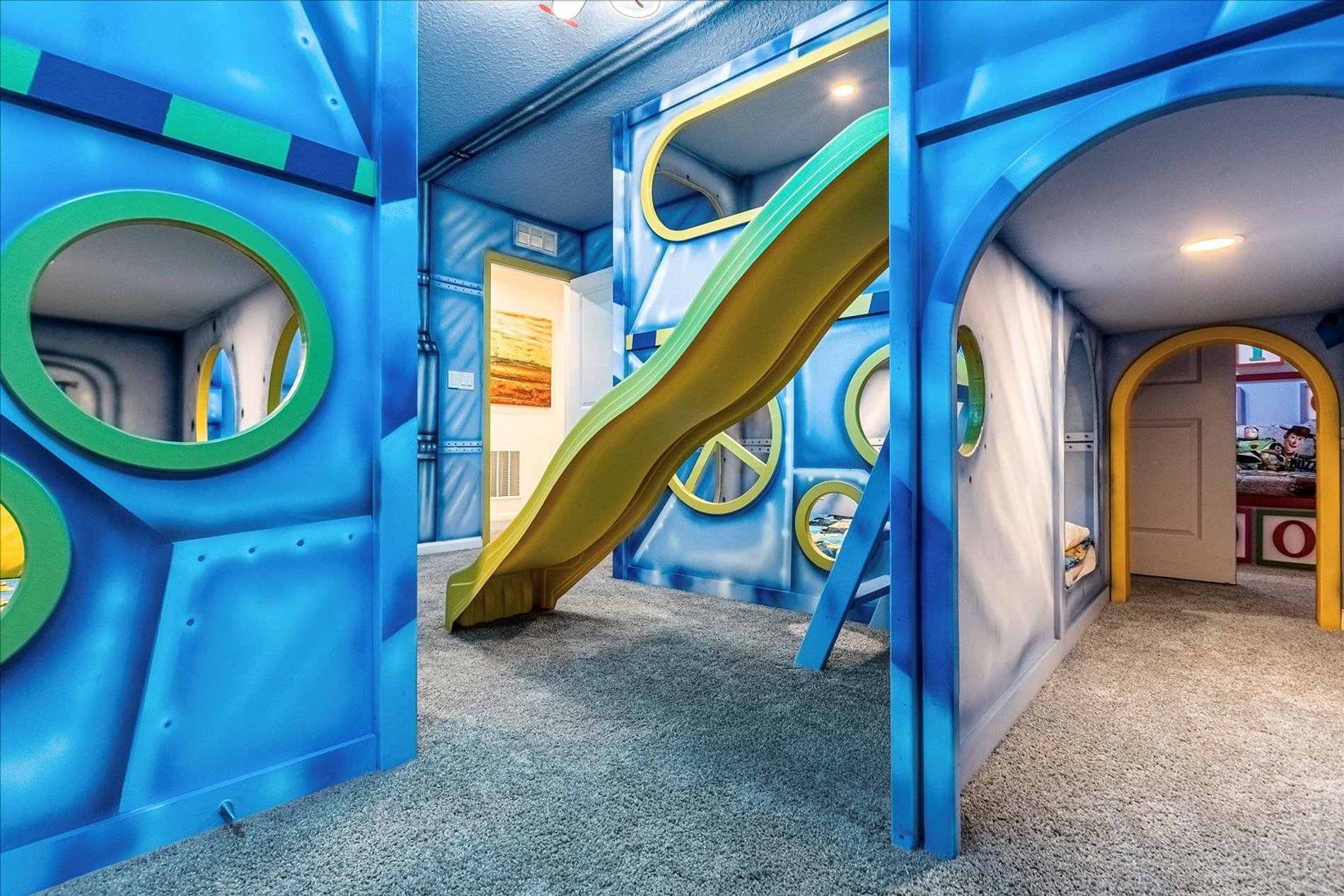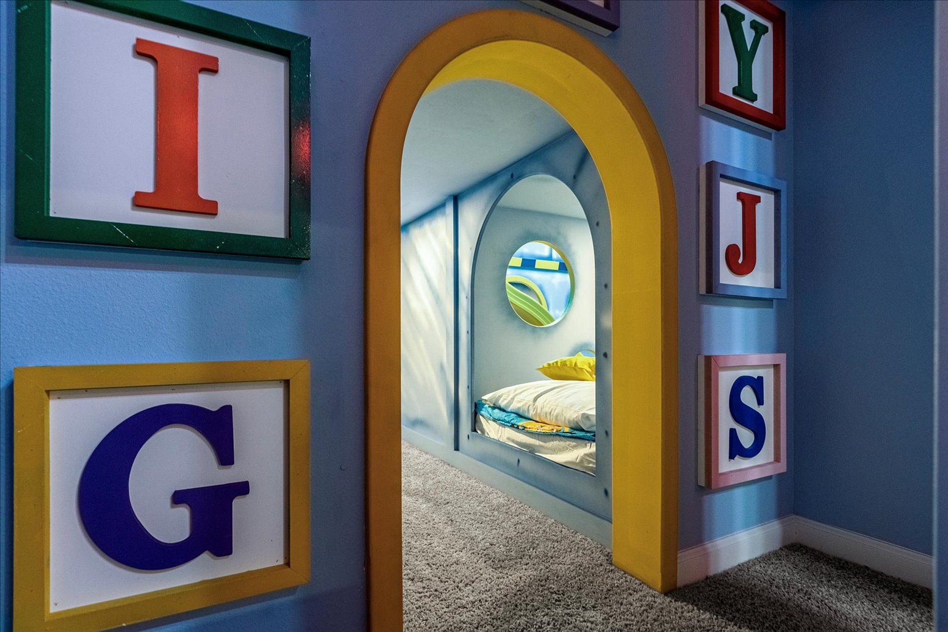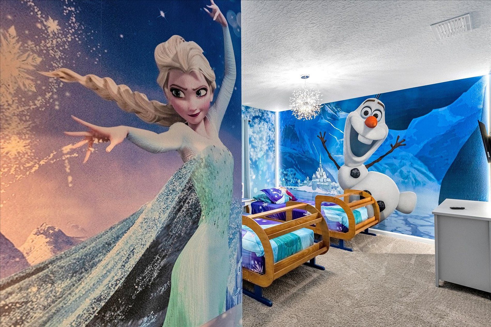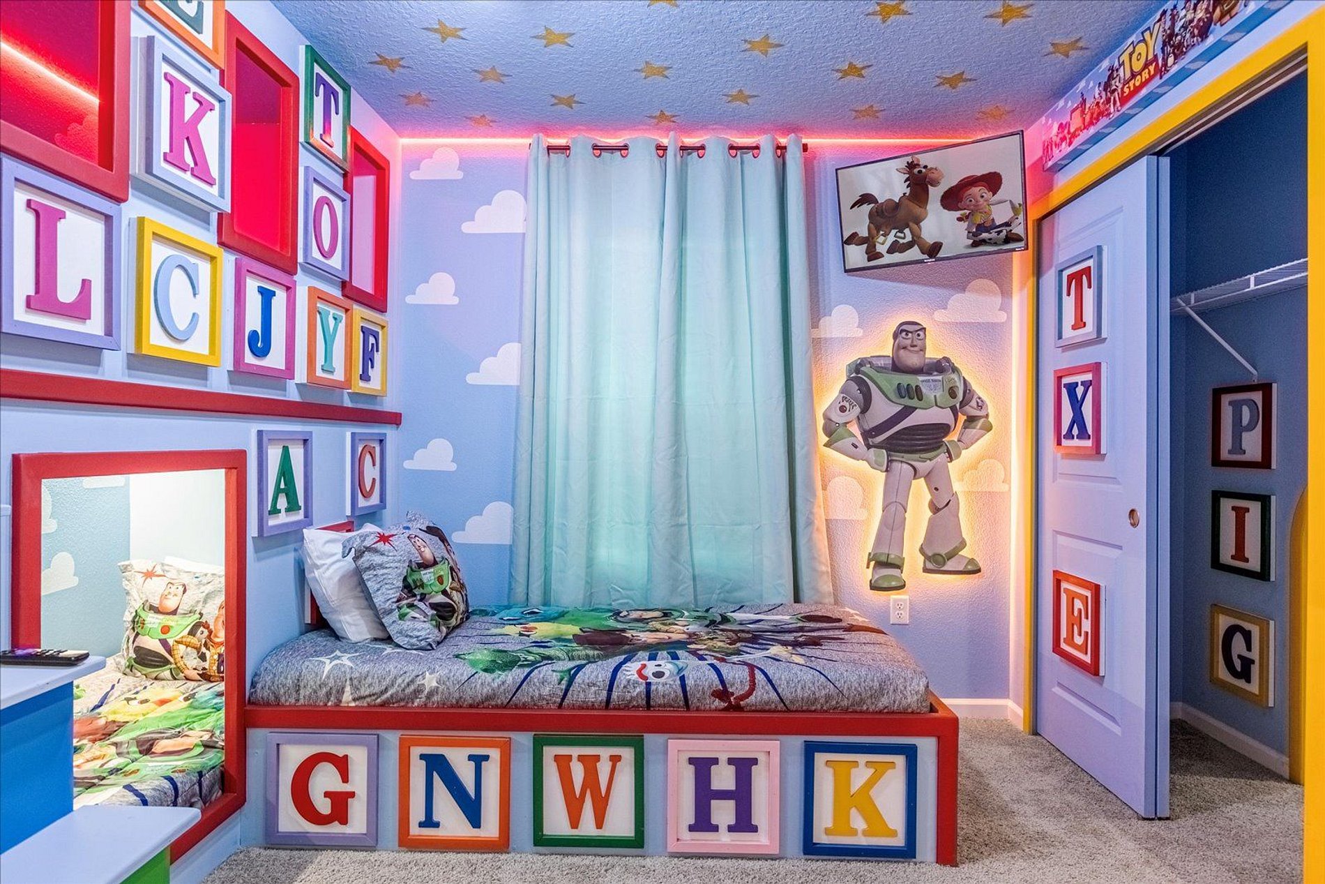 1st Floor -1 bedroom with Queen bed - suite. 2nd Floor -1 bedroom with a King bed - shared suite. -1 bedroom with two twin beds (Frozen theme) - shared suite. -1 bedroom with a bunk bed, totaling 3 twin beds (Star Wars theme) -1 bedroom with a King bed - suite. -1 bedroom with a King bed - shared suite. -1 bedroom with 3 twin beds (Toy Story theme) - shared suite (Room -connected by a tunnel). -1 bedroom with 2 bunk beds, totaling 4 twin beds (Minions theme) - shared -suite (Room connected by a tunnel). -1 bedroom with a King bed - shared suite. This house has 2 full suites and 6 shared suites.