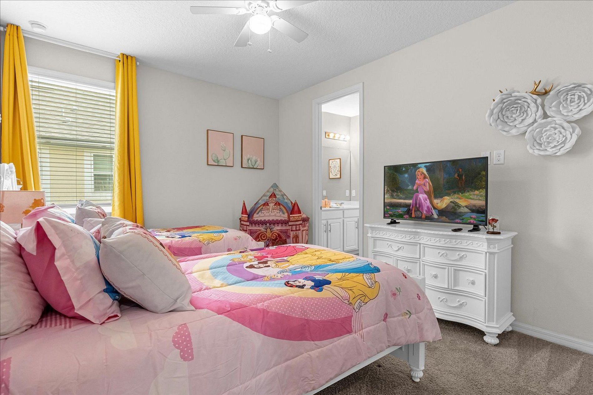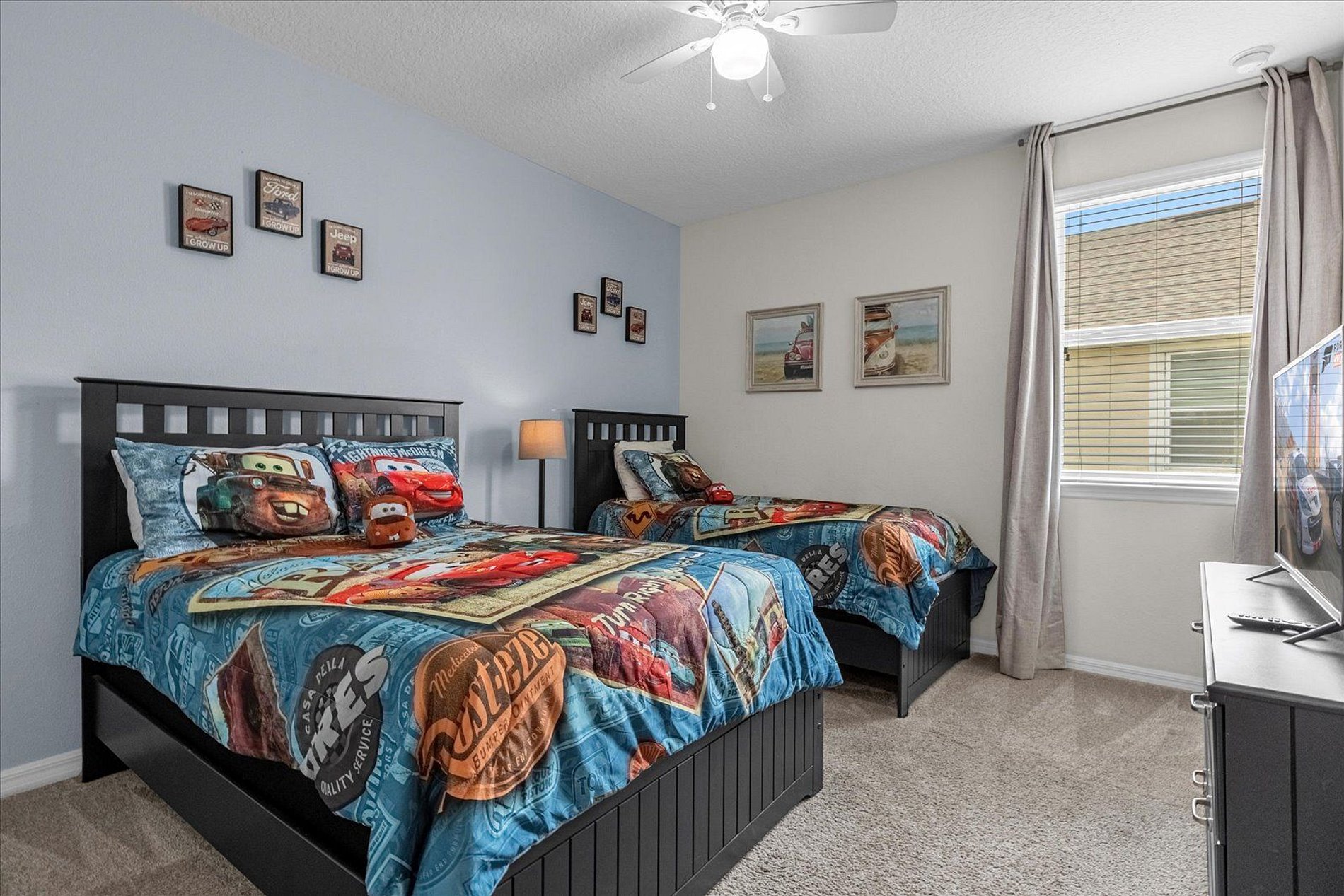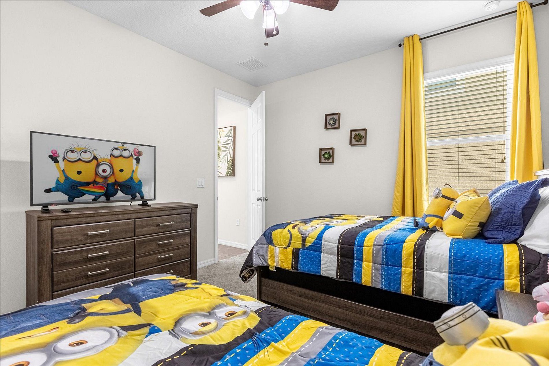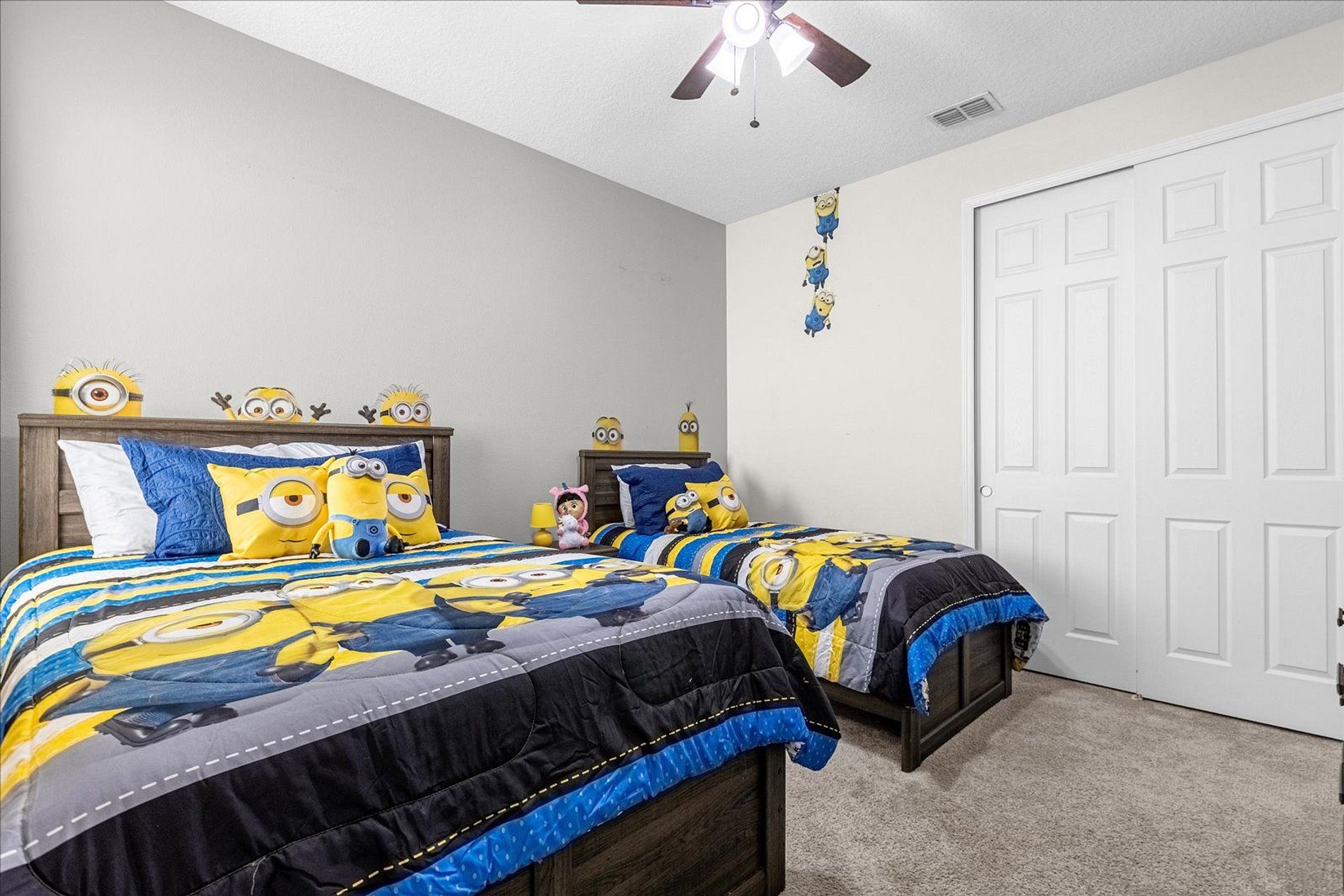 1º 1 Bedroom with 2 beds, 1 twin and 1 full, Minions theme; 1 Bedroom with a Queen bed, Suite; 2º 1 Bedroom with a King bed, Suite; 1 Bedroom with 2 single beds, Princesses theme - Shared Suite; 1 Bedroom with 1 Full bed, Shared Suite; 1 Bedroom with 2 beds, 1 twin and 1 full, Cars theme. THIS HOUSE OFFERS 2 COMPLETE SUITES AND 2 SHARED ONES.