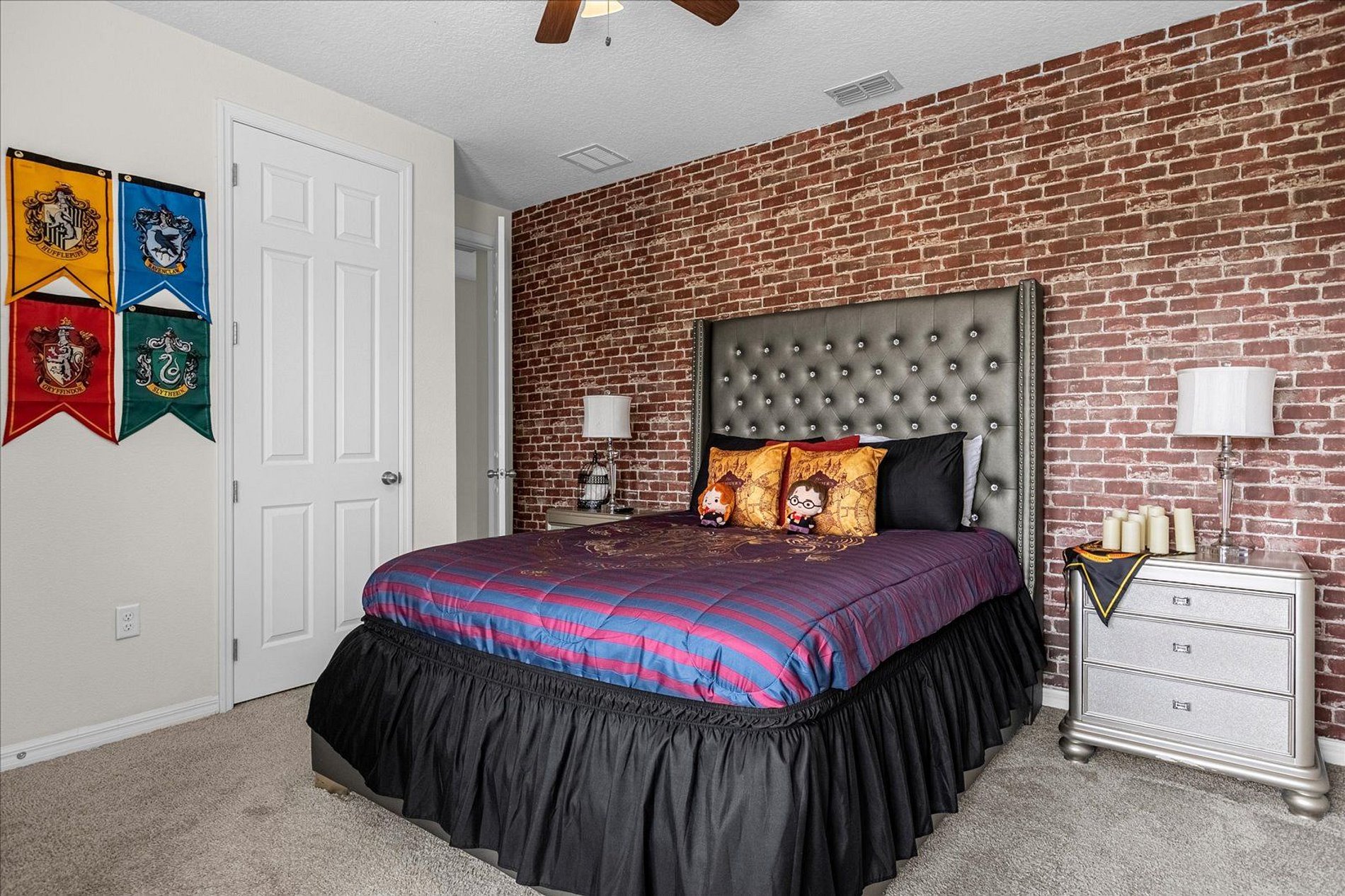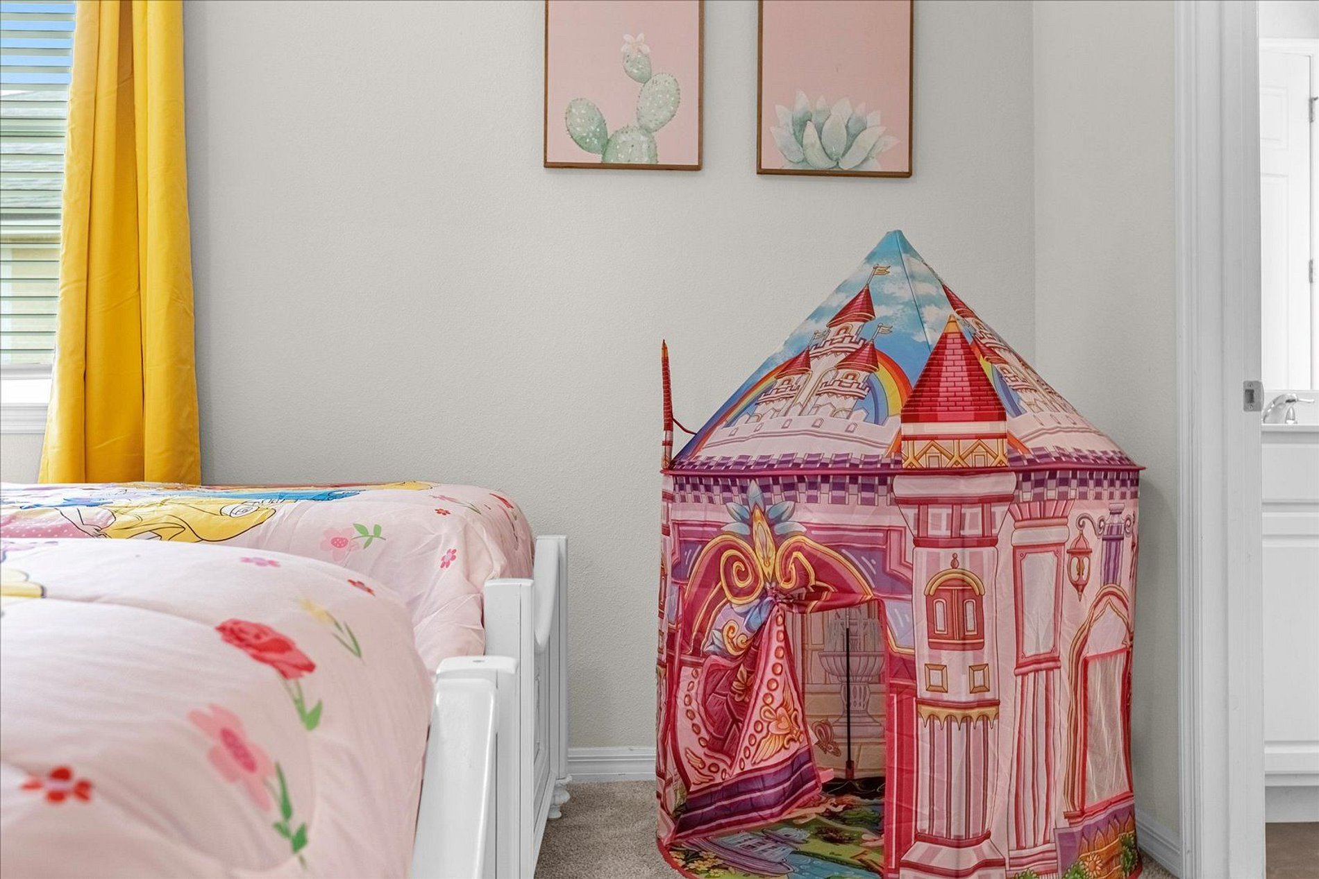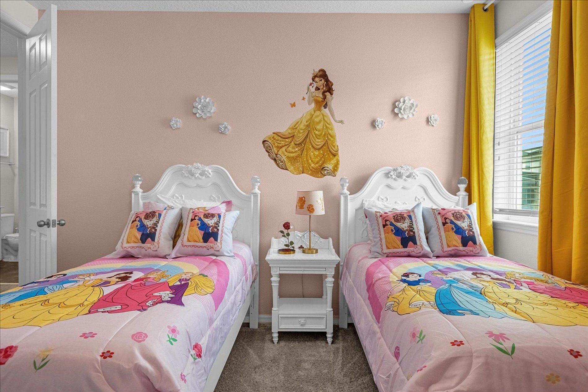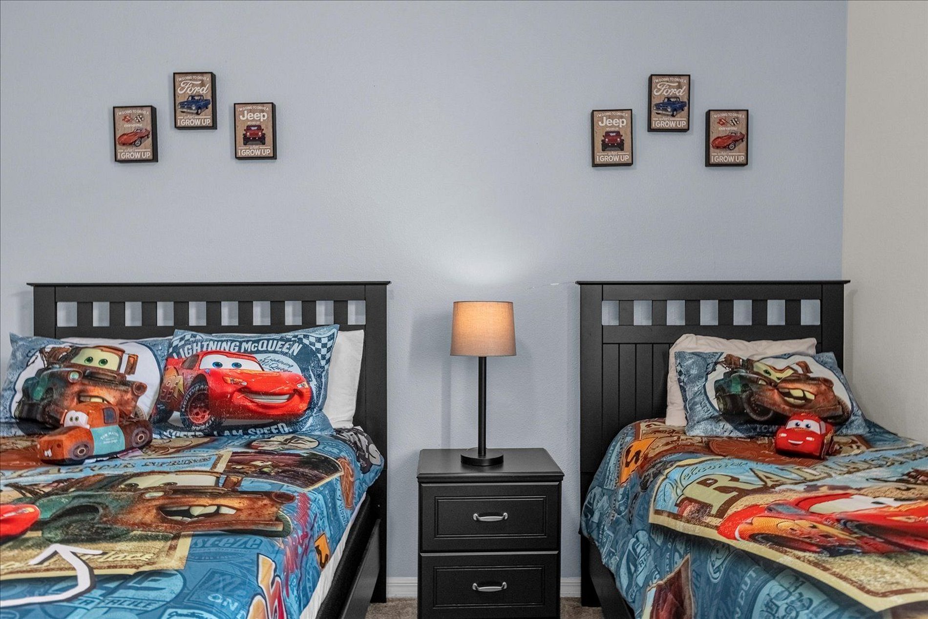 1º 1 Bedroom with 2 beds, 1 twin and 1 full, Minions theme; 1 Bedroom with a Queen bed, Suite; 2º 1 Bedroom with a King bed, Suite; 1 Bedroom with 2 single beds, Princesses theme - Shared Suite; 1 Bedroom with 1 Full bed, Shared Suite; 1 Bedroom with 2 beds, 1 twin and 1 full, Cars theme. THIS HOUSE OFFERS 2 COMPLETE SUITES AND 2 SHARED ONES.