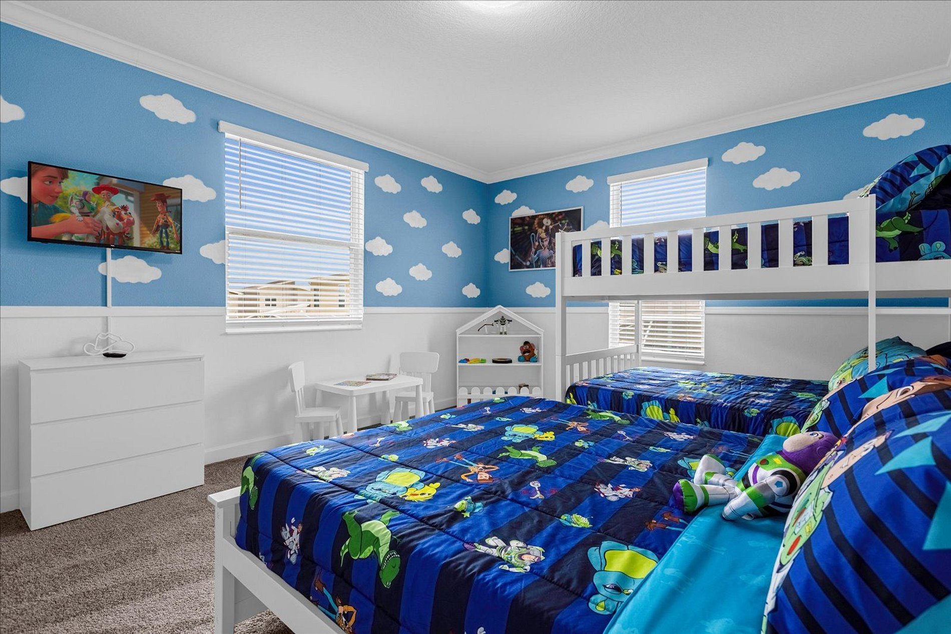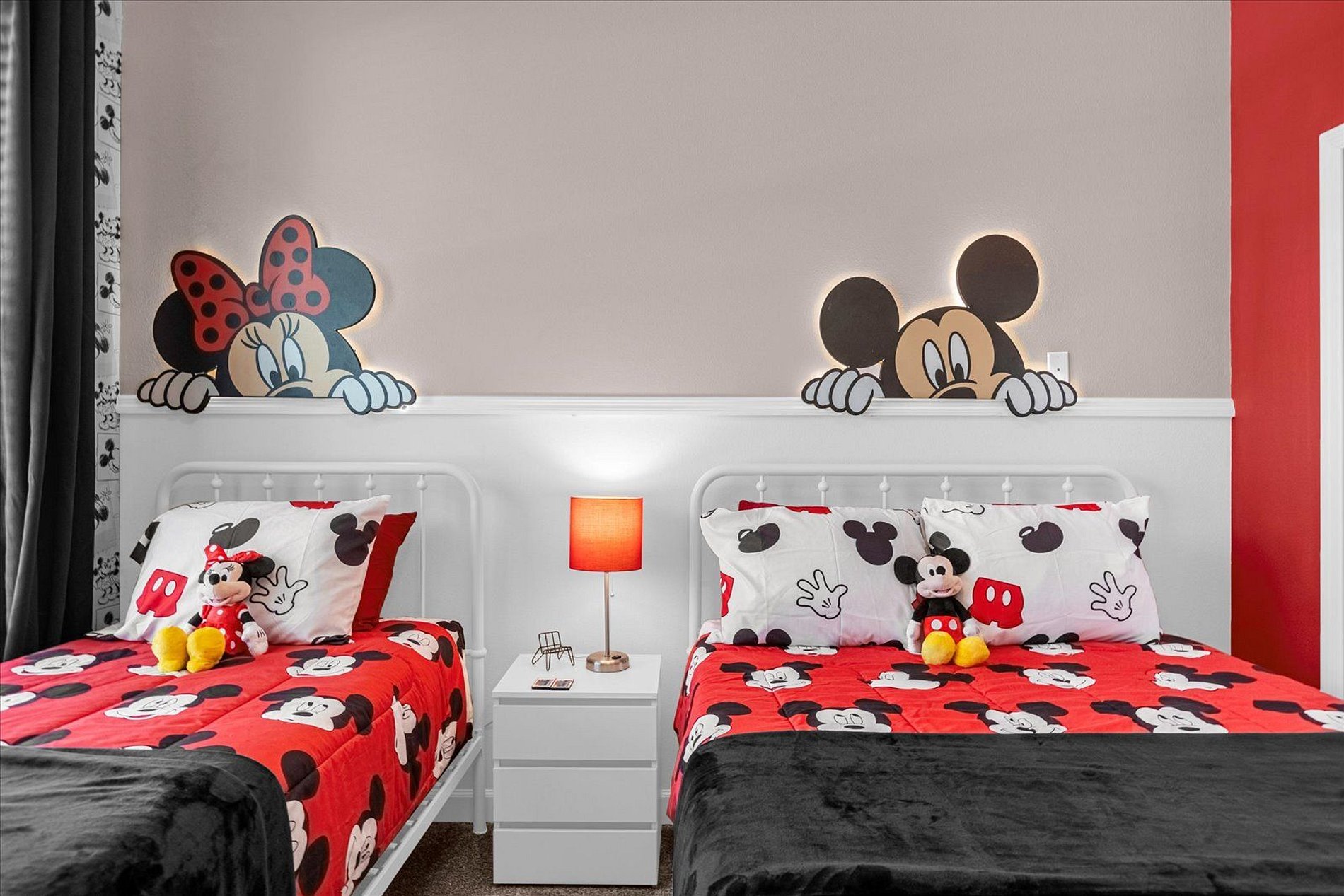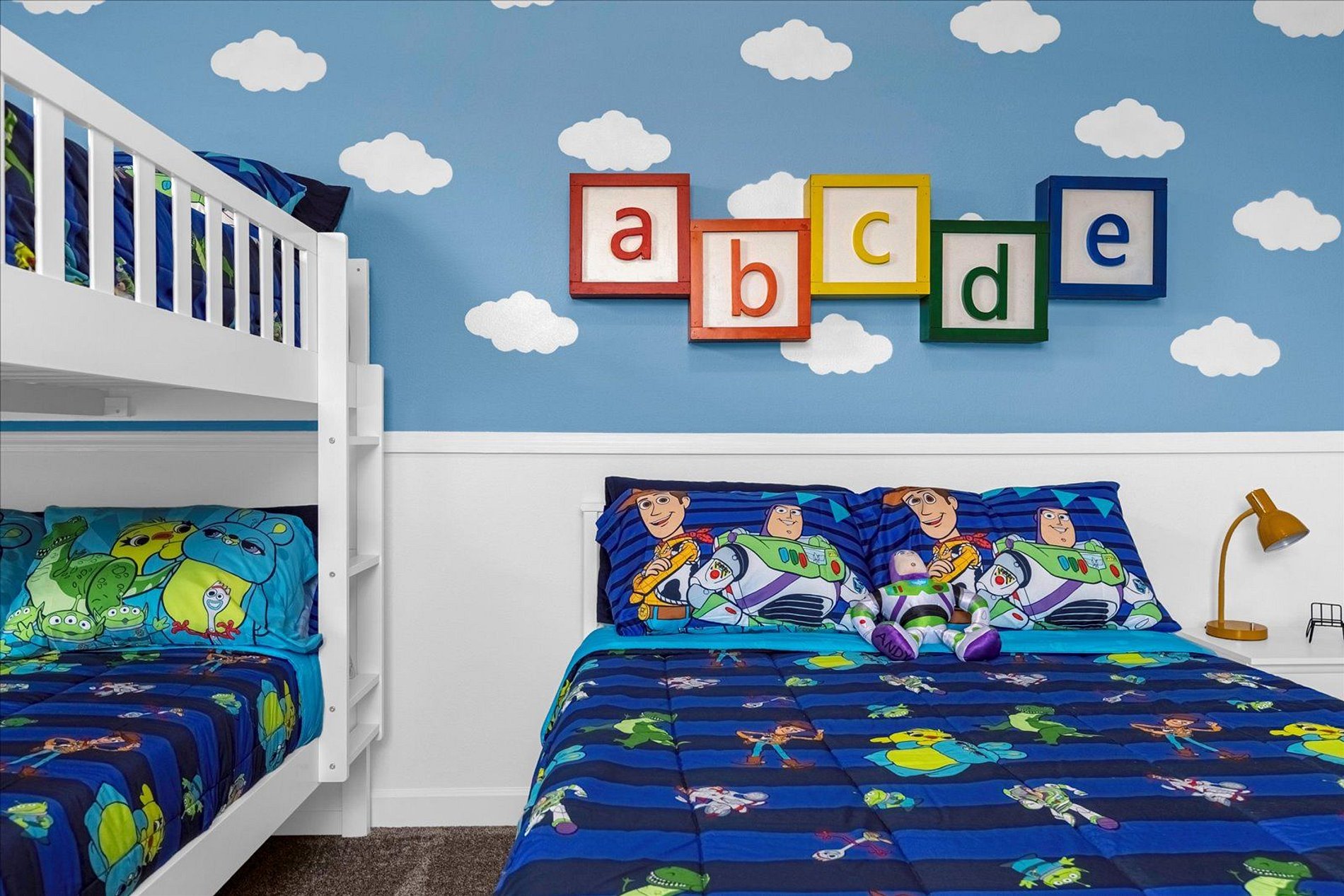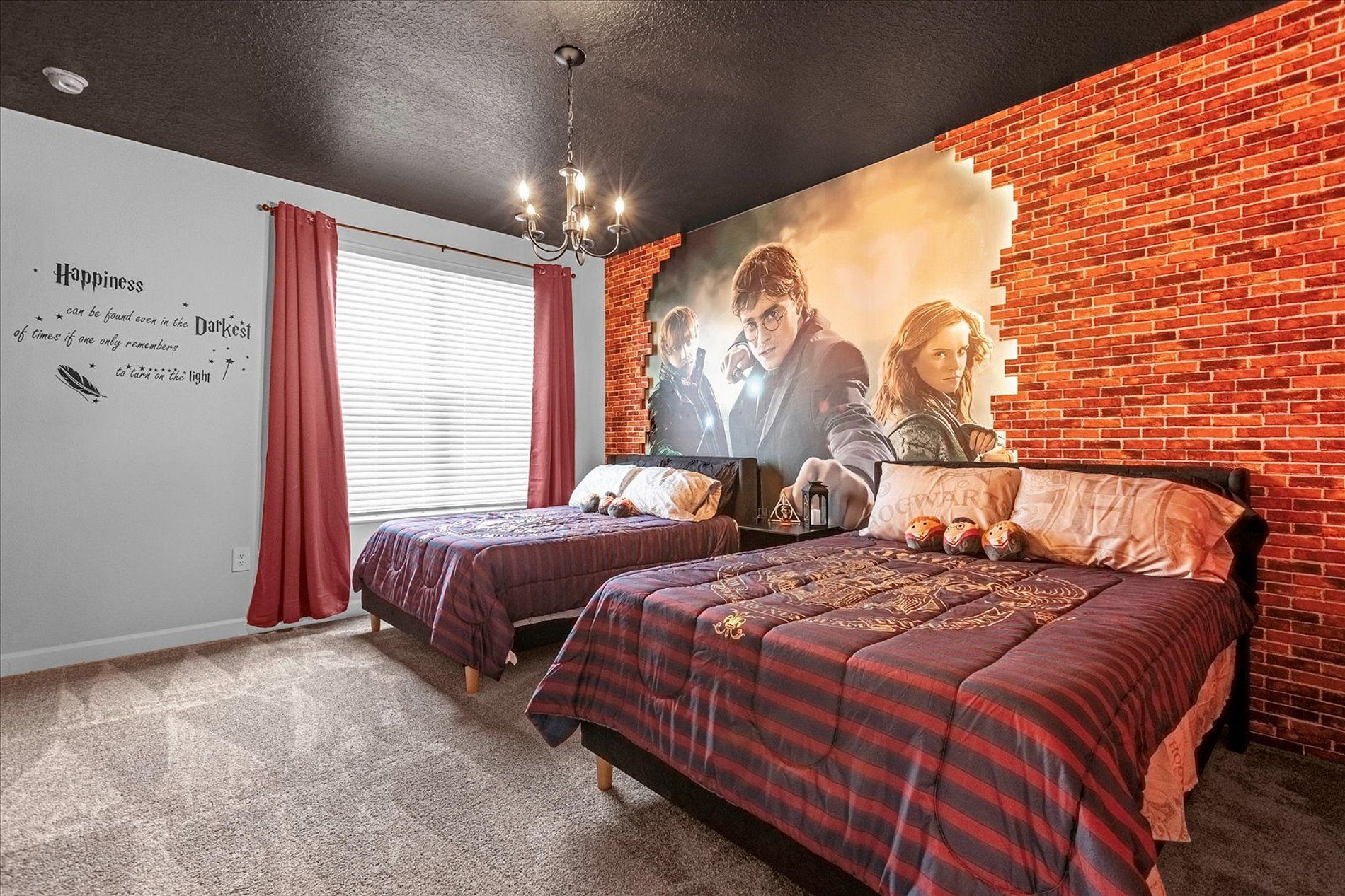 1 ° floor Room 1 Mickey - 1 full bed and 1 twin bed; Bedroom 2 - 1 king bed - suite 2nd Floor Bedroom 3 Harry Potter - 2 full beds; Bedroom 4 - 1 queen bed; Bedroom 5 Toy Story - 1 full bed + 1 bunk bed (2 full beds), suite. THIS HOUSE HAS 2 SUITES.