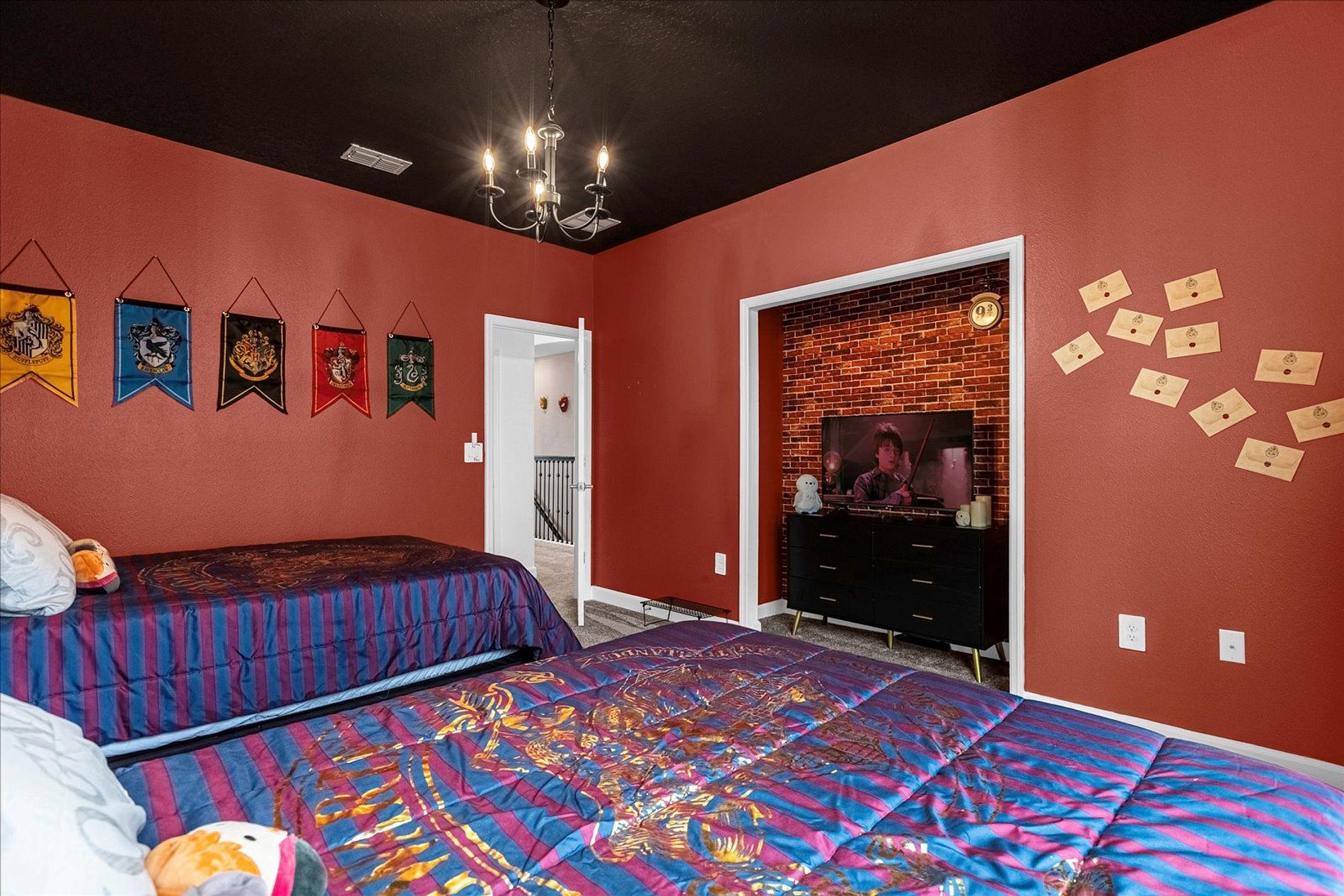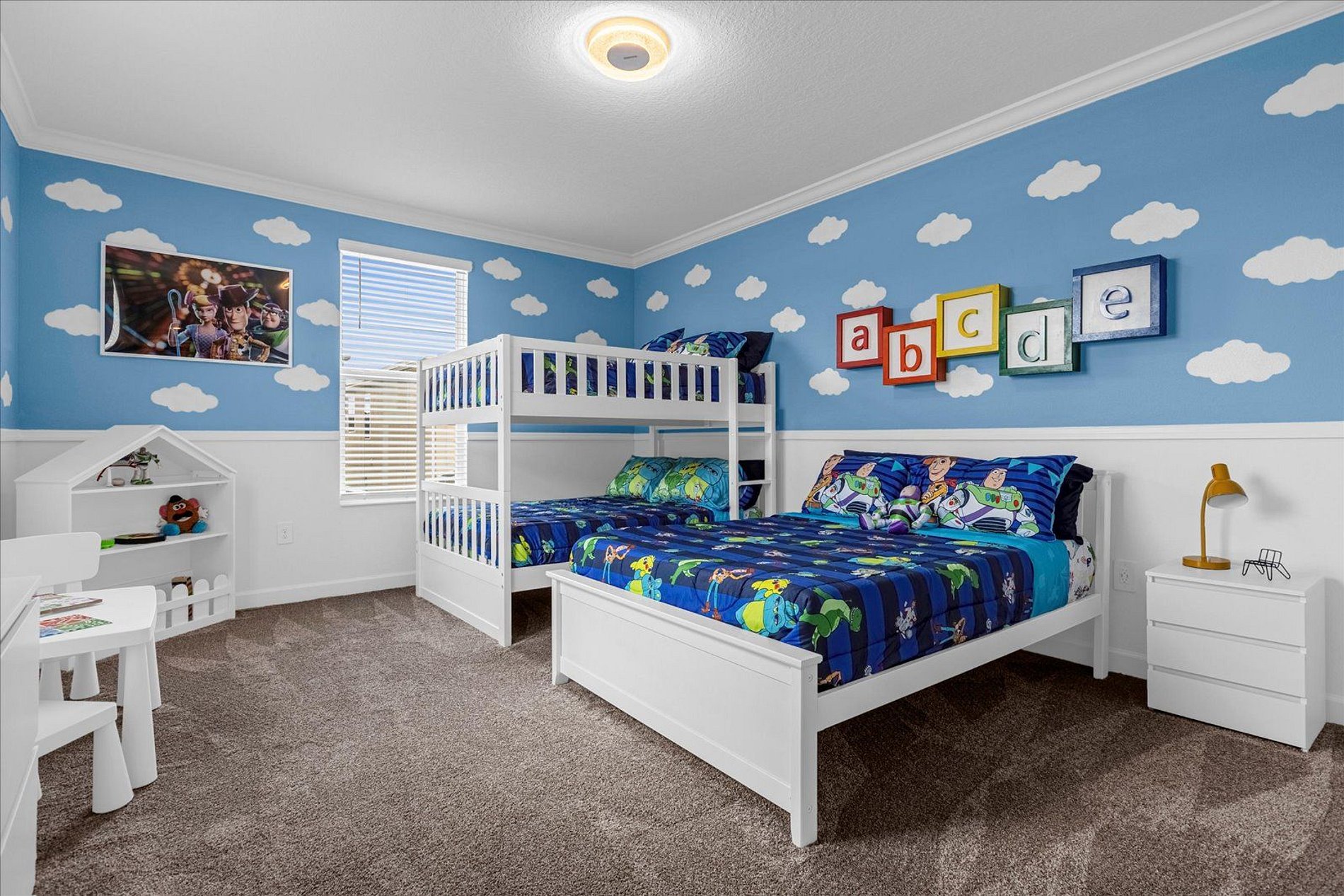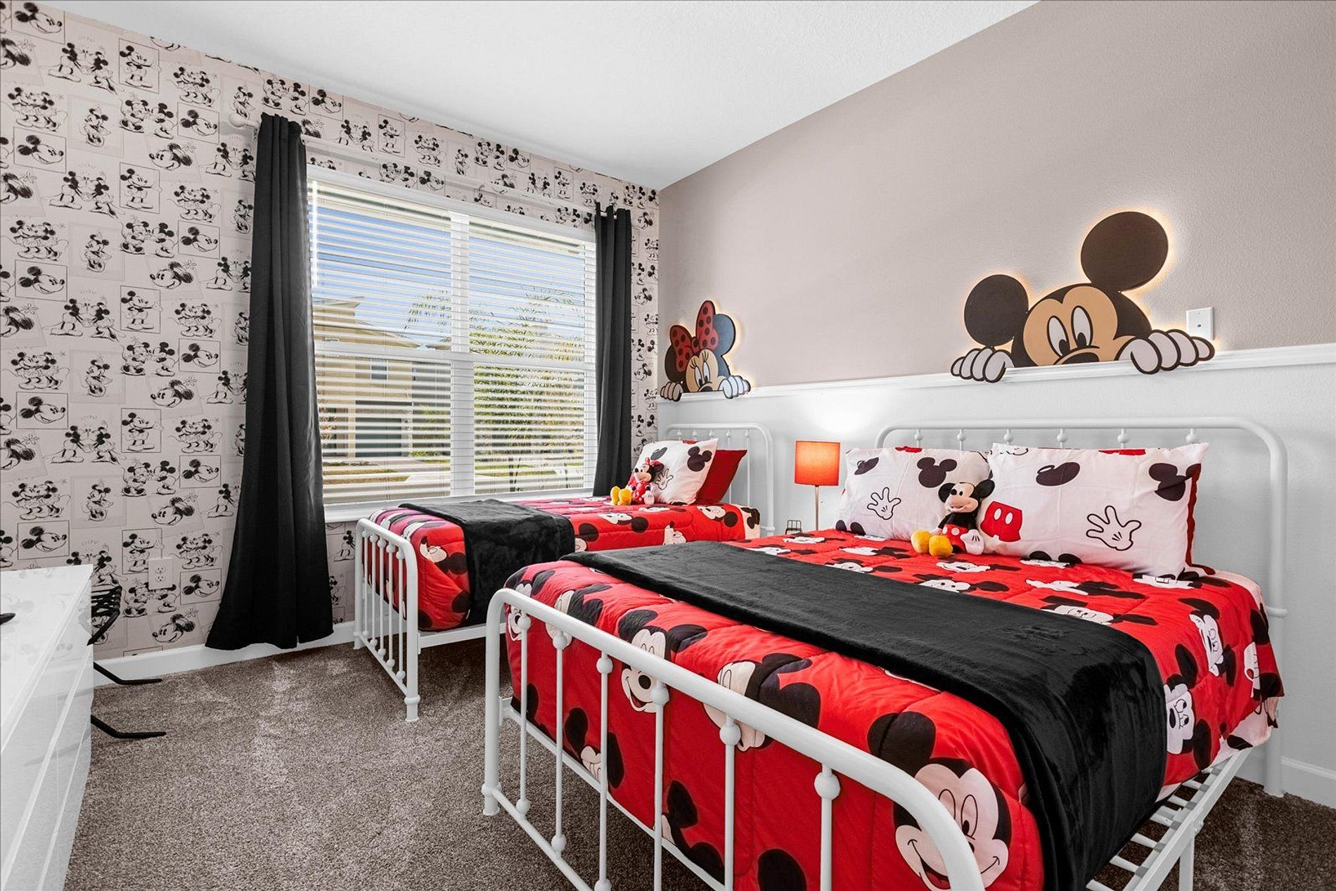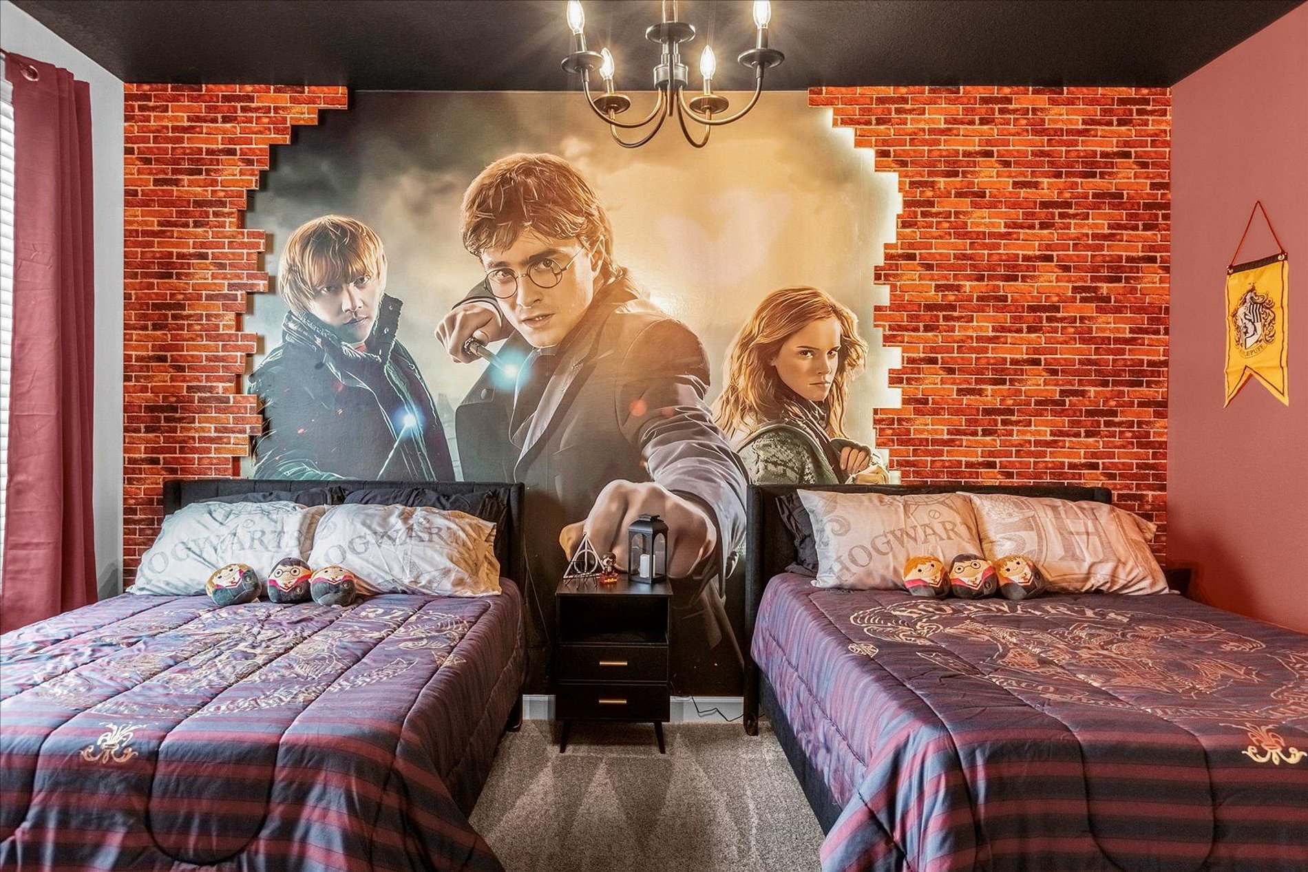 1 ° floor Room 1 Mickey - 1 full bed and 1 twin bed; Bedroom 2 - 1 king bed - suite 2nd Floor Bedroom 3 Harry Potter - 2 full beds; Bedroom 4 - 1 queen bed; Bedroom 5 Toy Story - 1 full bed + 1 bunk bed (2 full beds), suite. THIS HOUSE HAS 2 SUITES.