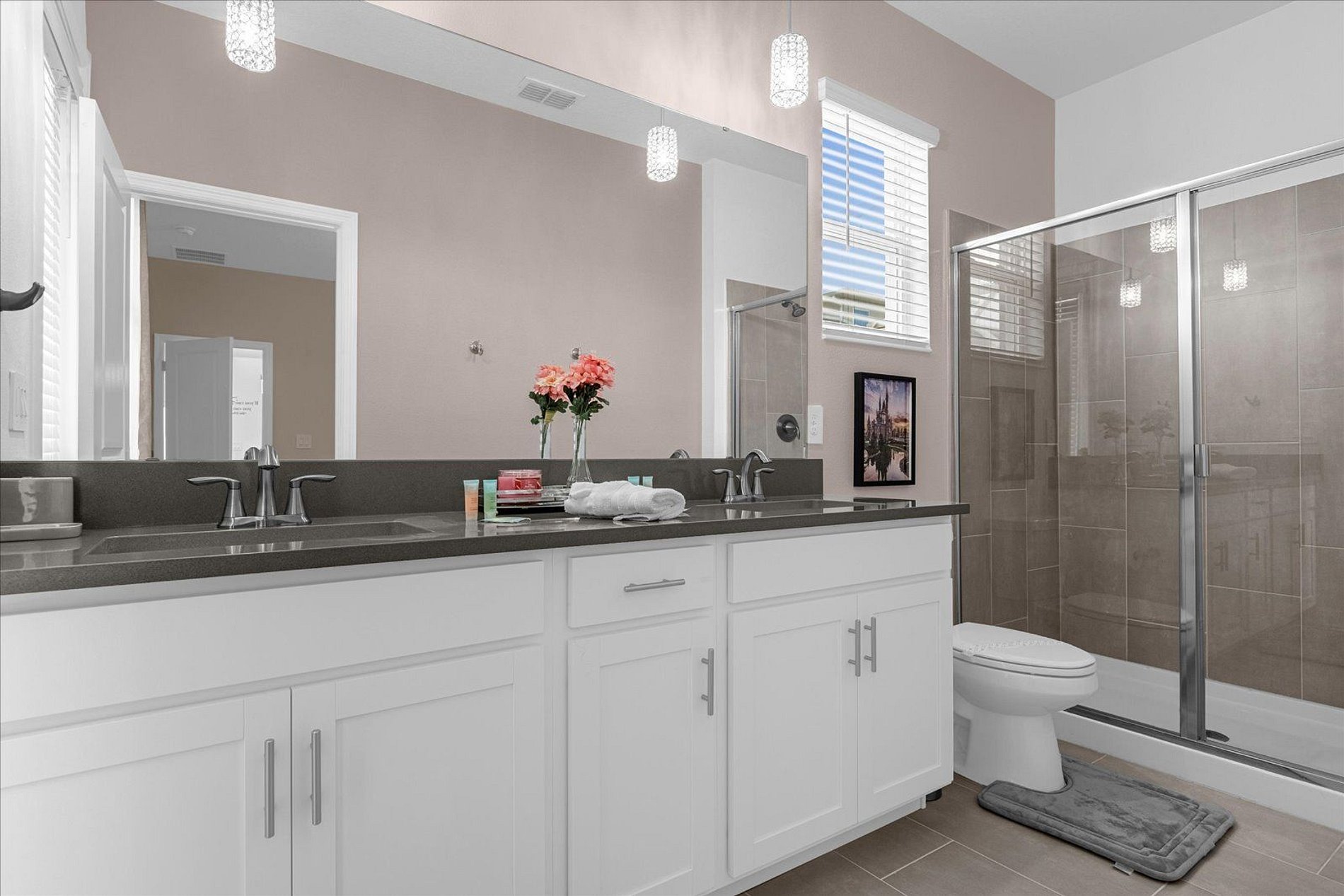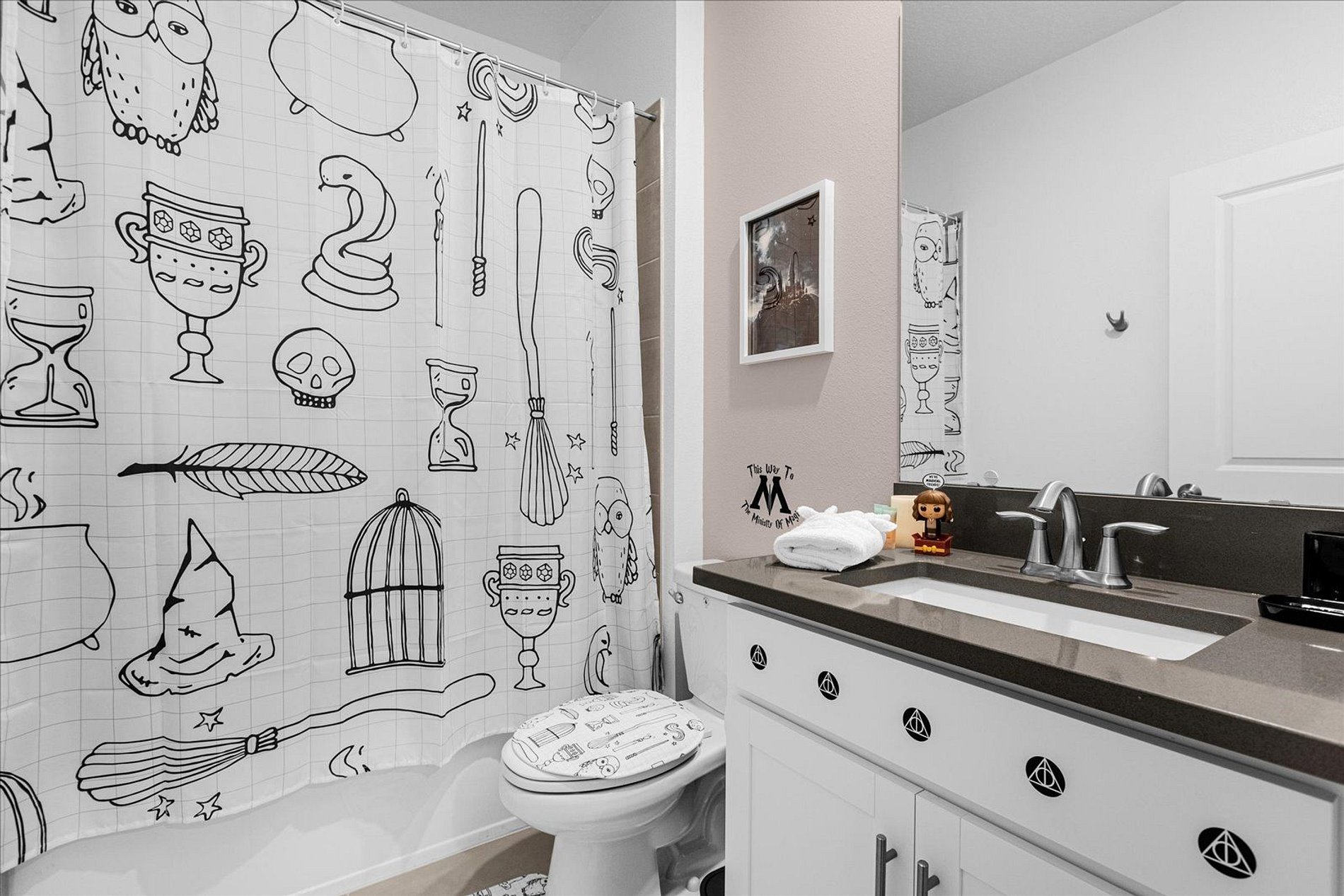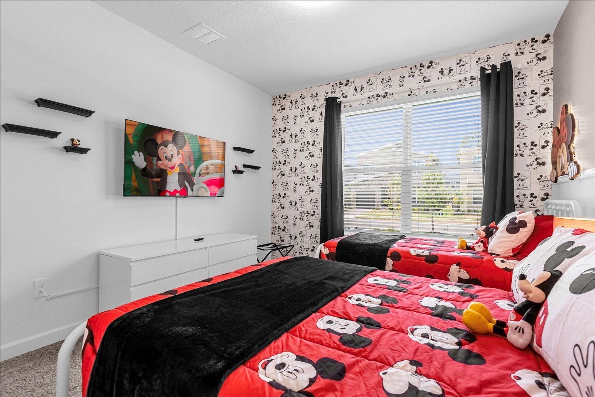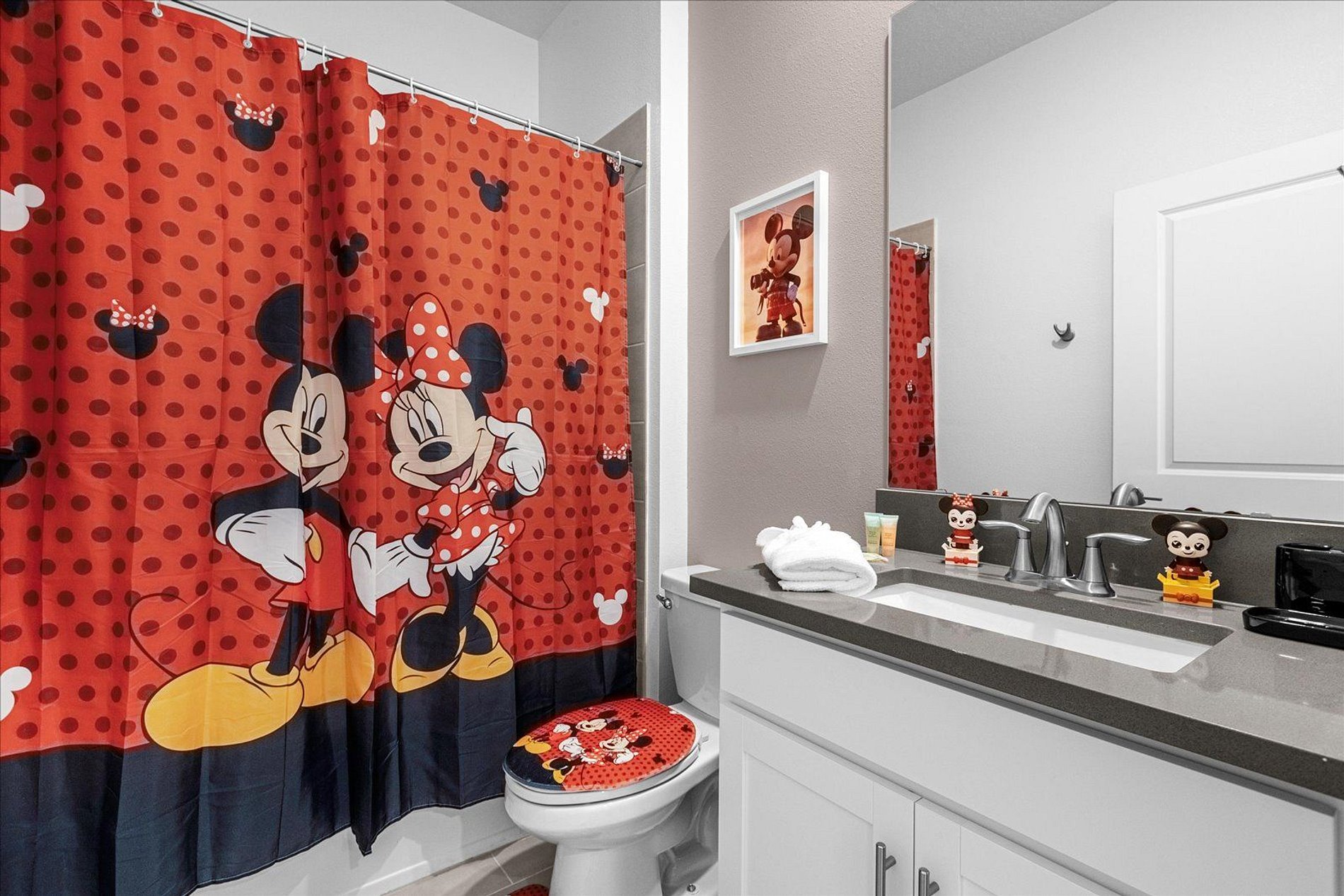 1 ° floor Room 1 Mickey - 1 full bed and 1 twin bed; Bedroom 2 - 1 king bed - suite 2nd Floor Bedroom 3 Harry Potter - 2 full beds; Bedroom 4 - 1 queen bed; Bedroom 5 Toy Story - 1 full bed + 1 bunk bed (2 full beds), suite. THIS HOUSE HAS 2 SUITES.