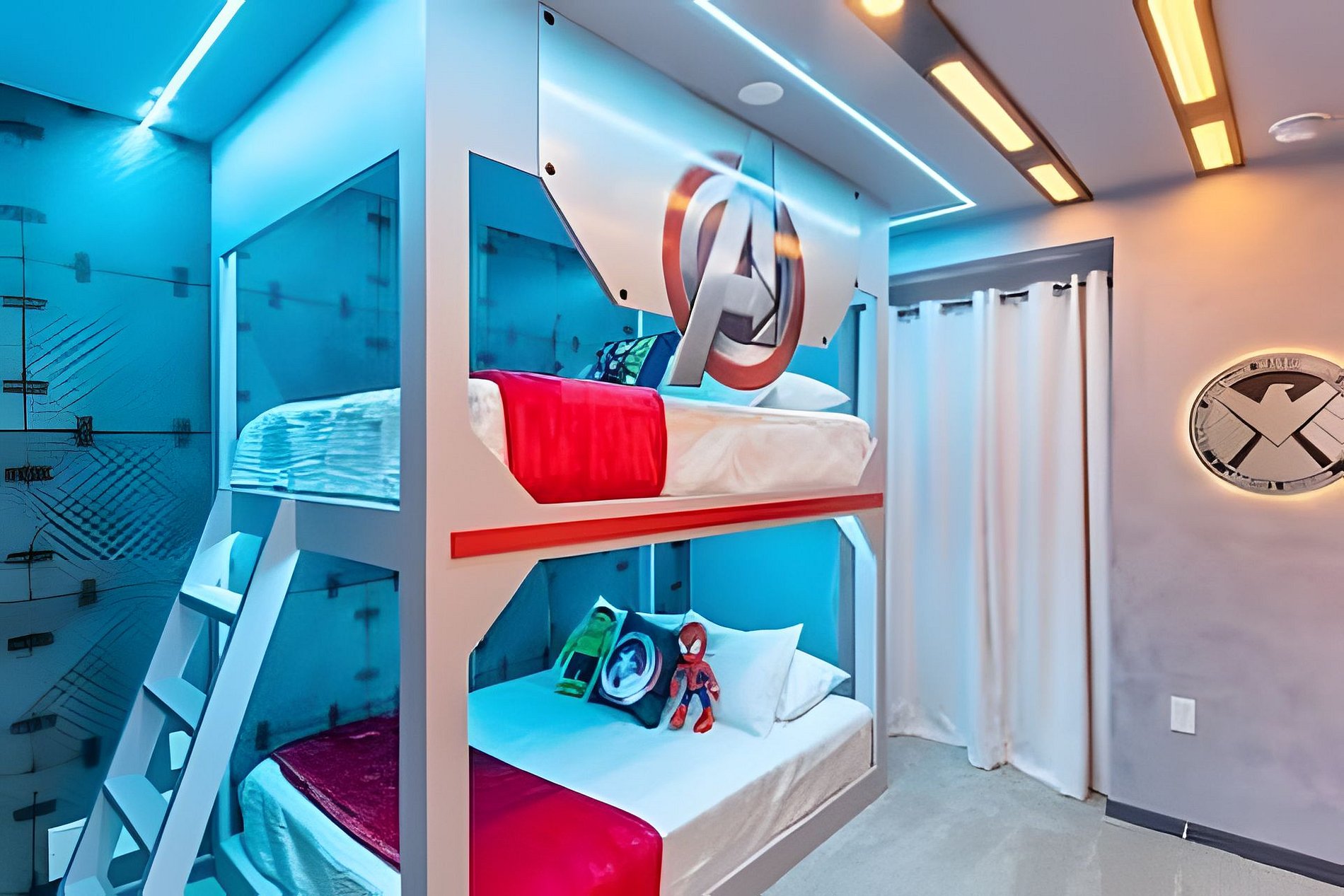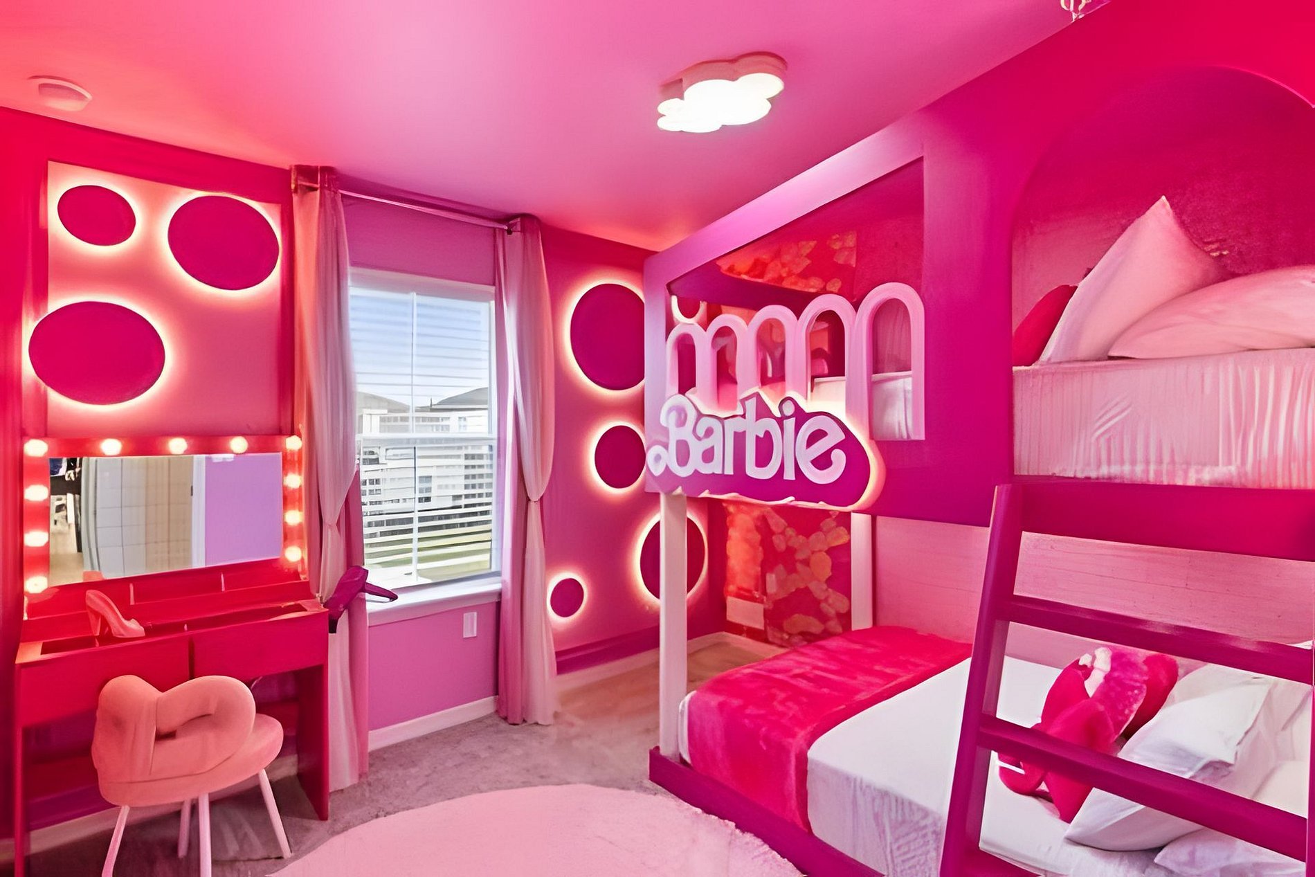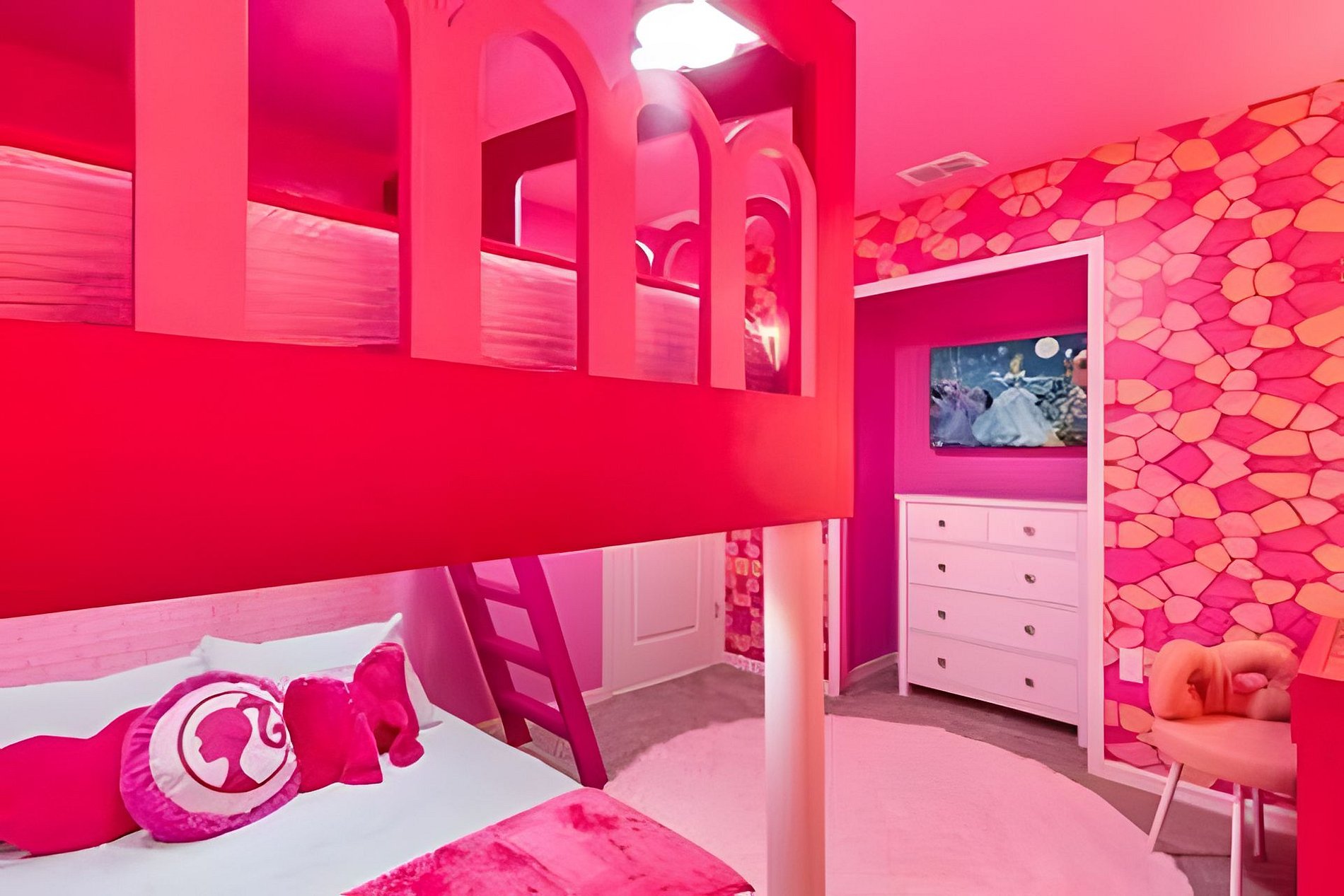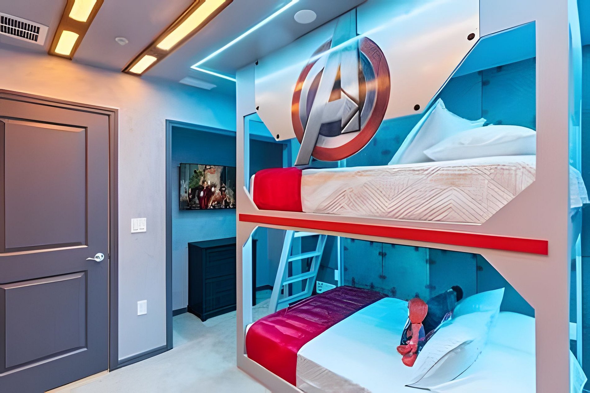 BED CONFIGURATION: 1st Floor Bedroom 1: 1 King bed 1 Social bathroom 1 Half bathroom in the outdoor area 2nd Floor Bedroom 2: 1 King bed, en-suite Bedroom 3: 1 King bed, en-suite Bedroom 4: 1 Bunk bed with 2 Full beds (Barbie theme) Bedroom 5: 1 Bunk bed with 2 Full beds (Avengers theme) 1 Social bathroom This home features 2 full en-suites. *Central AC *Private Door Code for Each Guest Stay *Fully Equipped Kitchen *Washer & Dryer *Towels, Washcloths, Linens Provided *Hair Dryers, Iron & Ironing Board *TV in Every Bedroom *Family Room with Flat Screen TV *Free Cable TV & WiFi *Private Screened-in Pool + Child Safety Pool Fence *Outdoor Patio Furniture with Sun Loungers *Pack ’n Play / High Chair (Free Upon Request)