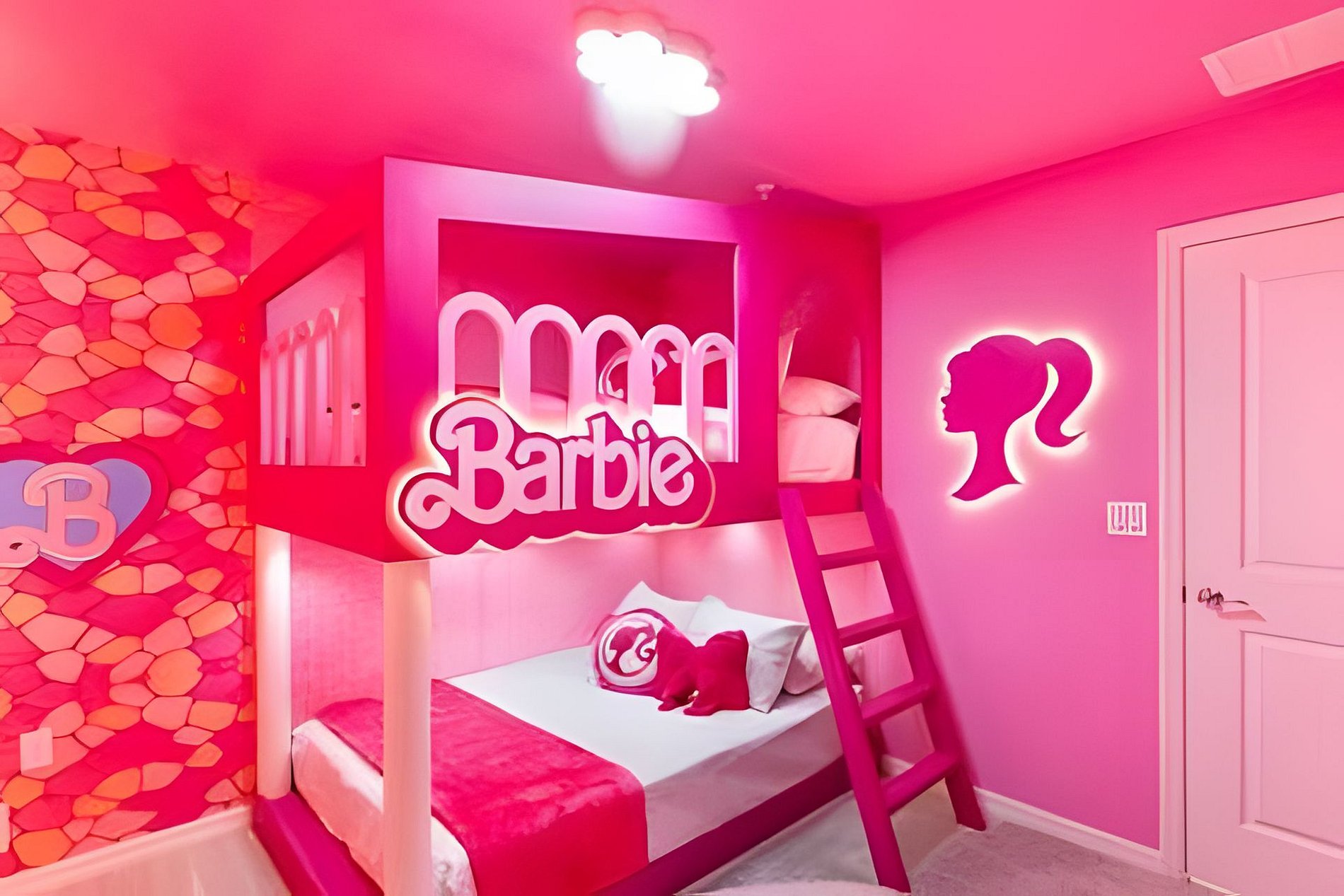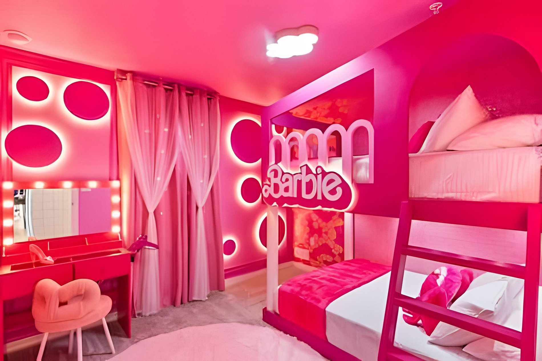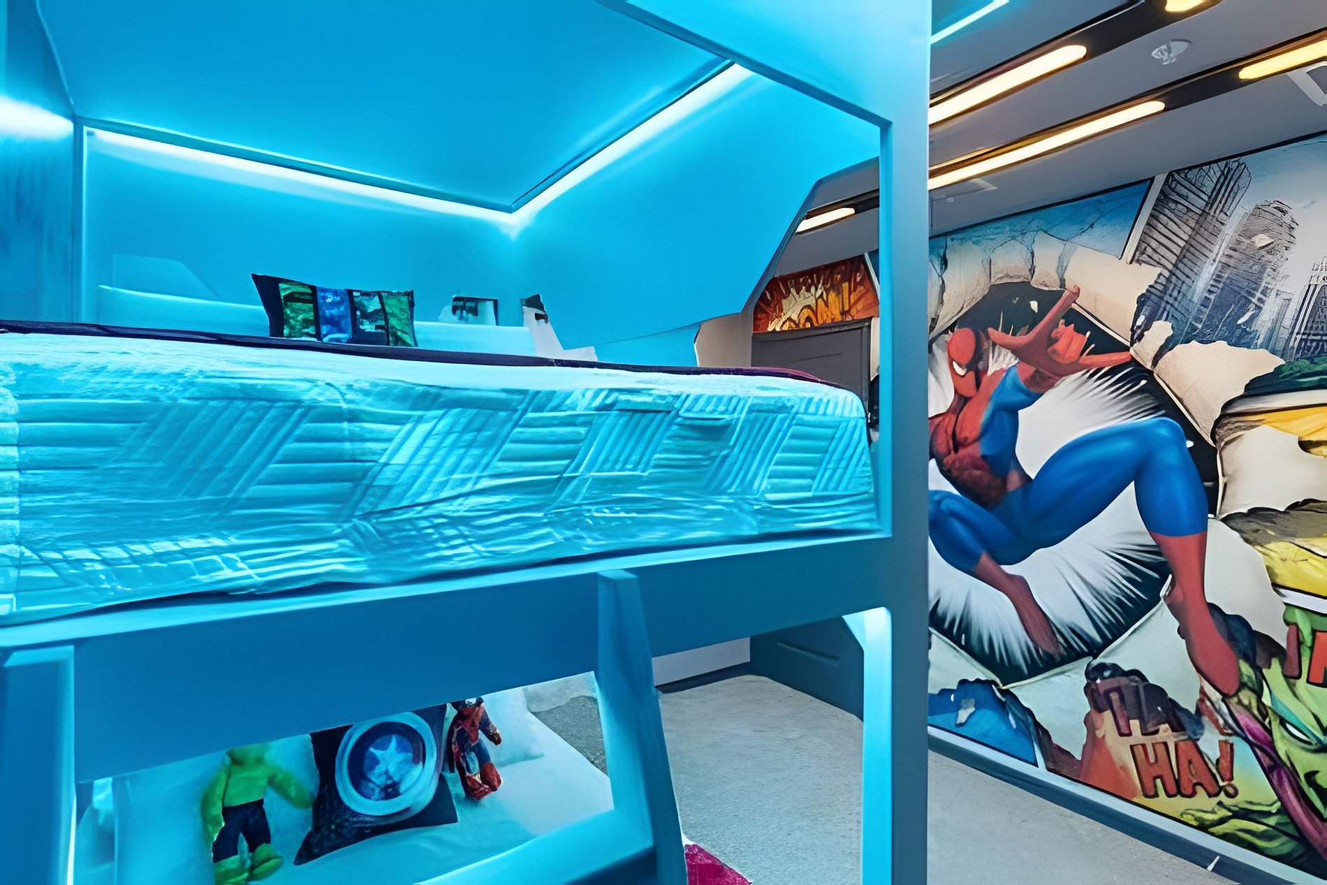 BED CONFIGURATION: 1st Floor Bedroom 1: 1 King bed 1 Social bathroom 1 Half bathroom in the outdoor area 2nd Floor Bedroom 2: 1 King bed, en-suite Bedroom 3: 1 King bed, en-suite Bedroom 4: 1 Bunk bed with 2 Full beds (Barbie theme) Bedroom 5: 1 Bunk bed with 2 Full beds (Avengers theme) 1 Social bathroom This home features 2 full en-suites. *Central AC *Private Door Code for Each Guest Stay *Fully Equipped Kitchen *Washer & Dryer *Towels, Washcloths, Linens Provided *Hair Dryers, Iron & Ironing Board *TV in Every Bedroom *Family Room with Flat Screen TV *Free Cable TV & WiFi *Private Screened-in Pool + Child Safety Pool Fence *Outdoor Patio Furniture with Sun Loungers *Pack ’n Play / High Chair (Free Upon Request)