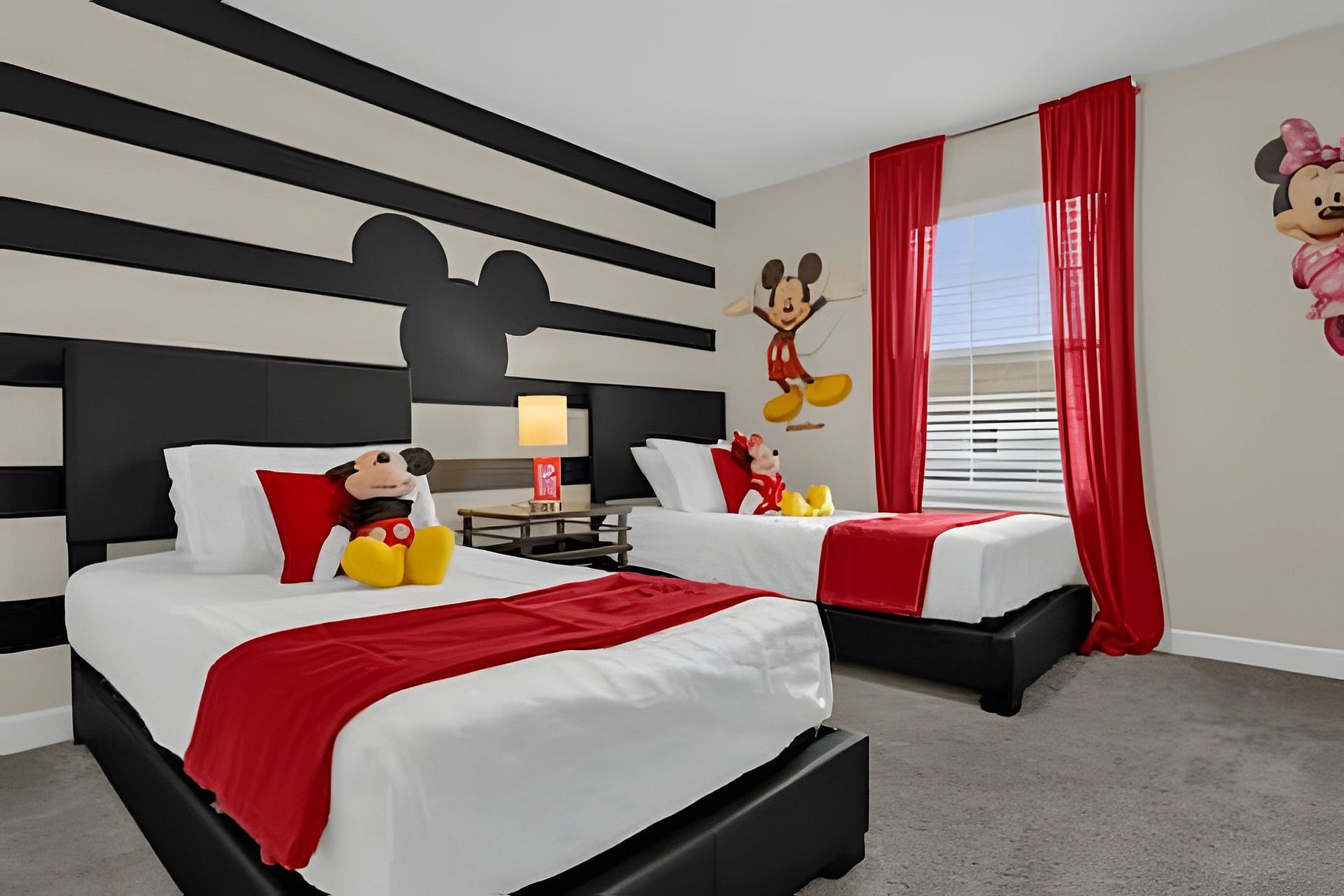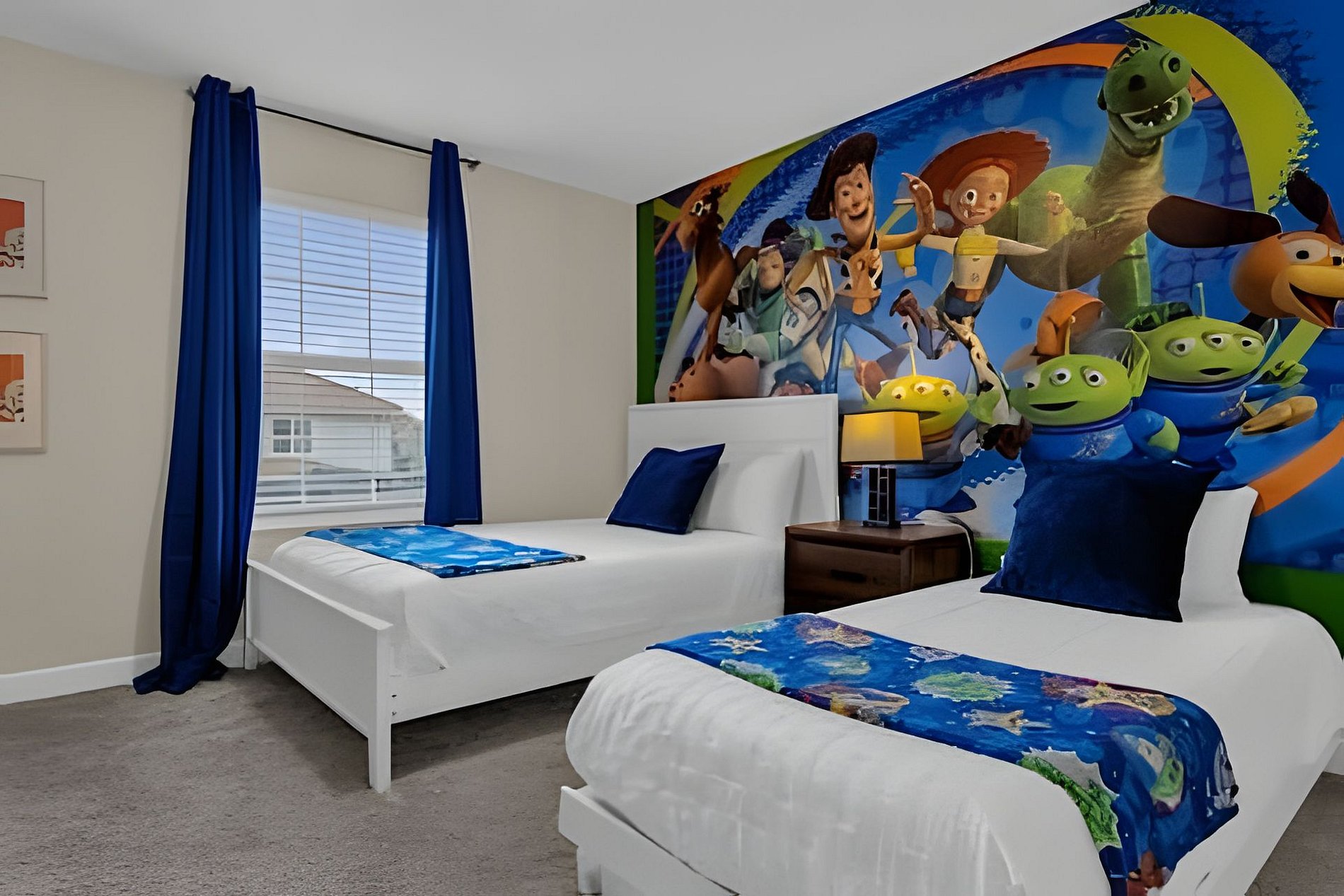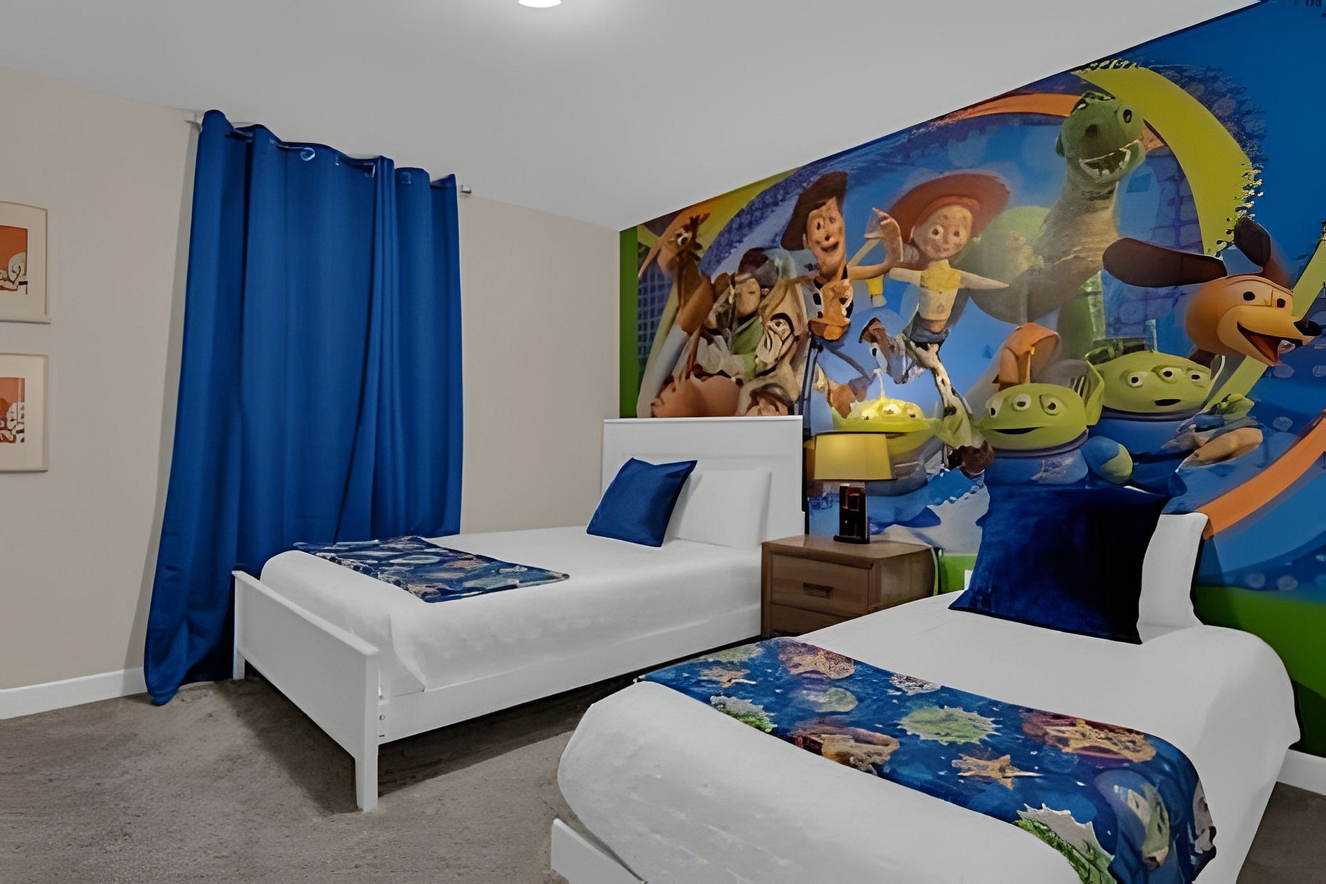 1ST FLOOR Bedroom 1: Queen bed; 1 full bathroom; 2ND FLOOR Bedroom 2: With two Twin beds, Mickey; Bedroom 3: King bed, suite; Bedroom 4: With two Twin beds, Toy Story; The house has 1 suite.