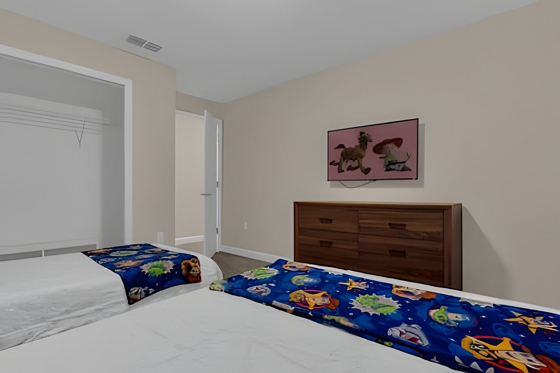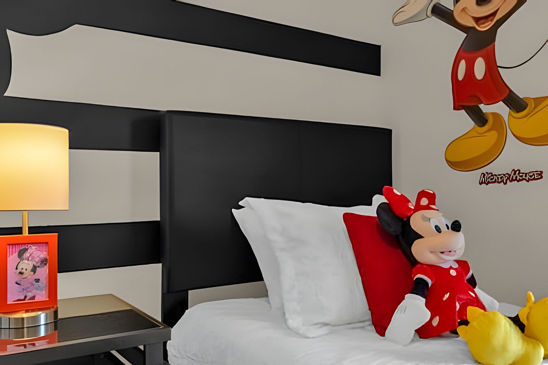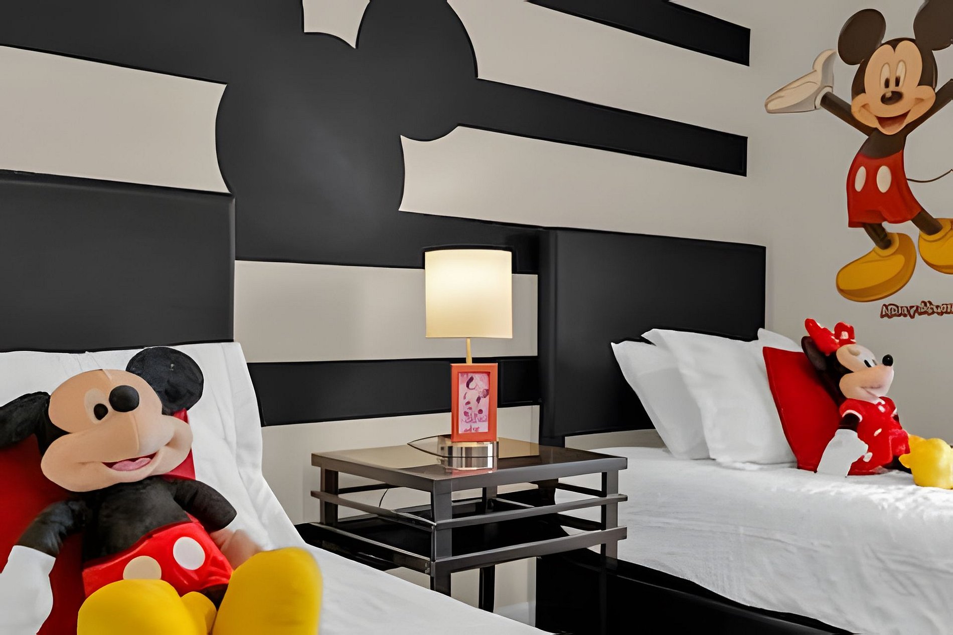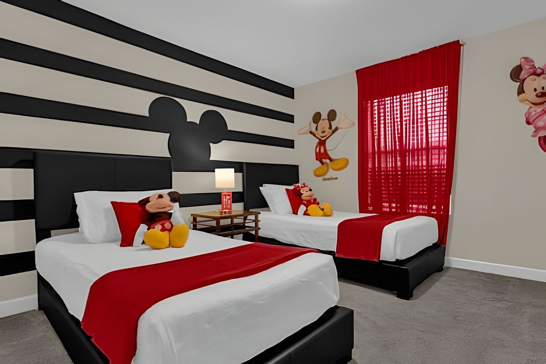 1ST FLOOR Bedroom 1: Queen bed; 1 full bathroom; 2ND FLOOR Bedroom 2: With two Twin beds, Mickey; Bedroom 3: King bed, suite; Bedroom 4: With two Twin beds, Toy Story; The house has 1 suite.