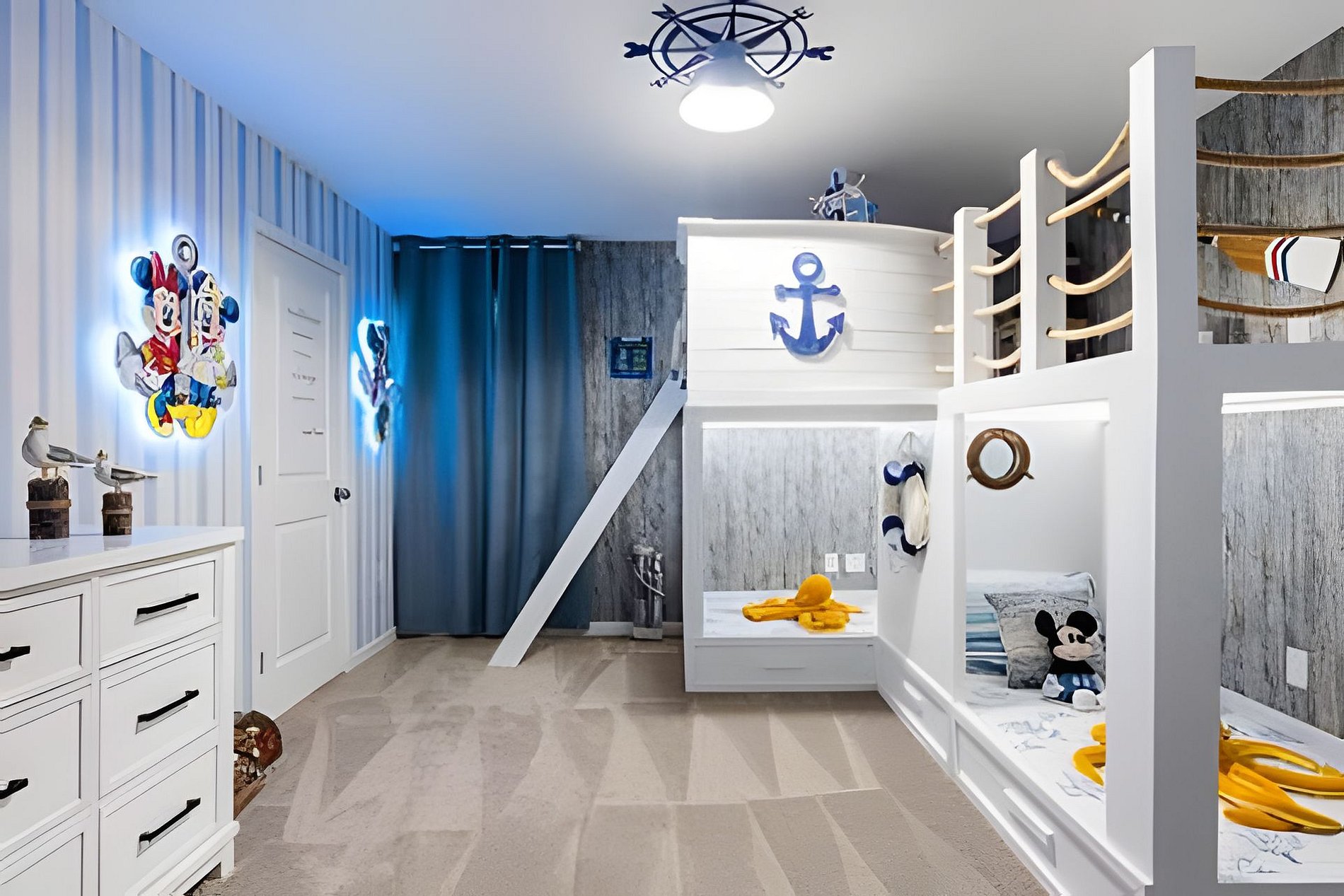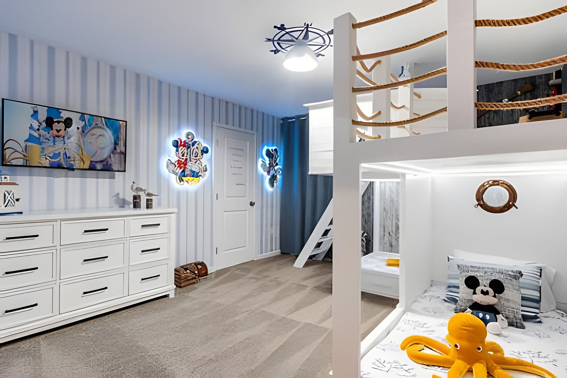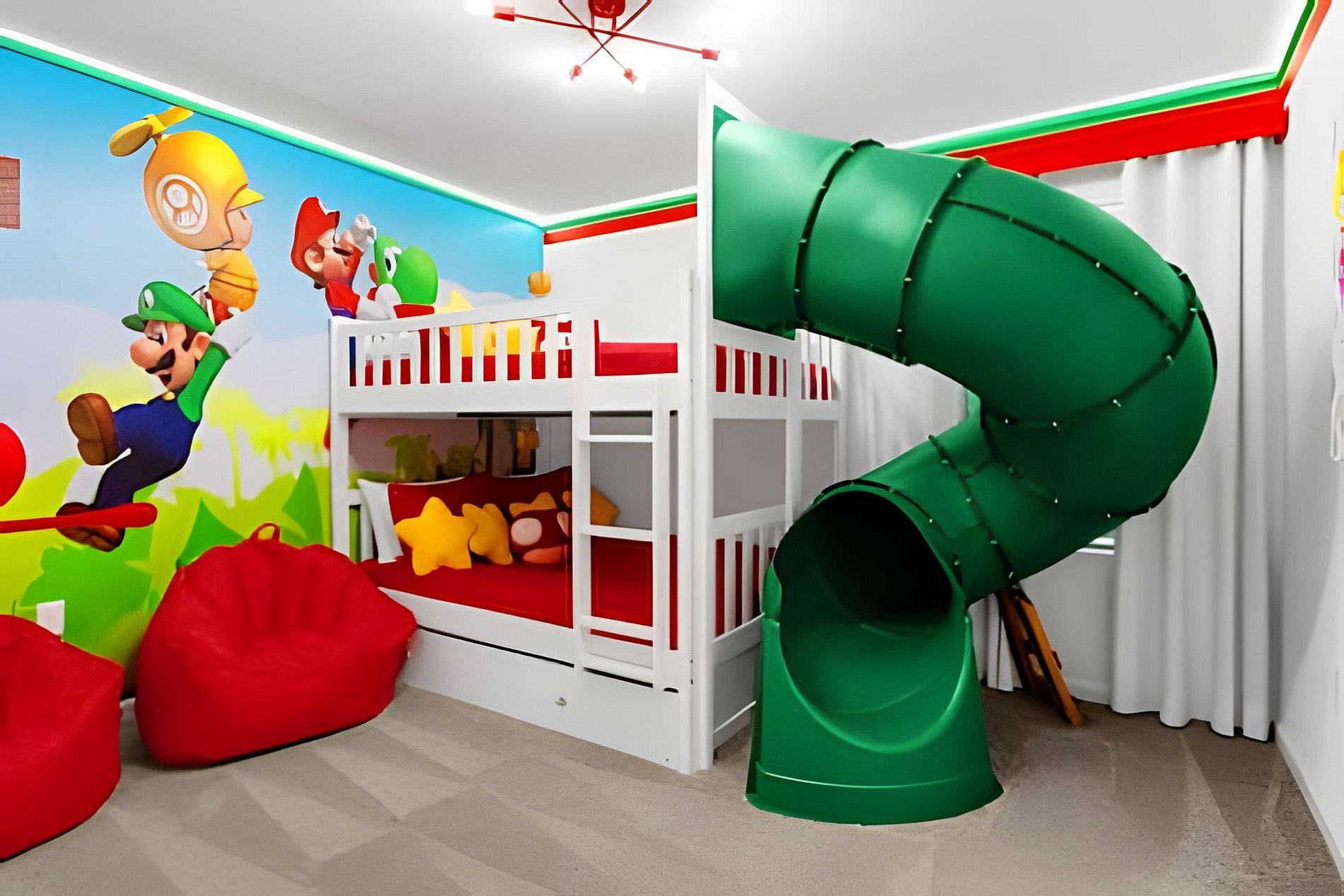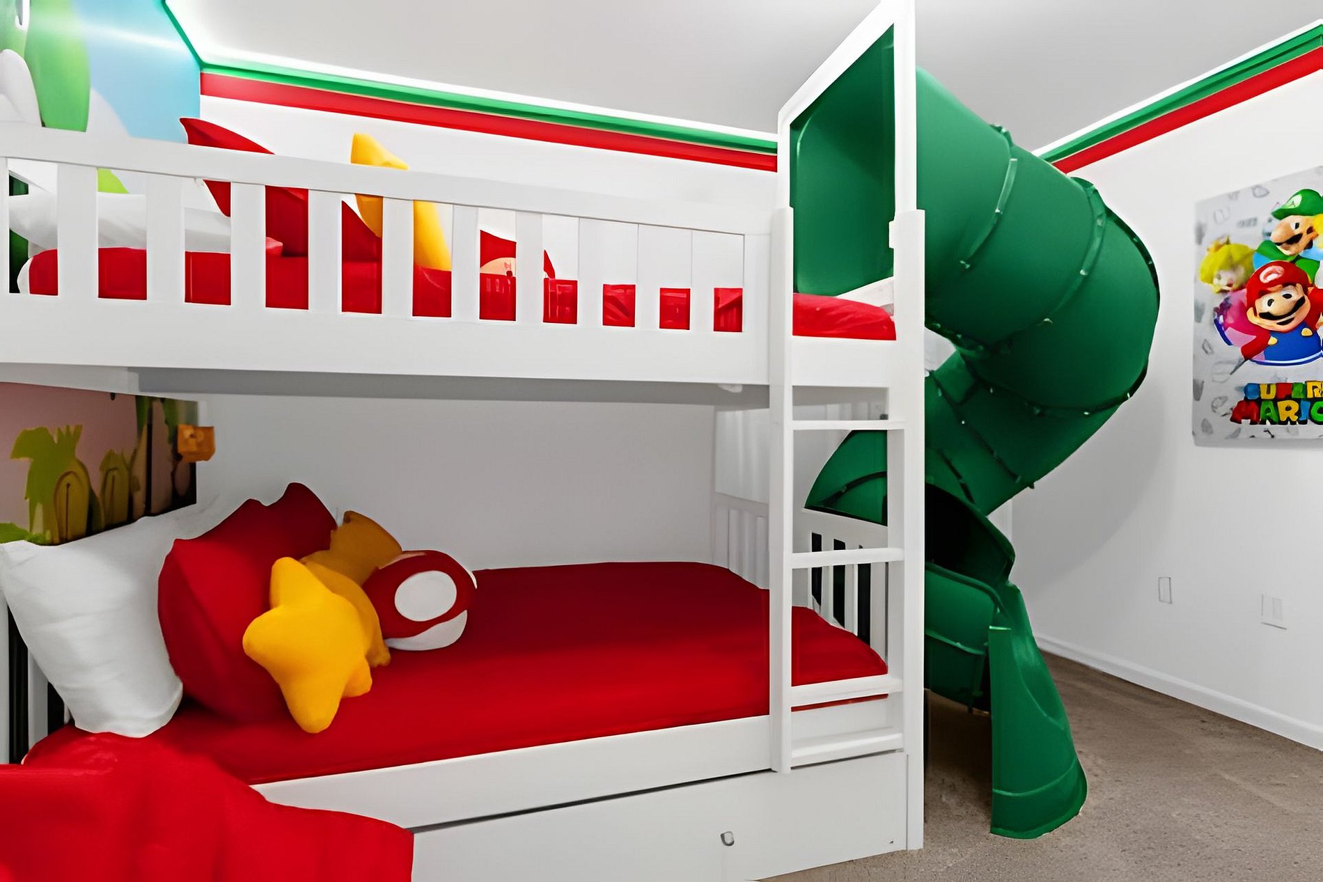 1ST FLOOR -Bedroom 1: With King bed, suite; 2ND FLOOR -Bedroom 2: With one King bed, shared suite; -Bedroom 3: Bunk bed, with two full beds, + 1 twin -auxiliary bed, Mario Bross with slide, shared suite; -Bedroom 4: Bunk bed, with two Twin beds + 1 twin auxiliary bed, shared suite; -Bedroom 5: With King bed, shared suite; -Bedroom 6: Bunk bed, with two full beds, Encanto, shared suite; -Bedroom 7: With two twin beds, Mickey, shared suite; -Bedroom 8: With one King bed, suite; -Bedroom 9: Bunk bed, with 1 Full bed + 1 twin bed, -Harry Potter; THIS HOUSE HAS 02 FULL SUITES AND 6 SHARED SUITES.