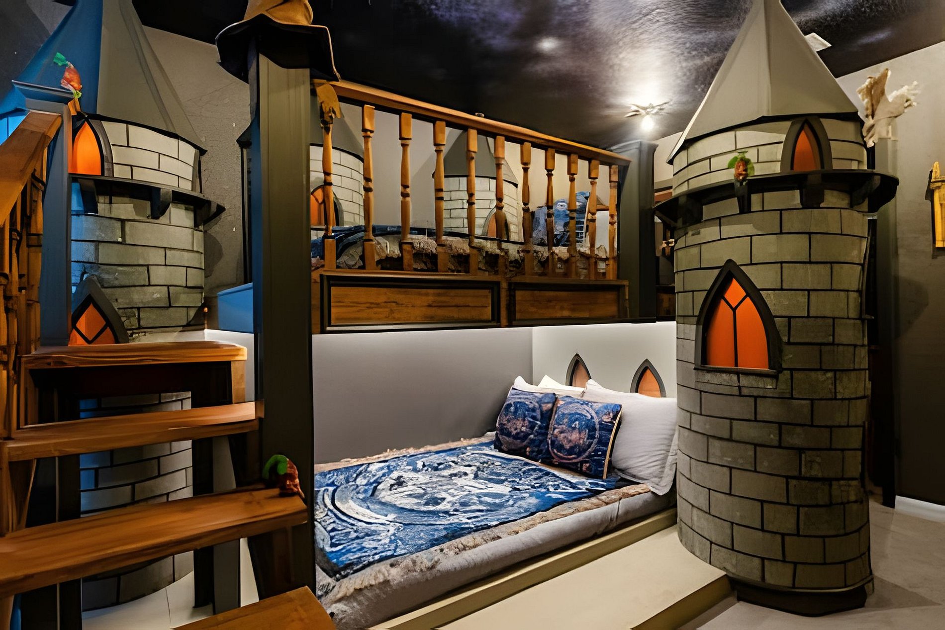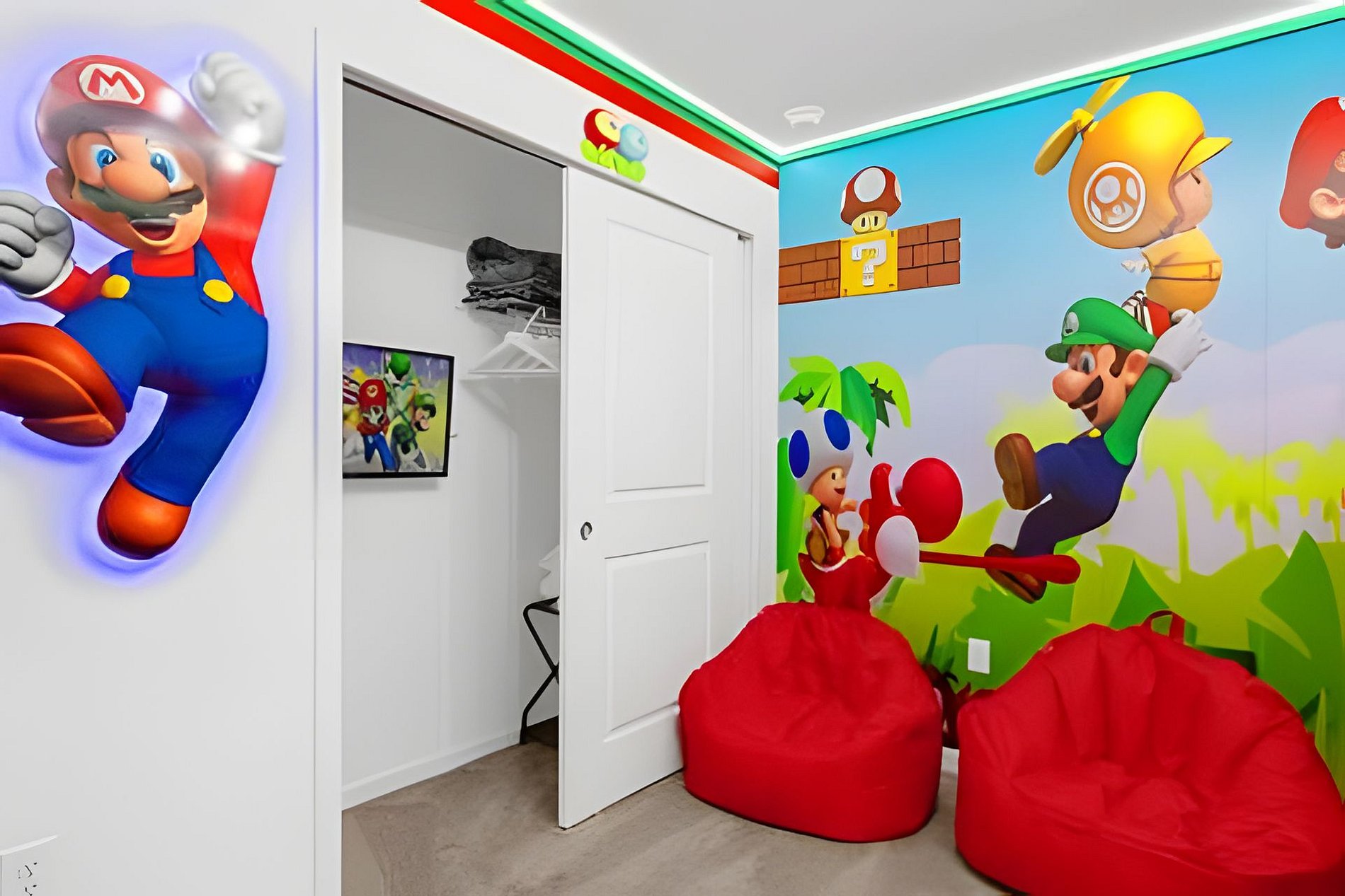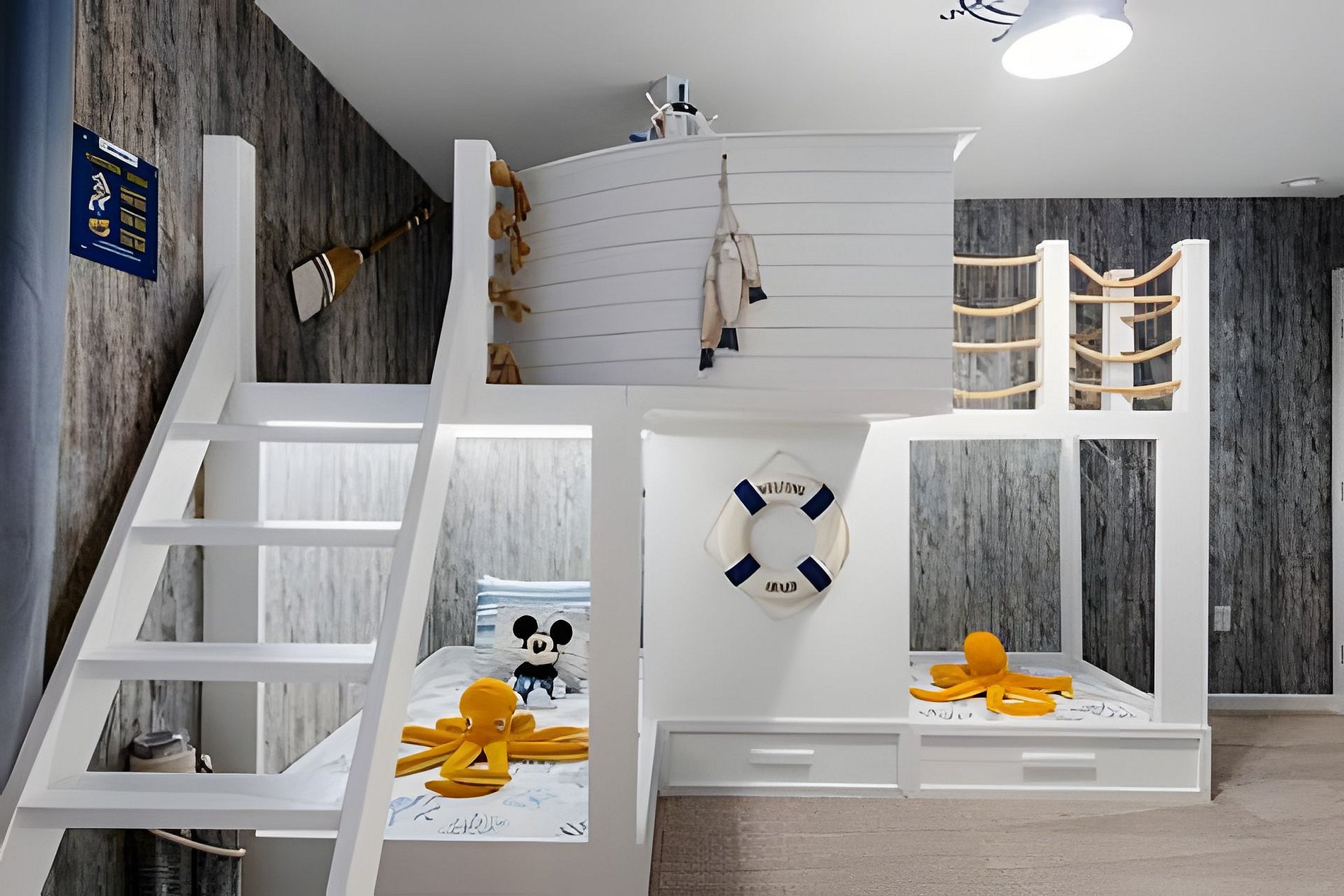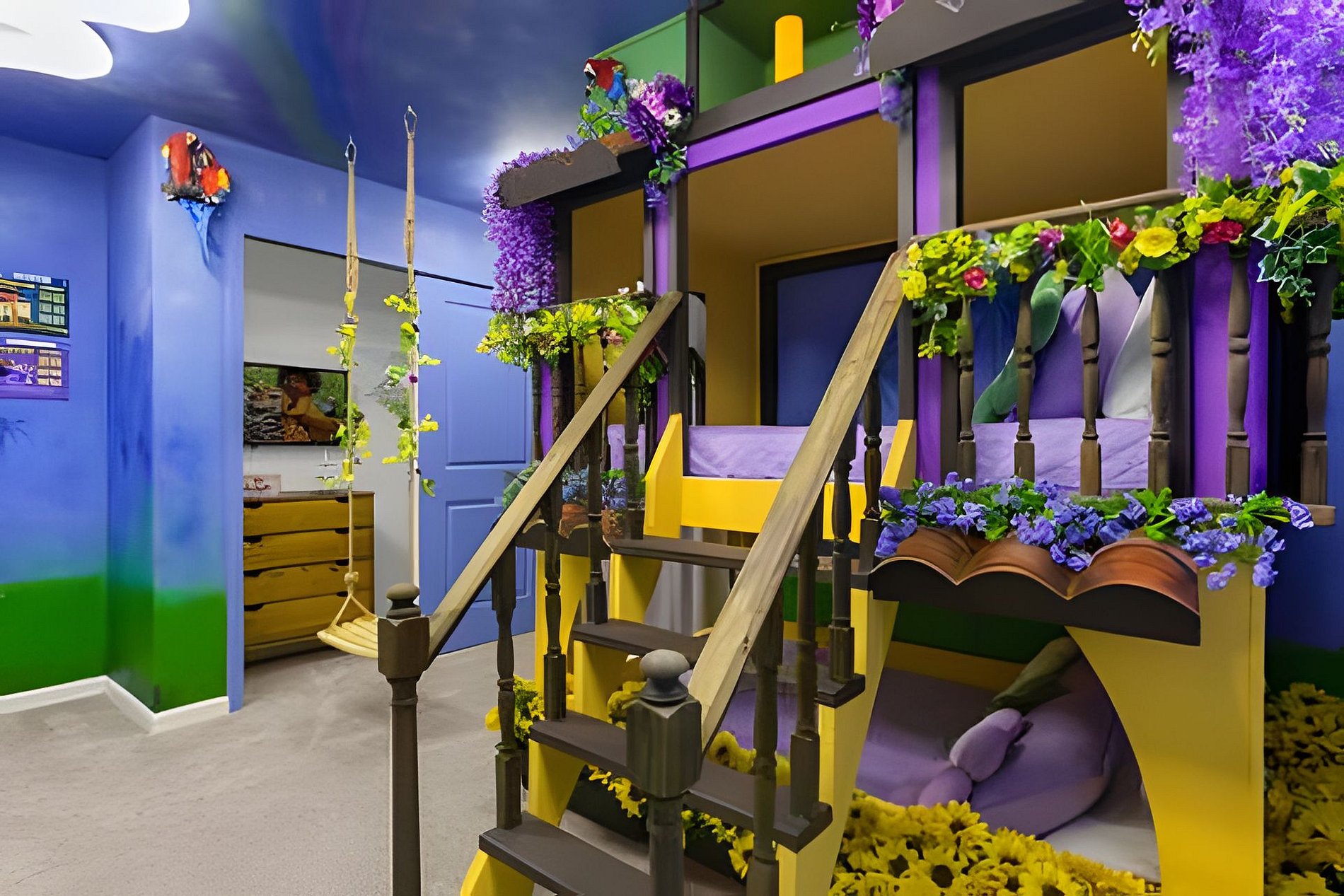 1ST FLOOR -Bedroom 1: With King bed, suite; 2ND FLOOR -Bedroom 2: With one King bed, shared suite; -Bedroom 3: Bunk bed, with two full beds, + 1 twin -auxiliary bed, Mario Bross with slide, shared suite; -Bedroom 4: Bunk bed, with two Twin beds + 1 twin auxiliary bed, shared suite; -Bedroom 5: With King bed, shared suite; -Bedroom 6: Bunk bed, with two full beds, Encanto, shared suite; -Bedroom 7: With two twin beds, Mickey, shared suite; -Bedroom 8: With one King bed, suite; -Bedroom 9: Bunk bed, with 1 Full bed + 1 twin bed, -Harry Potter; THIS HOUSE HAS 02 FULL SUITES AND 6 SHARED SUITES.