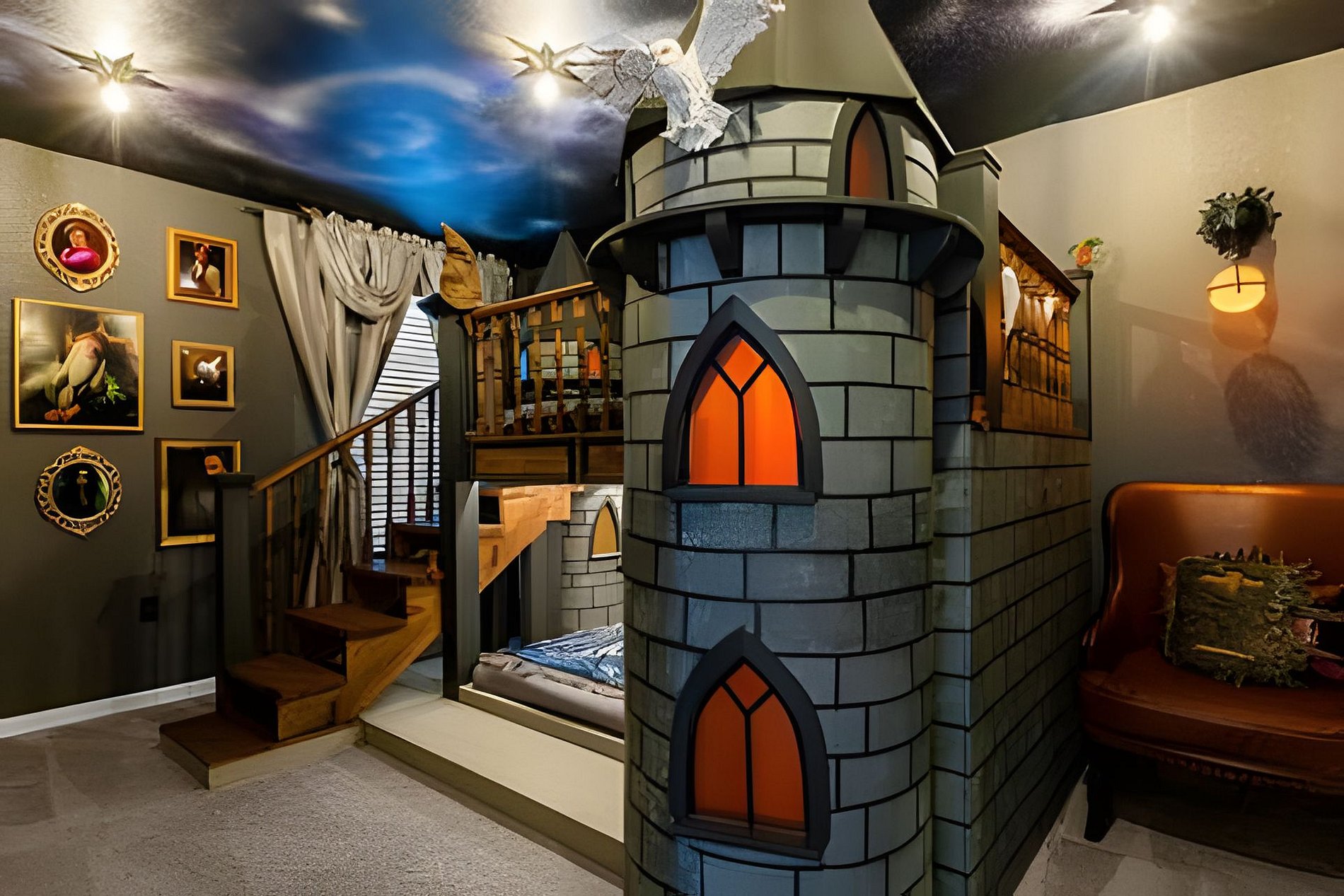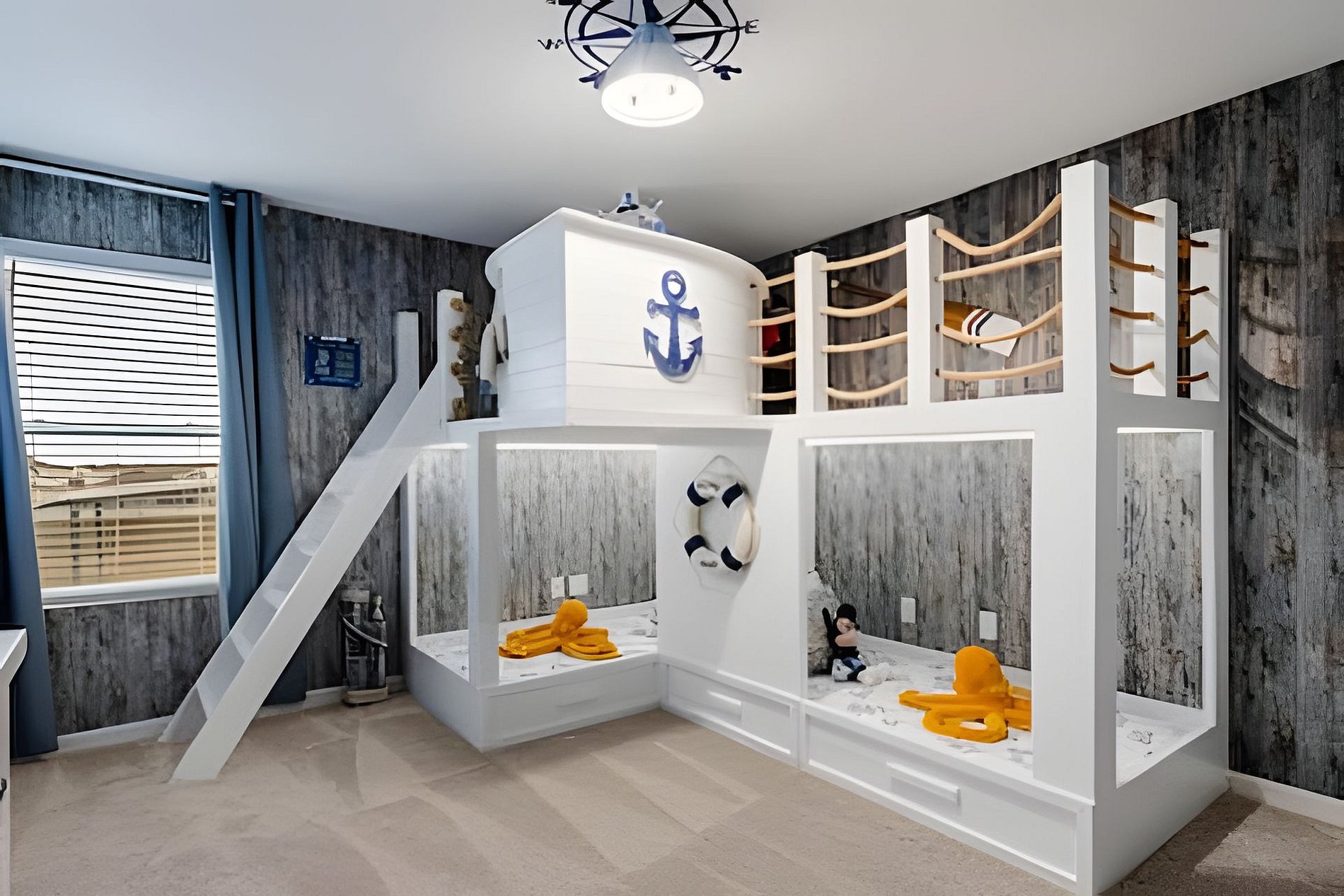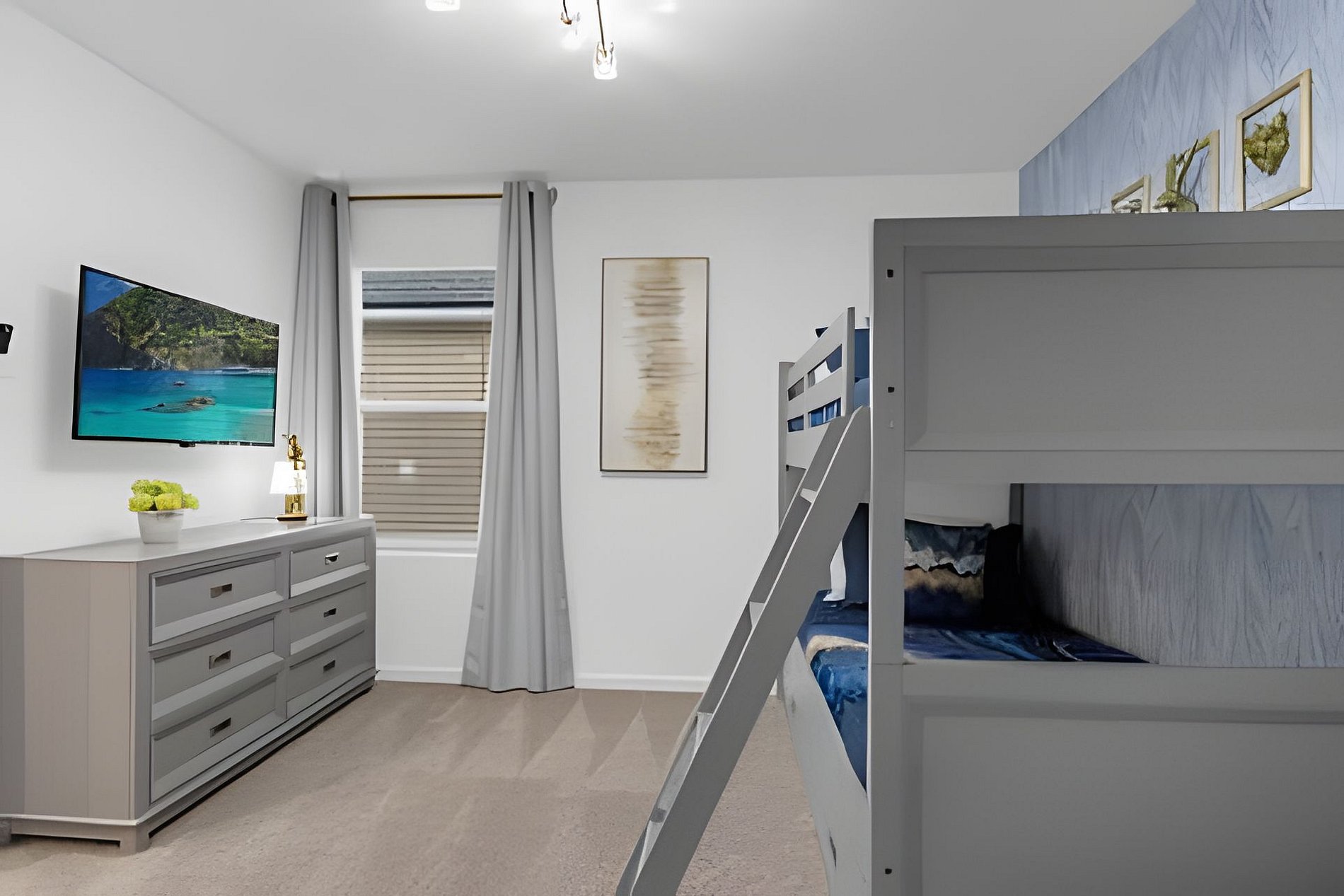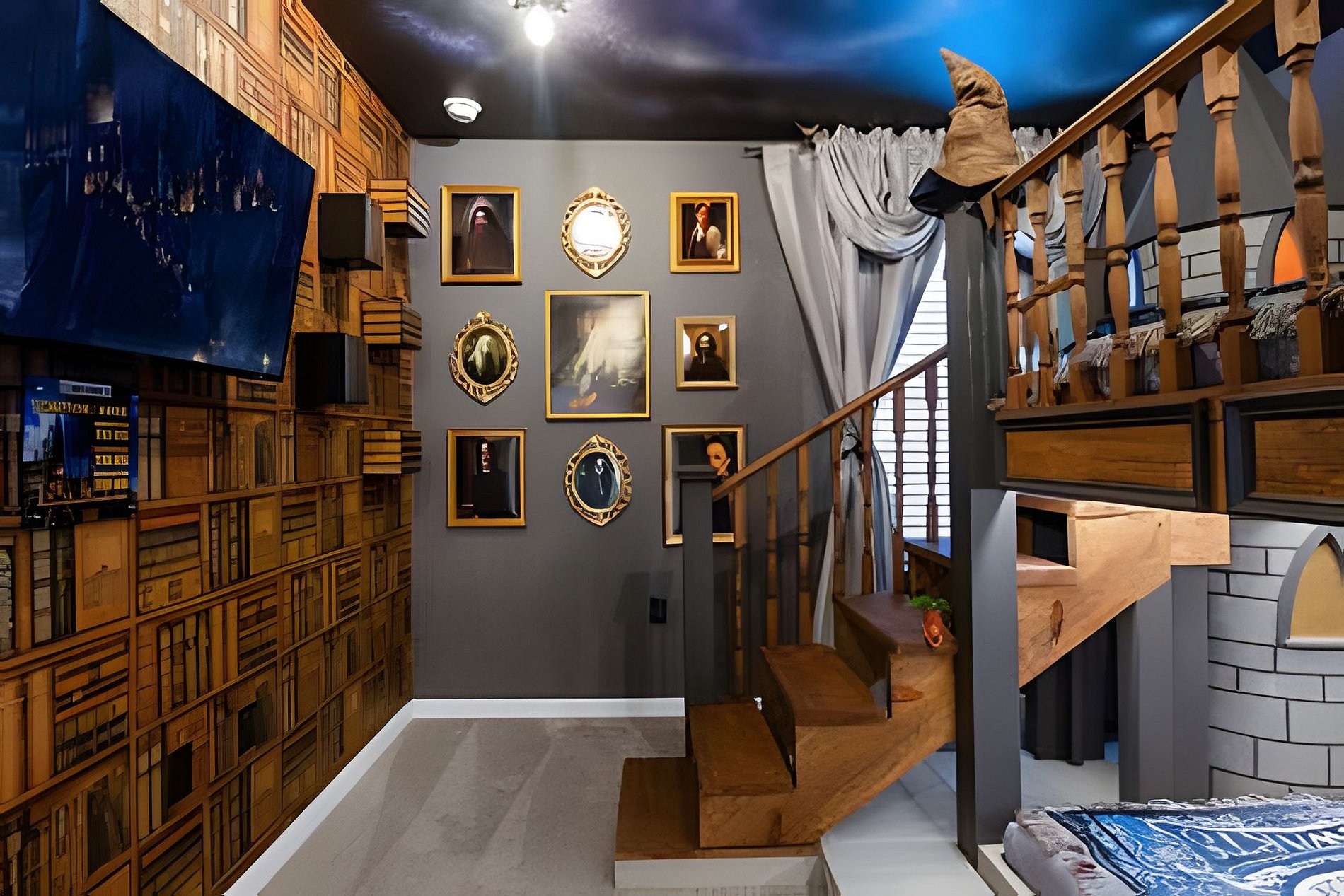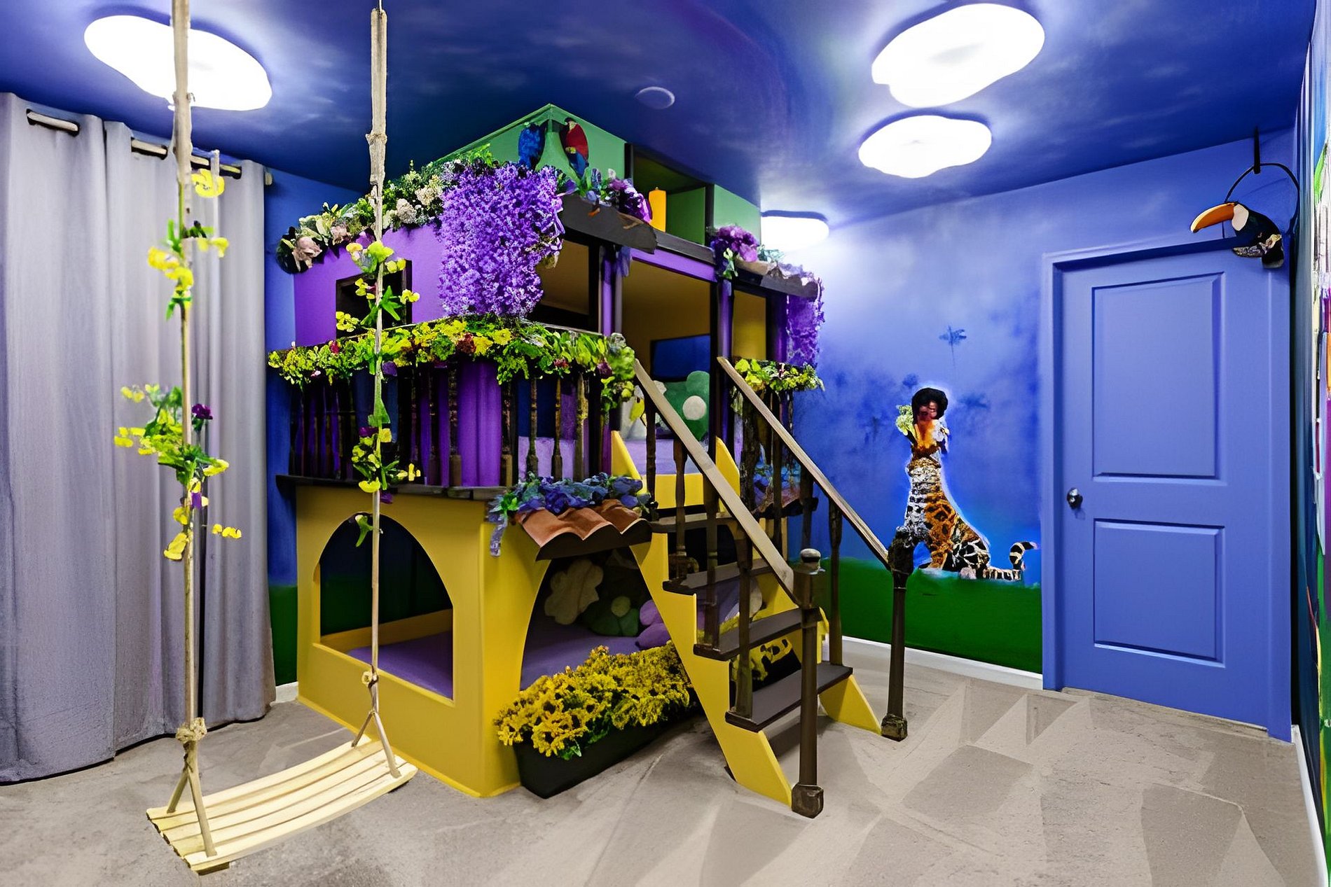 1ST FLOOR -Bedroom 1: With King bed, suite; 2ND FLOOR -Bedroom 2: With one King bed, shared suite; -Bedroom 3: Bunk bed, with two full beds, + 1 twin -auxiliary bed, Mario Bross with slide, shared suite; -Bedroom 4: Bunk bed, with two Twin beds + 1 twin auxiliary bed, shared suite; -Bedroom 5: With King bed, shared suite; -Bedroom 6: Bunk bed, with two full beds, Encanto, shared suite; -Bedroom 7: With two twin beds, Mickey, shared suite; -Bedroom 8: With one King bed, suite; -Bedroom 9: Bunk bed, with 1 Full bed + 1 twin bed, -Harry Potter; THIS HOUSE HAS 02 FULL SUITES AND 6 SHARED SUITES.