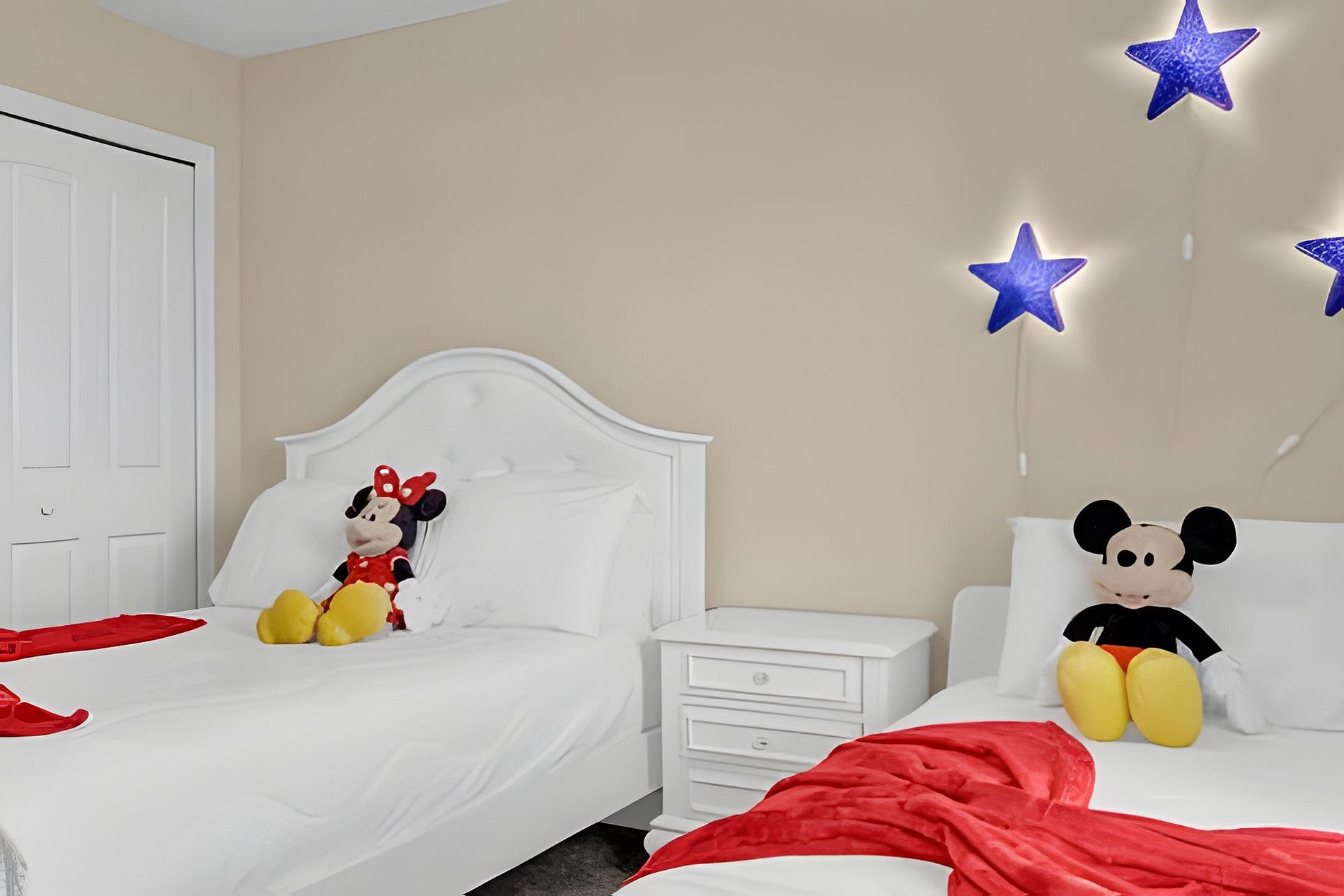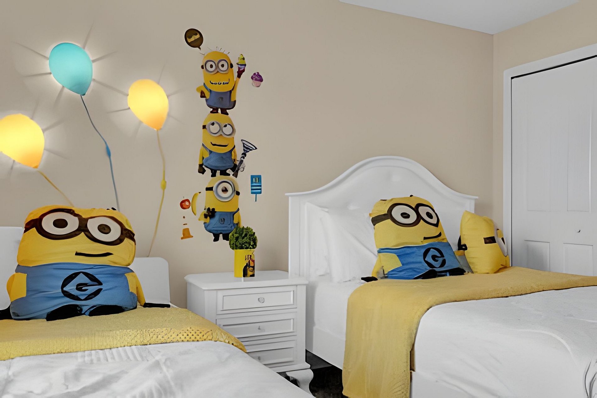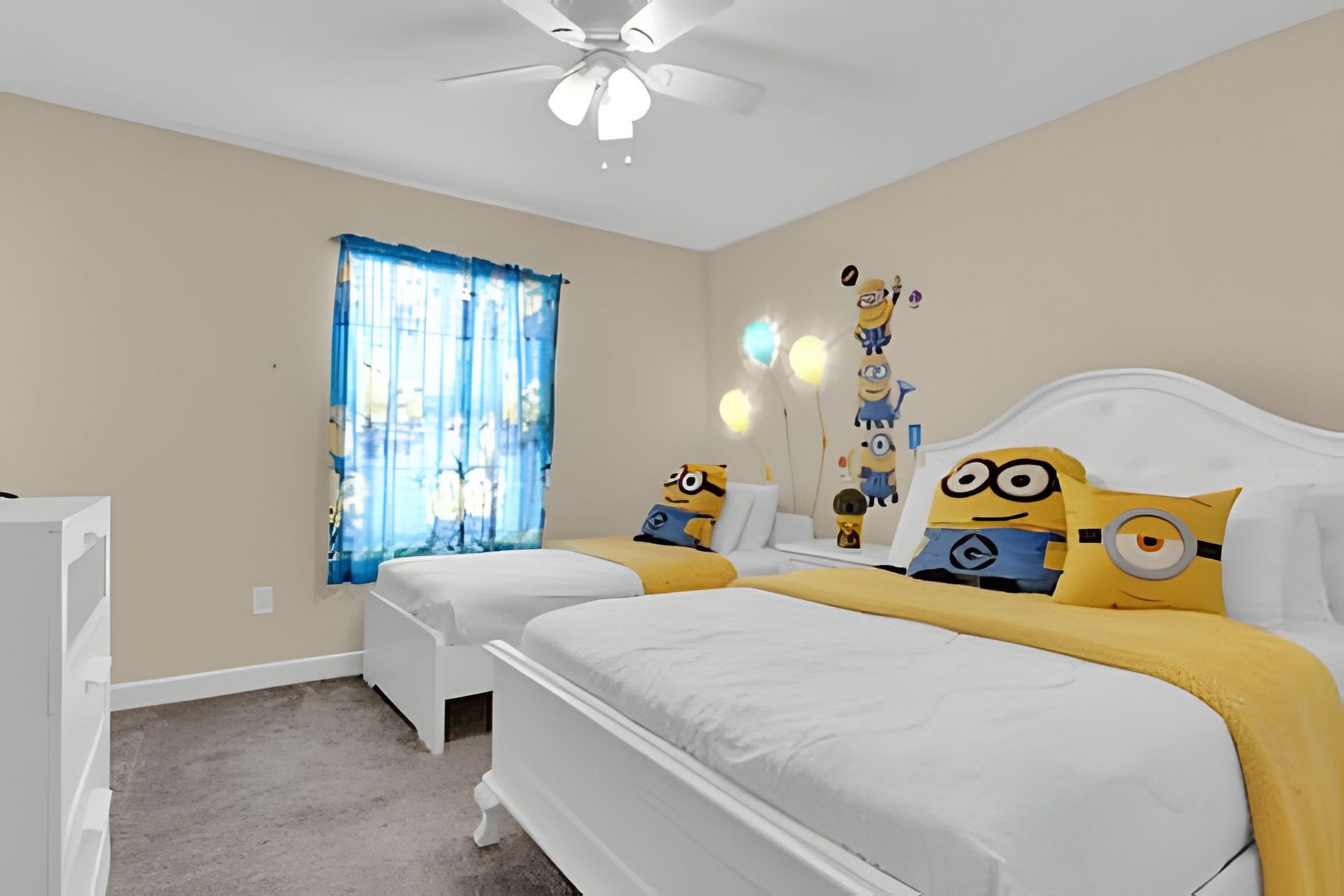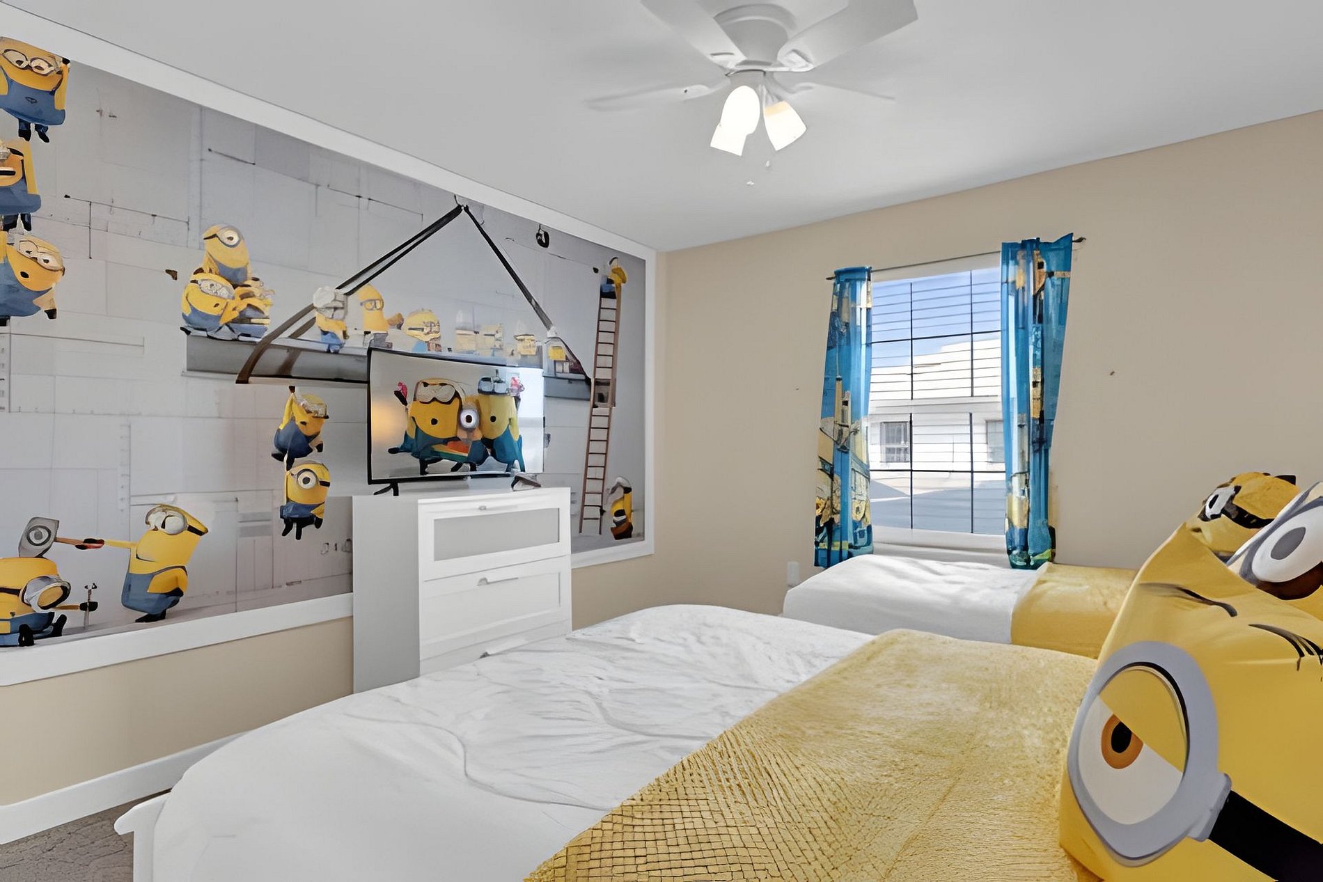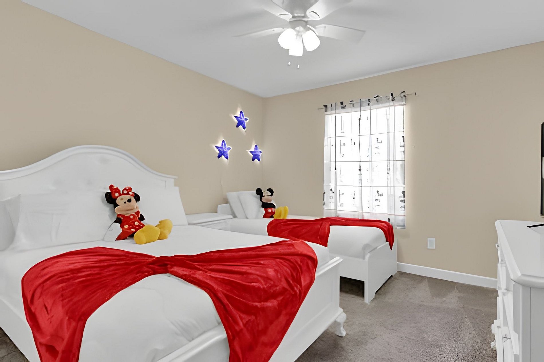 1ST FLOOR: Bedroom 1: With a king size bed, Suite. 2ND FLOOR: Bedroom 2: With a king size bed, Suite; Bedroom 3: With two beds, 1 full bed + 1 twin bed, Minions; Bedroom 4: With two beds, 1 full bed + 1 twin bed, Mickey; THE HOUSE HAS 2 SUITES.