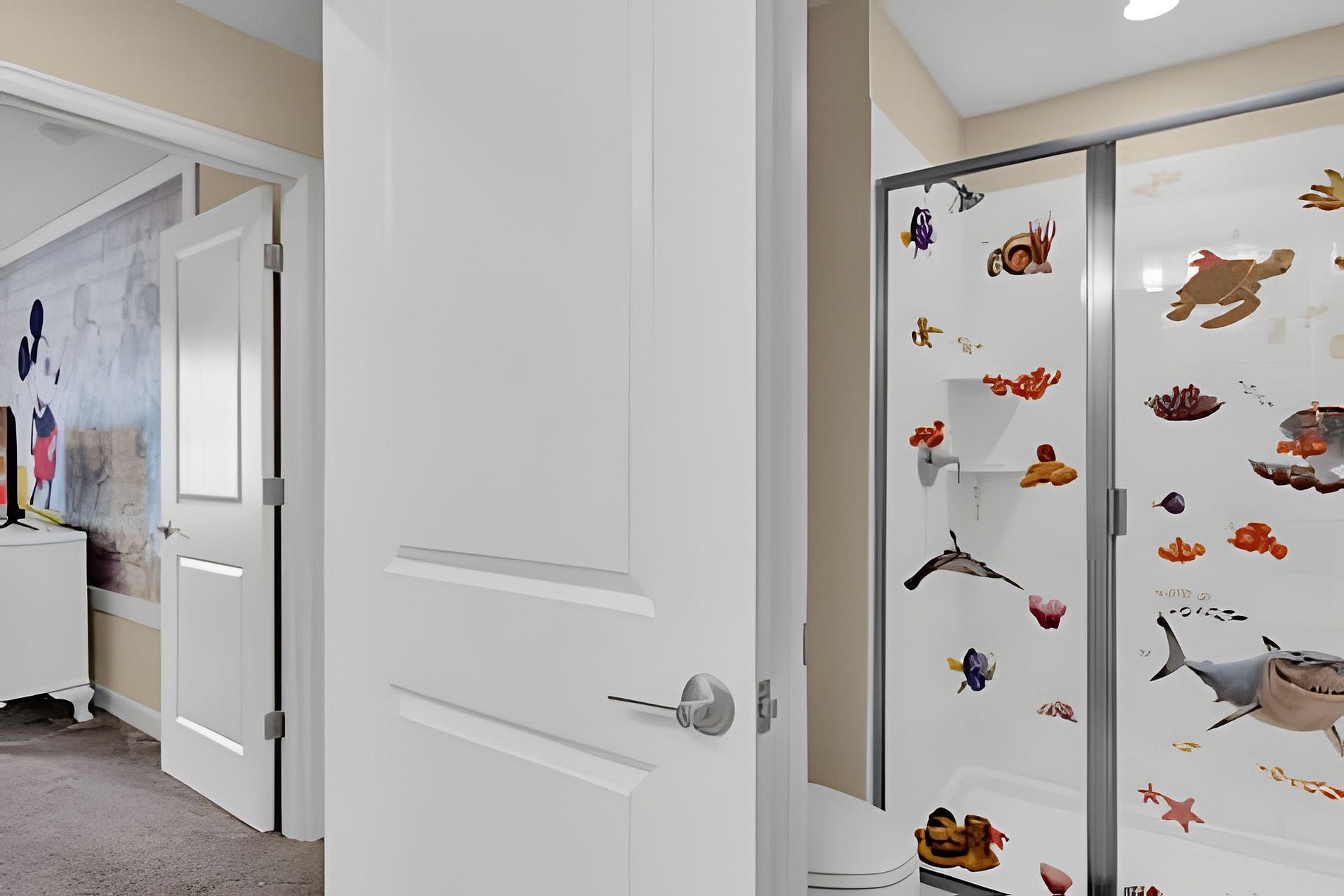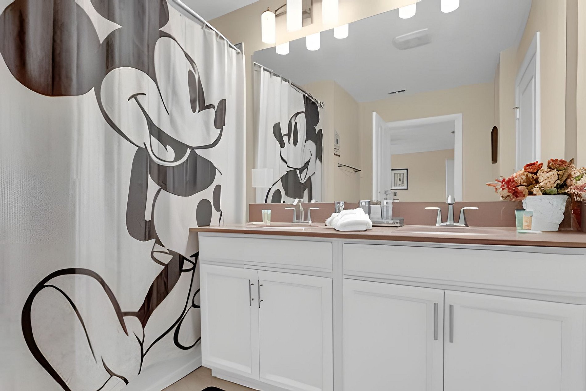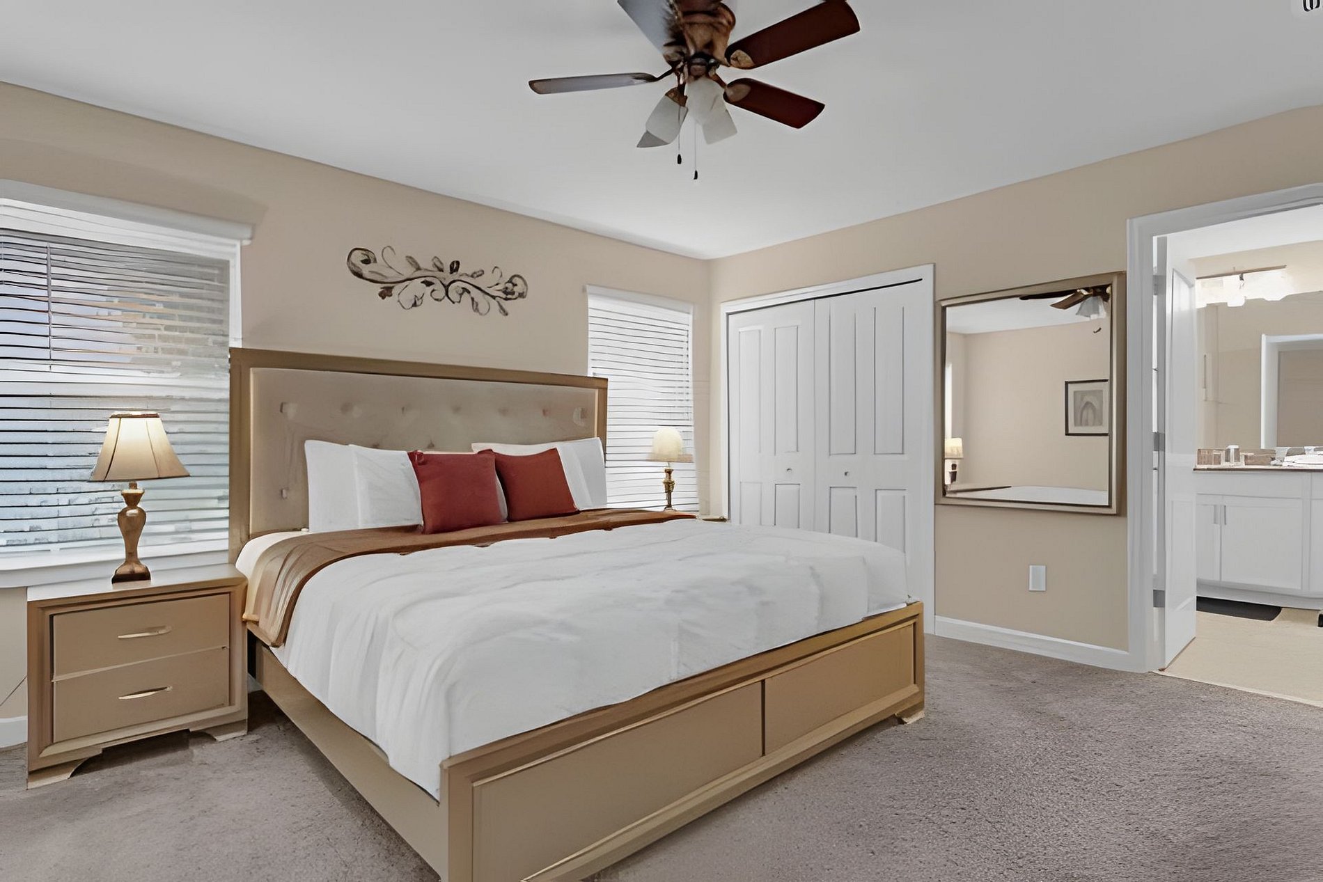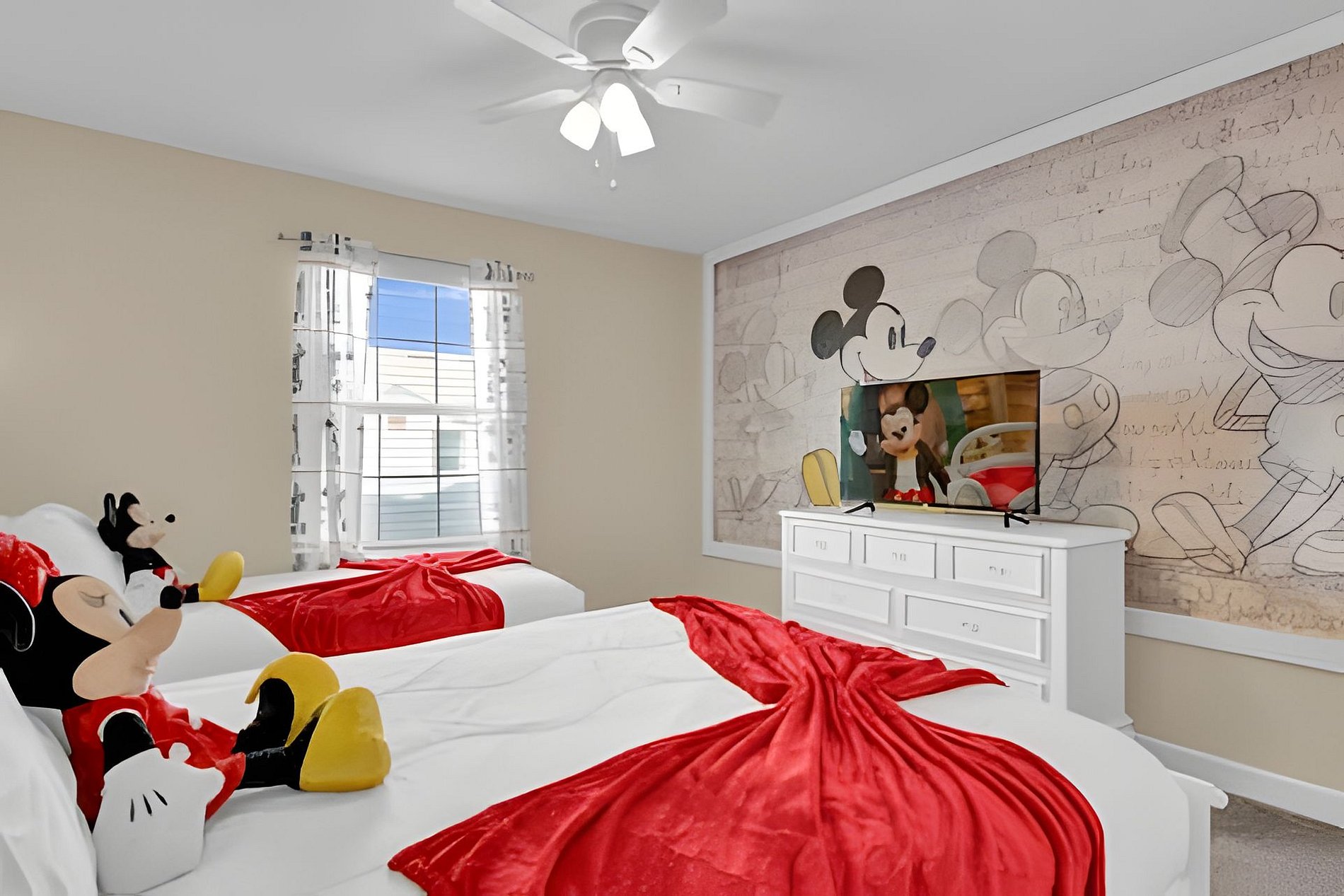1ST FLOOR: Bedroom 1: With a king size bed, Suite. 2ND FLOOR: Bedroom 2: With a king size bed, Suite; Bedroom 3: With two beds, 1 full bed + 1 twin bed, Minions; Bedroom 4: With two beds, 1 full bed + 1 twin bed, Mickey; THE HOUSE HAS 2 SUITES.