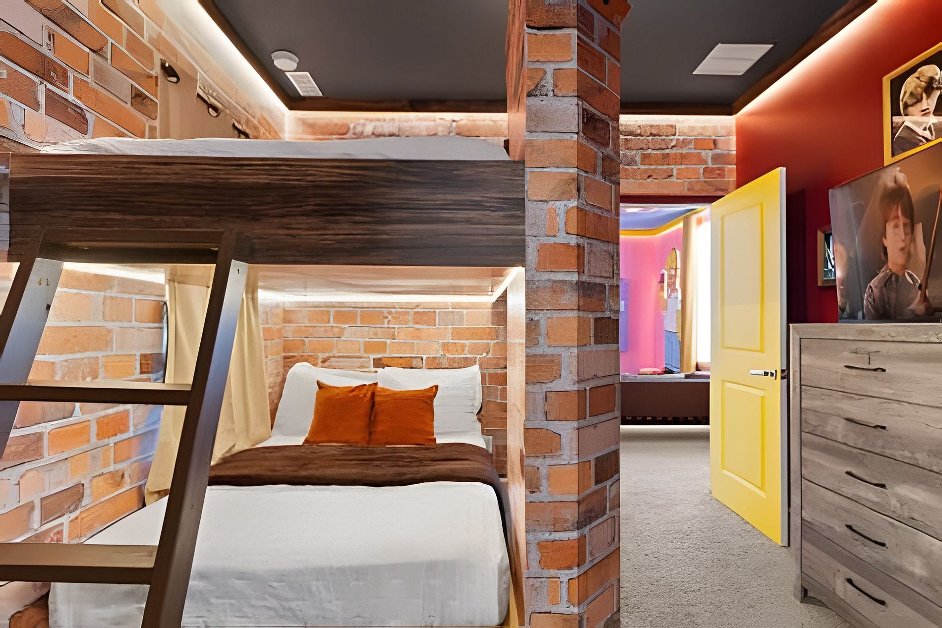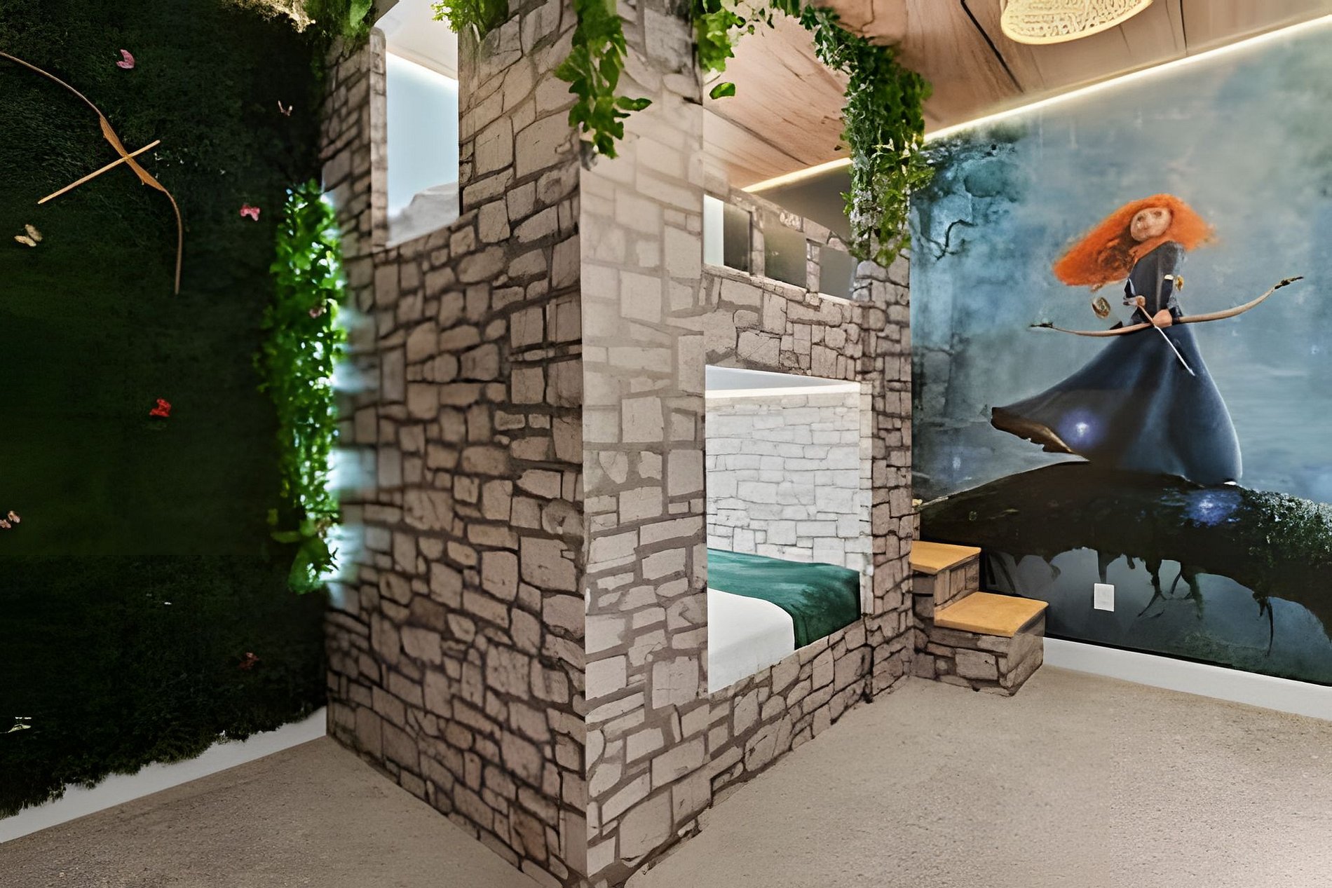 1ST FLOOR - 1st bedroom; 1 king size bed; Suite; 2ND FLOOR - 2nd bedroom; Suite with 1 king size bed, Suite; - 3rd bedroom; Suite with 02 single beds, Suite; - 4th bedroom; harry potter 01 bunk bed with full bed, Shared Suite; - 5th bedroom; princess Merida 01 bunk bed with full bed, Shared Suite; THE HOUSE HAS 3 COMPLETE SUITES AND 2 SHARED.
