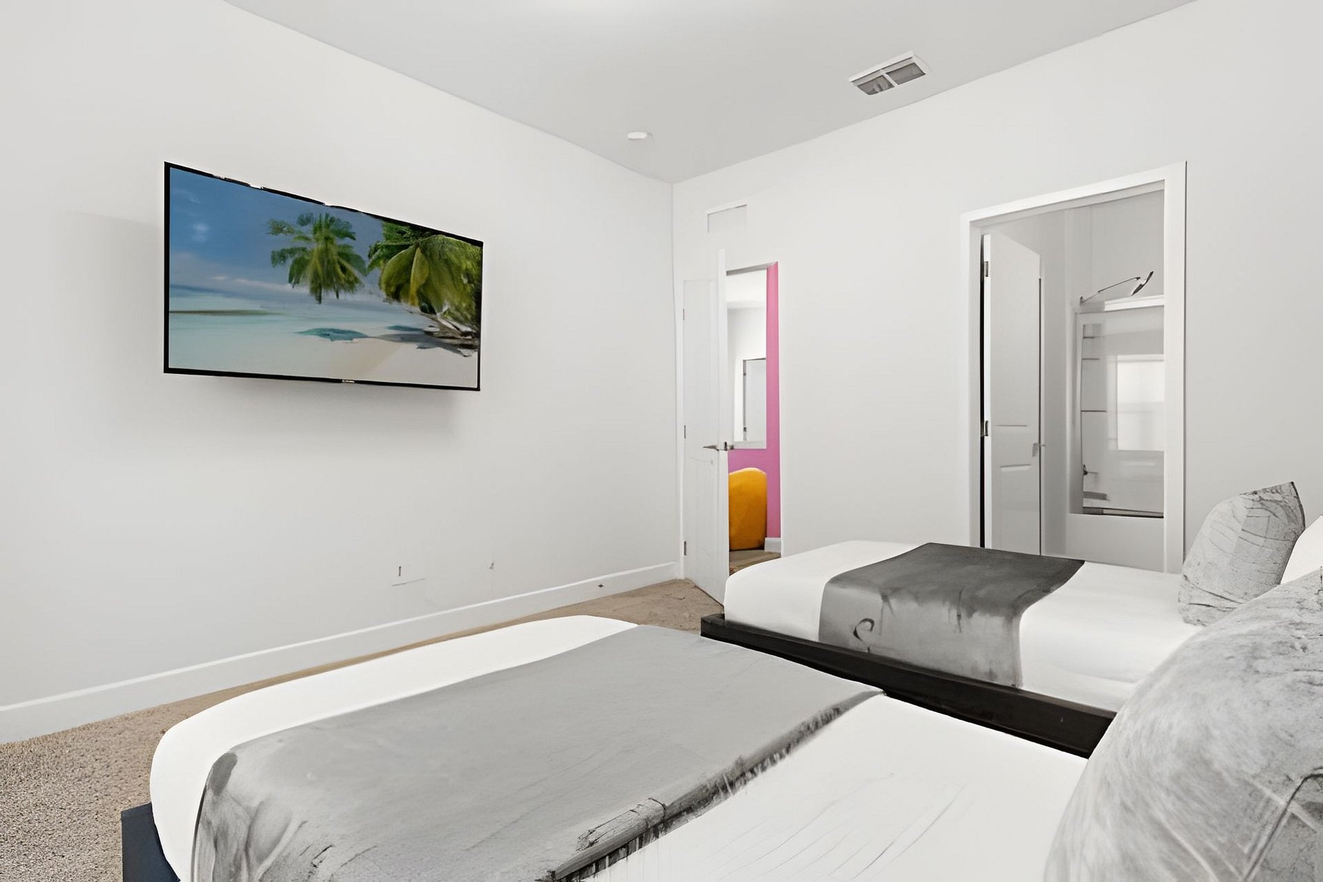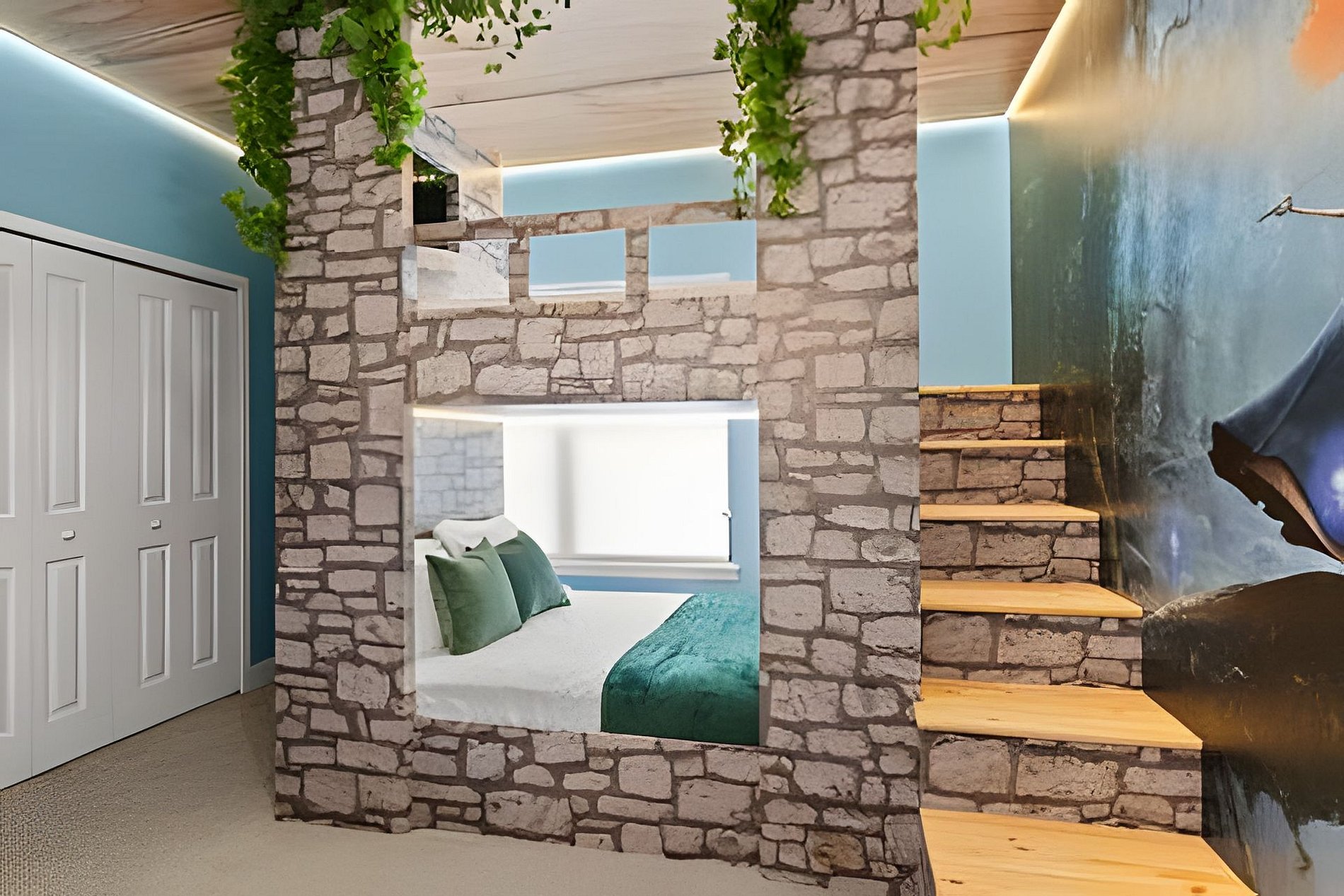 1ST FLOOR - 1st bedroom; 1 king size bed; Suite; 2ND FLOOR - 2nd bedroom; Suite with 1 king size bed, Suite; - 3rd bedroom; Suite with 02 single beds, Suite; - 4th bedroom; harry potter 01 bunk bed with full bed, Shared Suite; - 5th bedroom; princess Merida 01 bunk bed with full bed, Shared Suite; THE HOUSE HAS 3 COMPLETE SUITES AND 2 SHARED.