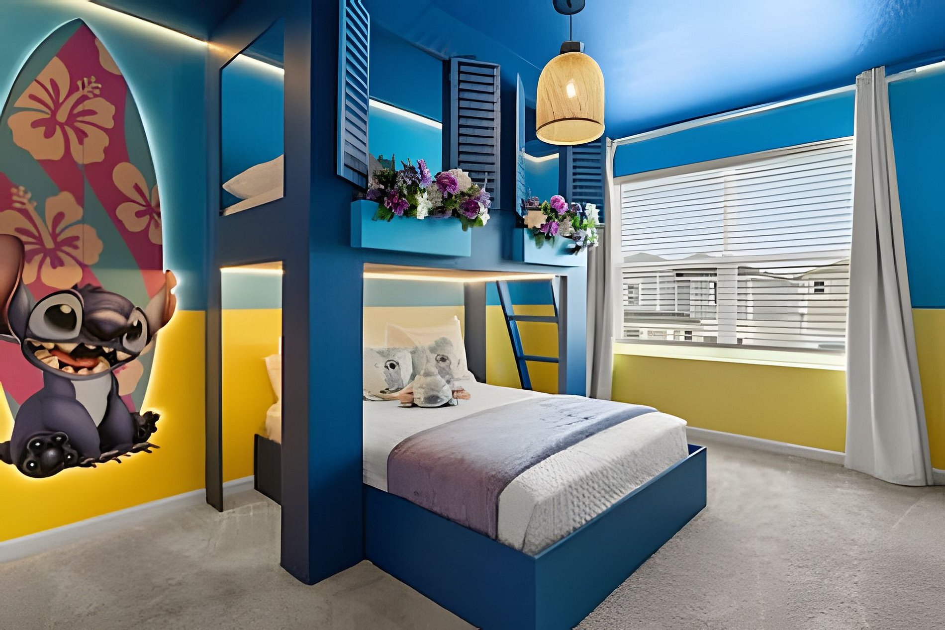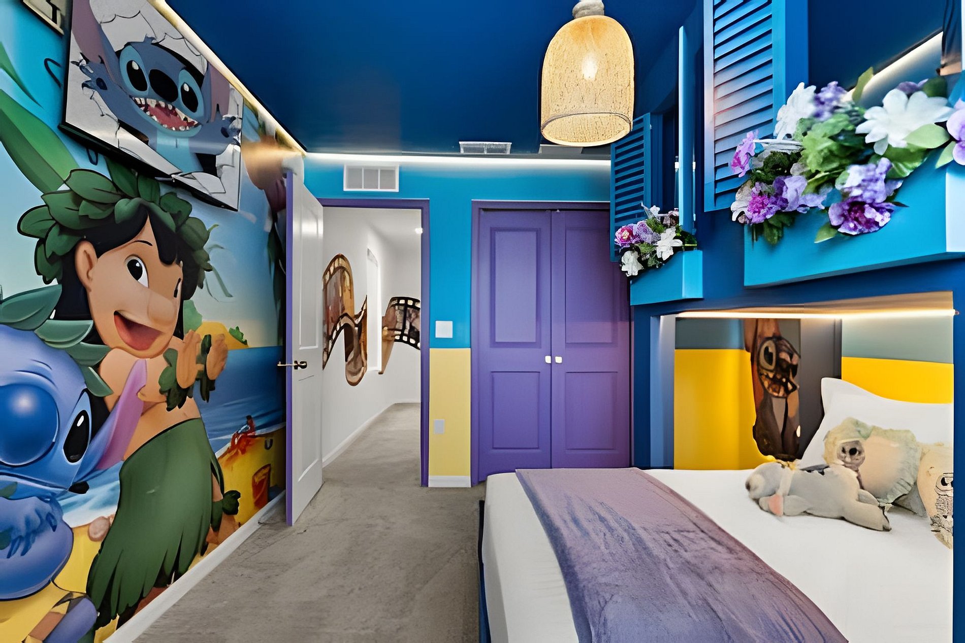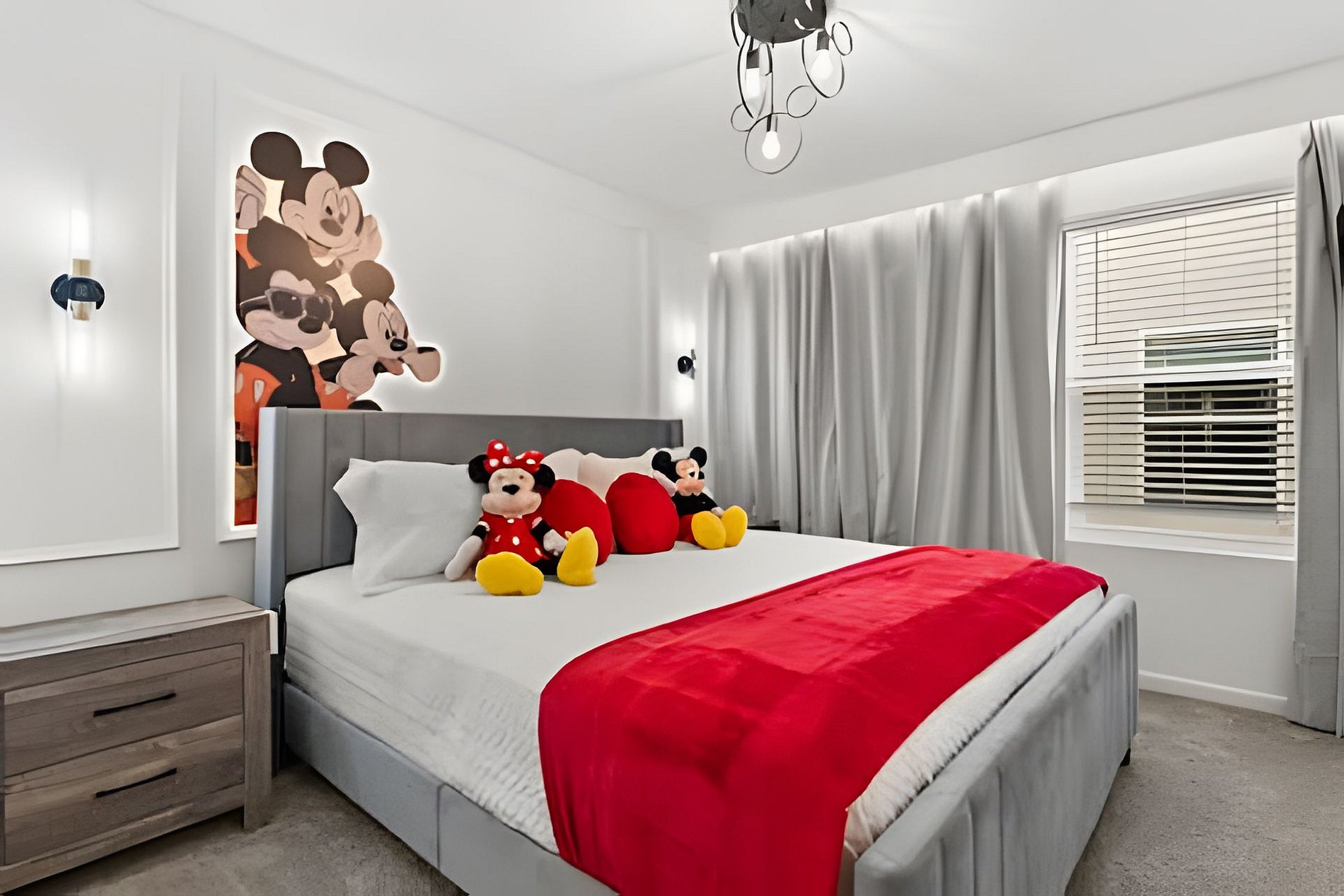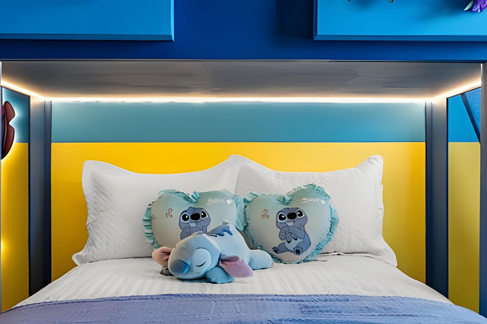 1st Floor Bedroom 1: Two Queen beds, private ensuite. 2nd Floor Bedroom 2: One King bed (Mickey). Bedroom 3: One King bed. Bedroom 4: One King bed, shared ensuite. Bedroom 5: Bunk bed with two Full beds (Minions), shared ensuite. Bedroom 6: Bunk bed with one Full + one Twin bed (Lilo & Stitch). THIS HOUSE HAS 1 ENTIRE SUITE AND 2 SHARED BEDROOMS.