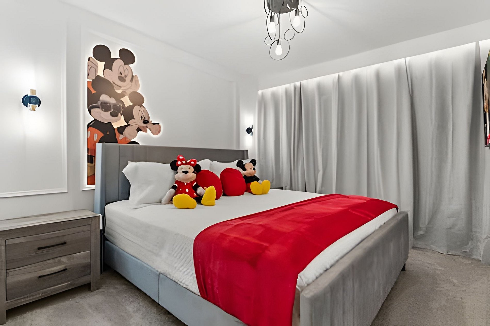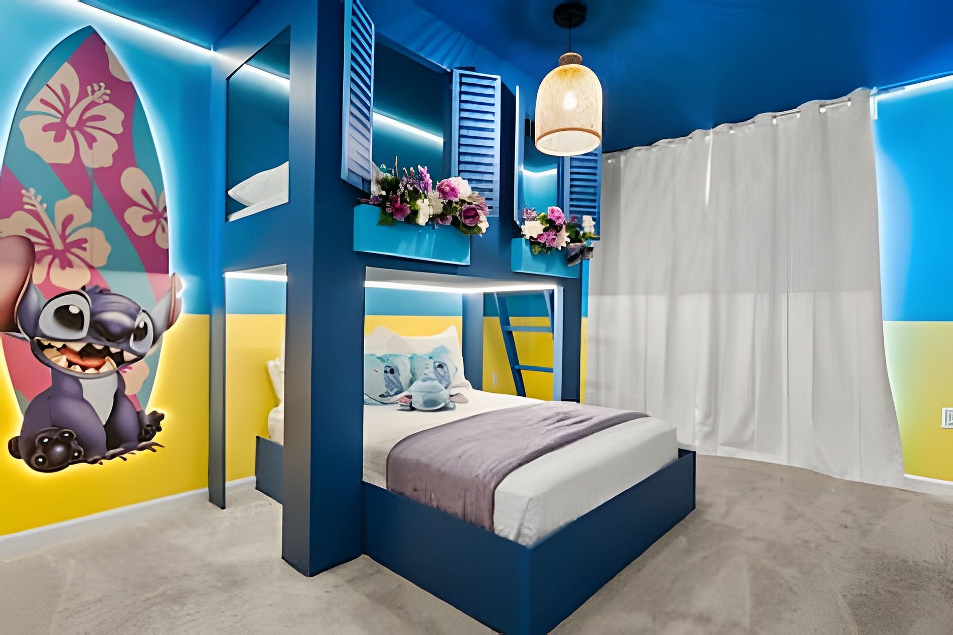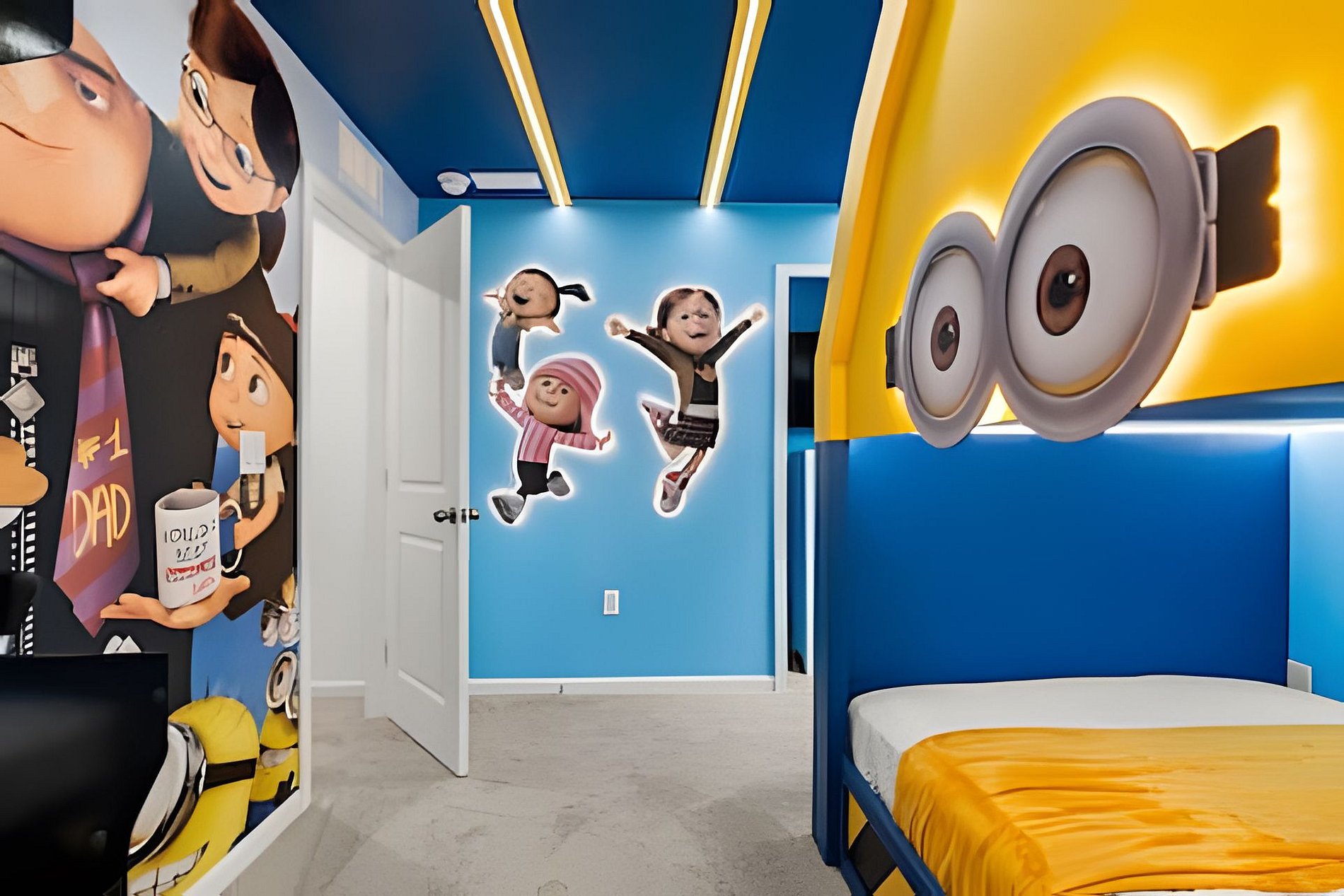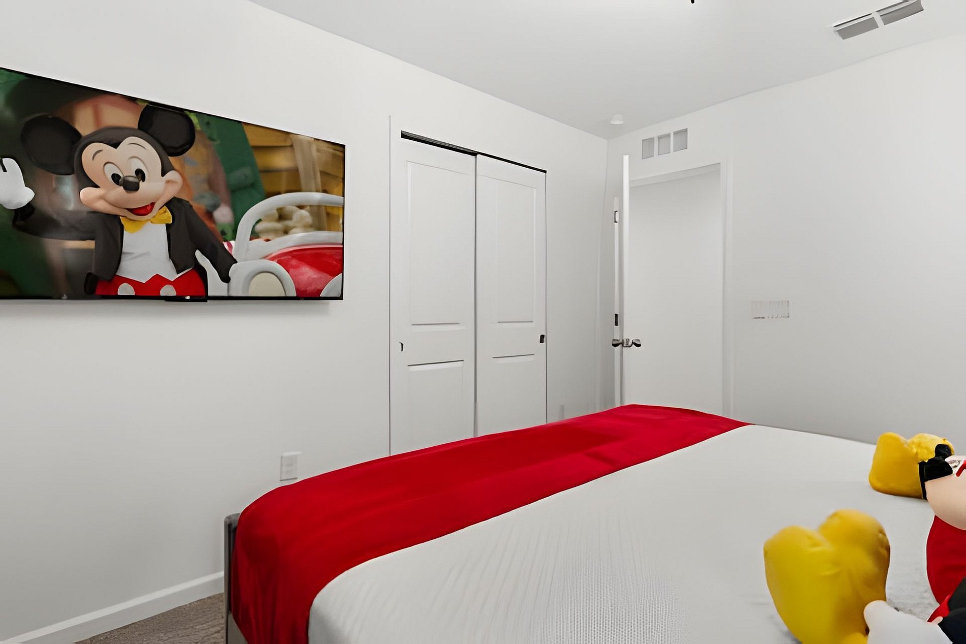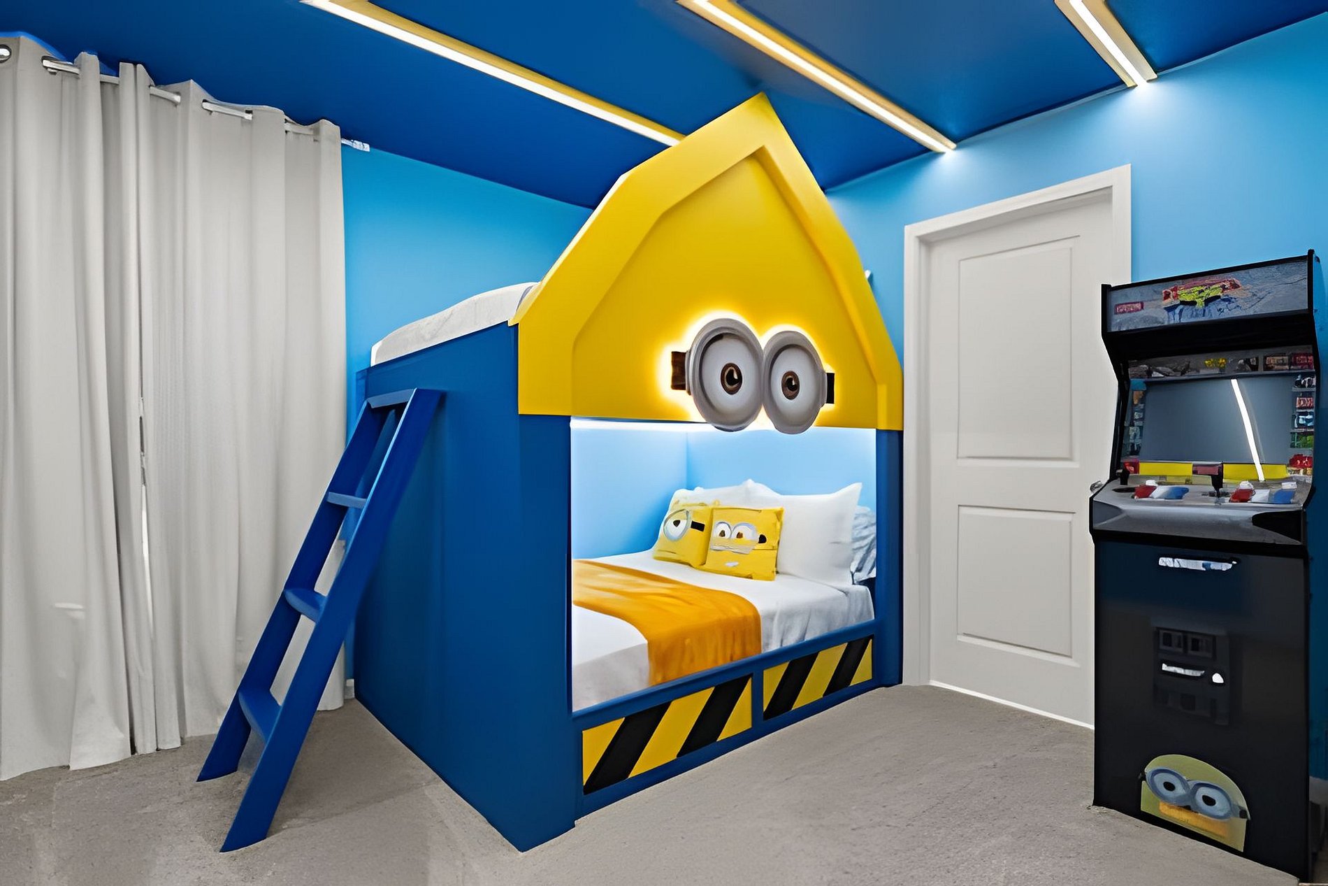 1st Floor Bedroom 1: Two Queen beds, private ensuite. 2nd Floor Bedroom 2: One King bed (Mickey). Bedroom 3: One King bed. Bedroom 4: One King bed, shared ensuite. Bedroom 5: Bunk bed with two Full beds (Minions), shared ensuite. Bedroom 6: Bunk bed with one Full + one Twin bed (Lilo & Stitch). THIS HOUSE HAS 1 ENTIRE SUITE AND 2 SHARED BEDROOMS.