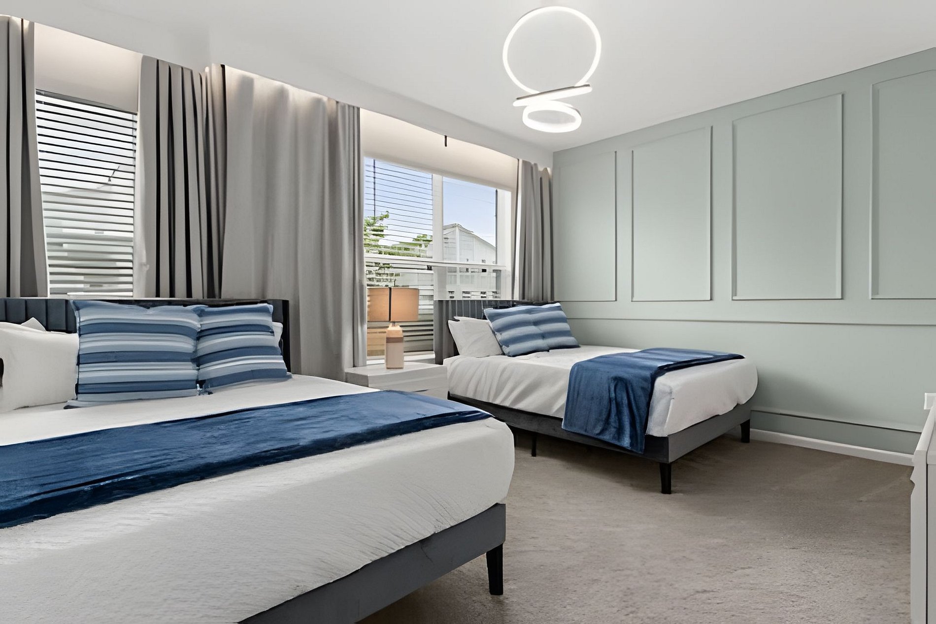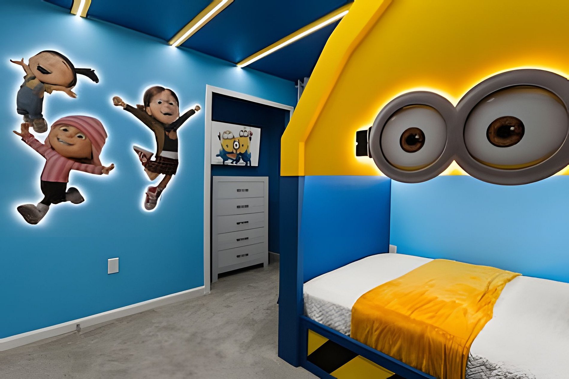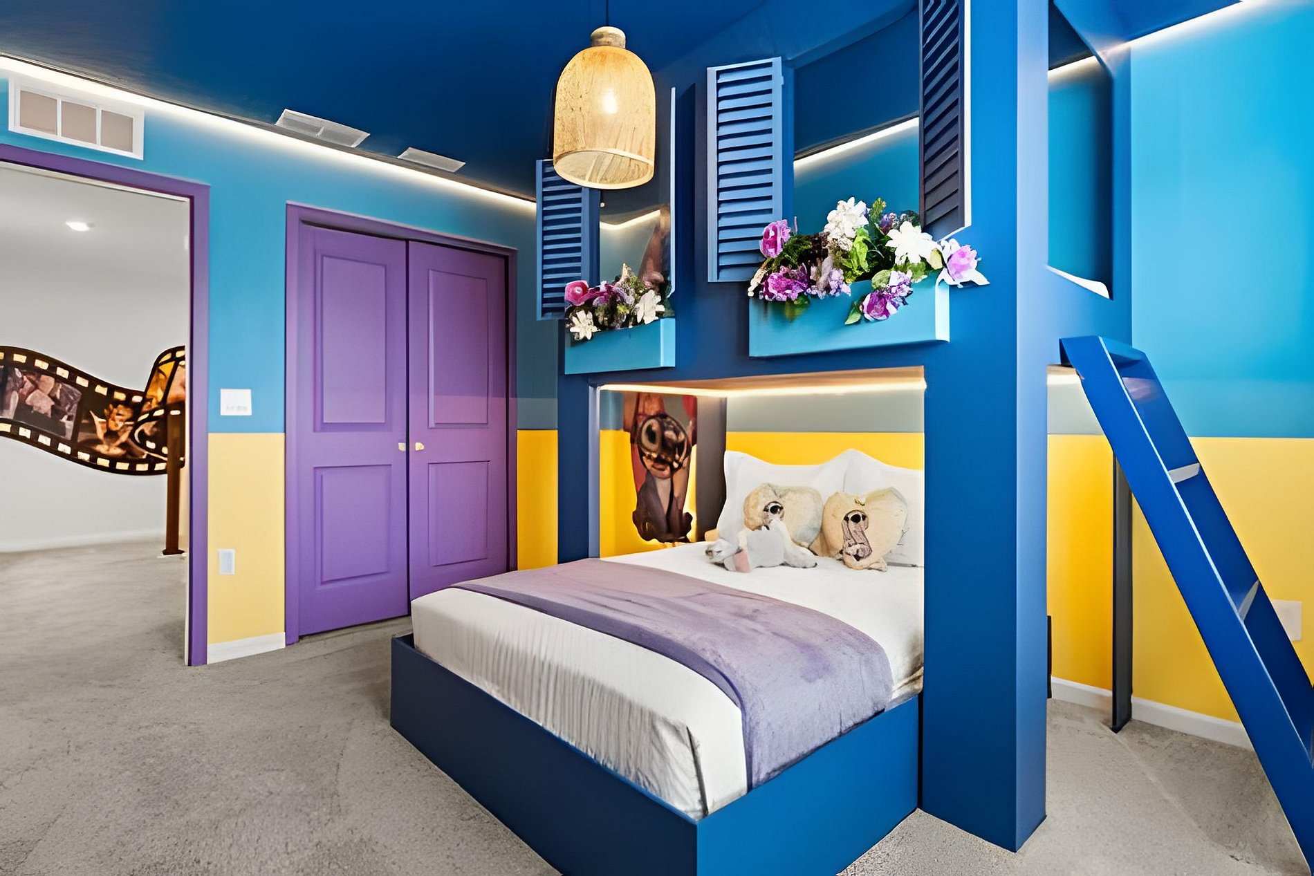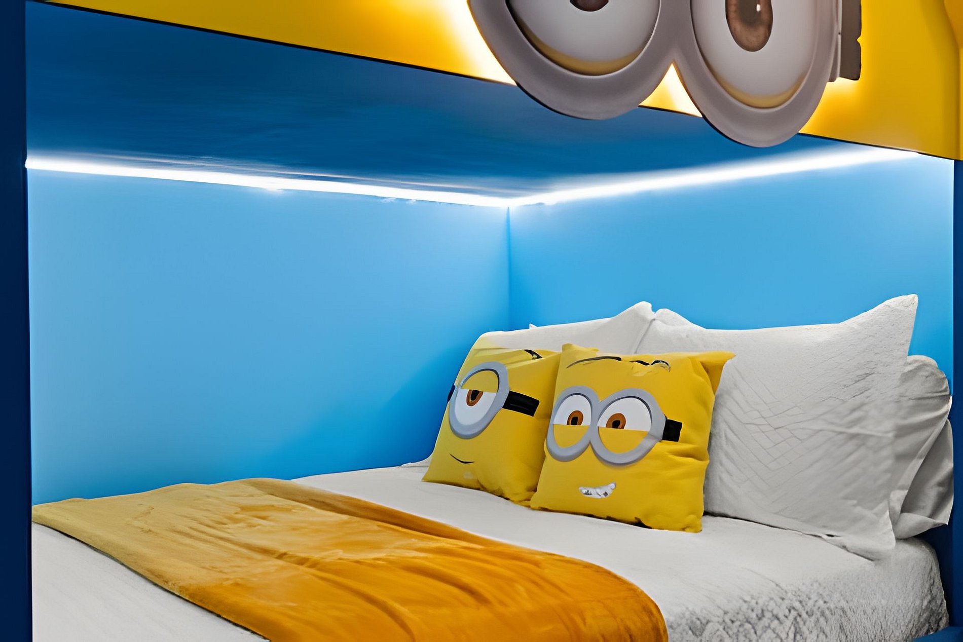 1st Floor Bedroom 1: Two Queen beds, private ensuite. 2nd Floor Bedroom 2: One King bed (Mickey). Bedroom 3: One King bed. Bedroom 4: One King bed, shared ensuite. Bedroom 5: Bunk bed with two Full beds (Minions), shared ensuite. Bedroom 6: Bunk bed with one Full + one Twin bed (Lilo & Stitch). THIS HOUSE HAS 1 ENTIRE SUITE AND 2 SHARED BEDROOMS.