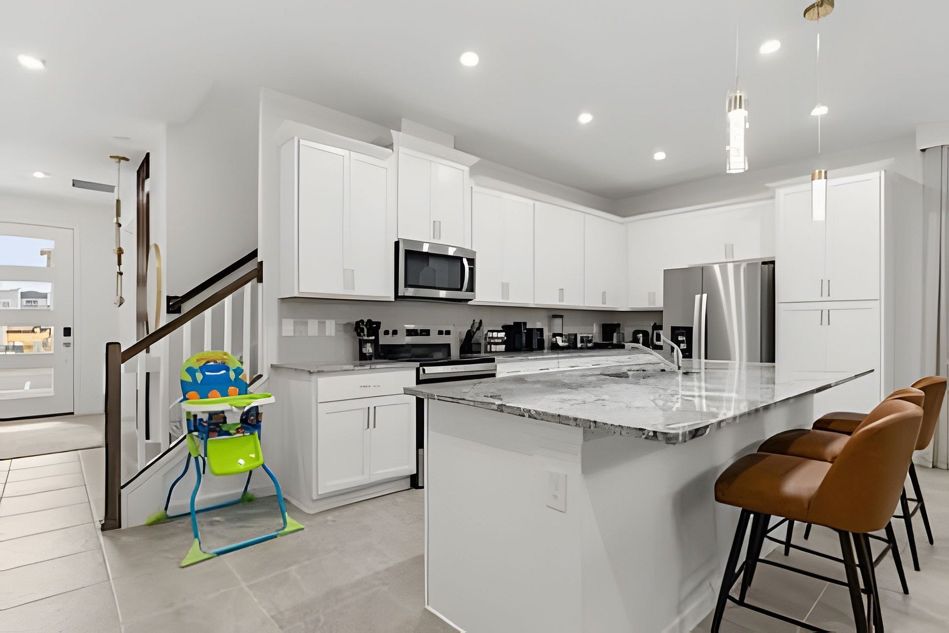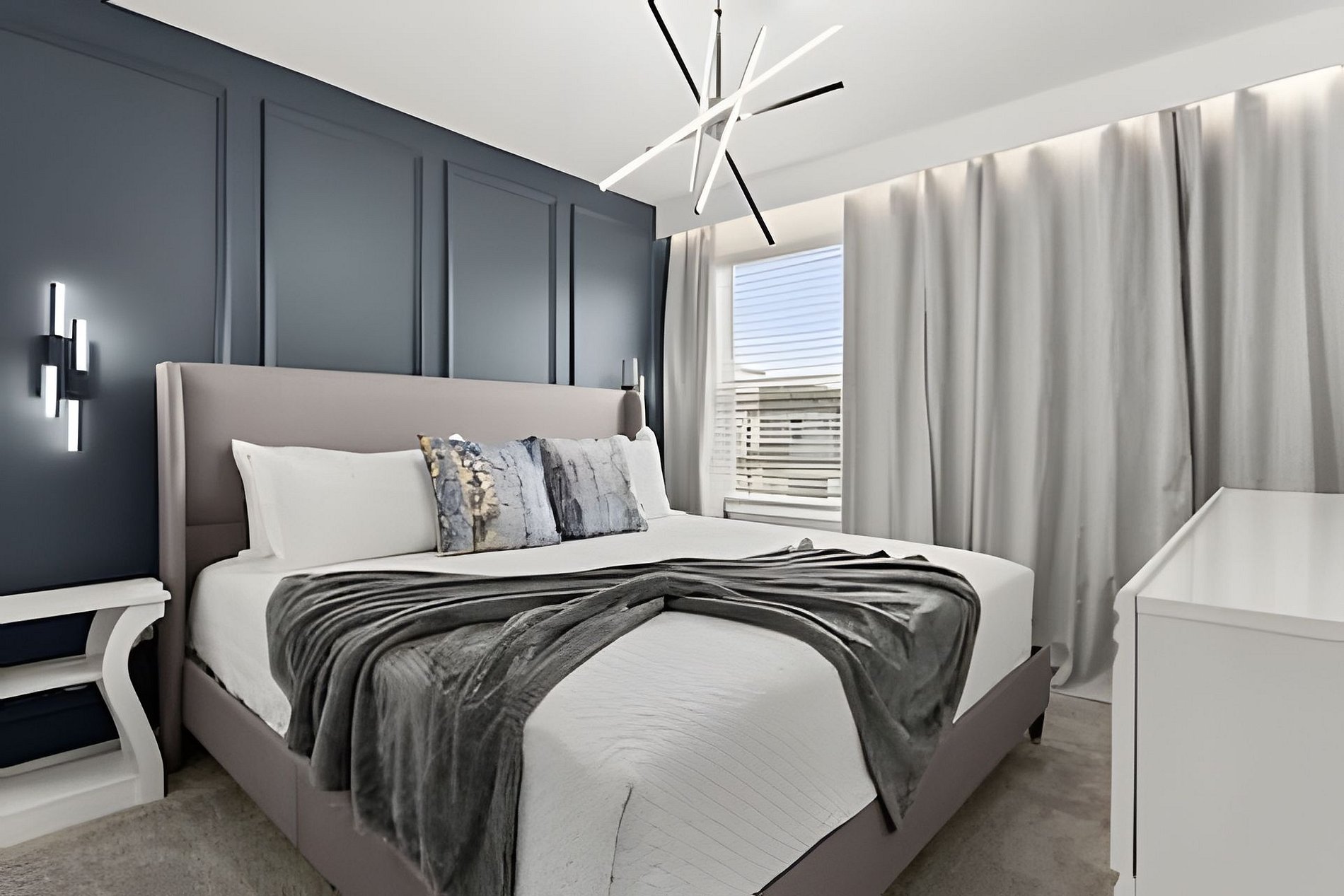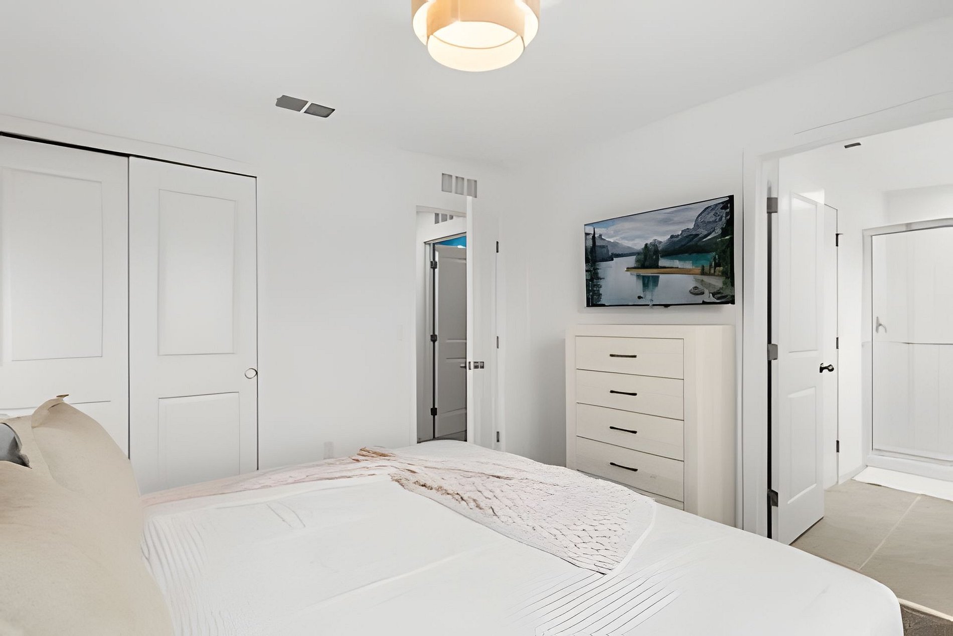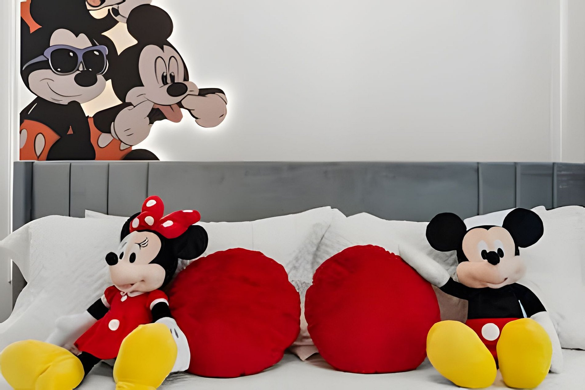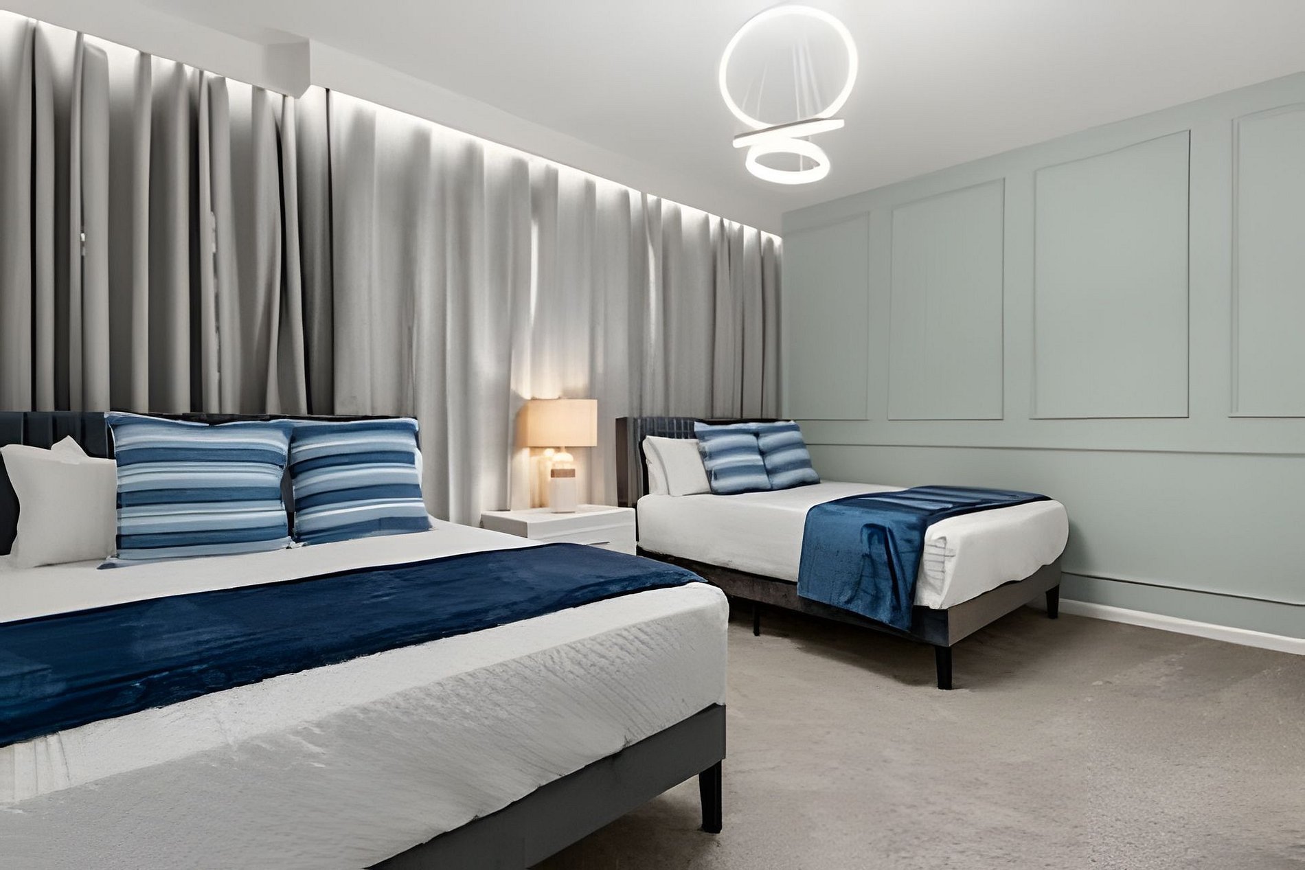 1st Floor Bedroom 1: Two Queen beds, private ensuite. 2nd Floor Bedroom 2: One King bed (Mickey). Bedroom 3: One King bed. Bedroom 4: One King bed, shared ensuite. Bedroom 5: Bunk bed with two Full beds (Minions), shared ensuite. Bedroom 6: Bunk bed with one Full + one Twin bed (Lilo & Stitch). THIS HOUSE HAS 1 ENTIRE SUITE AND 2 SHARED BEDROOMS.