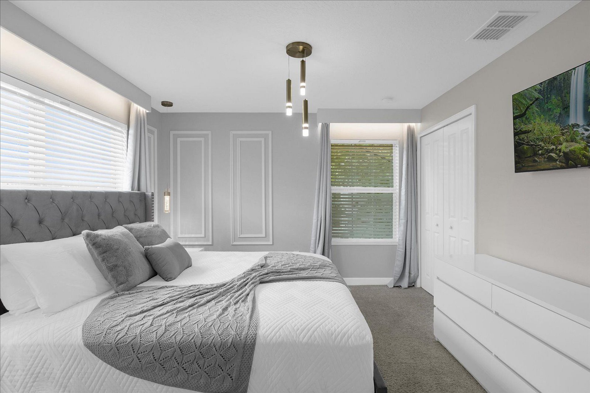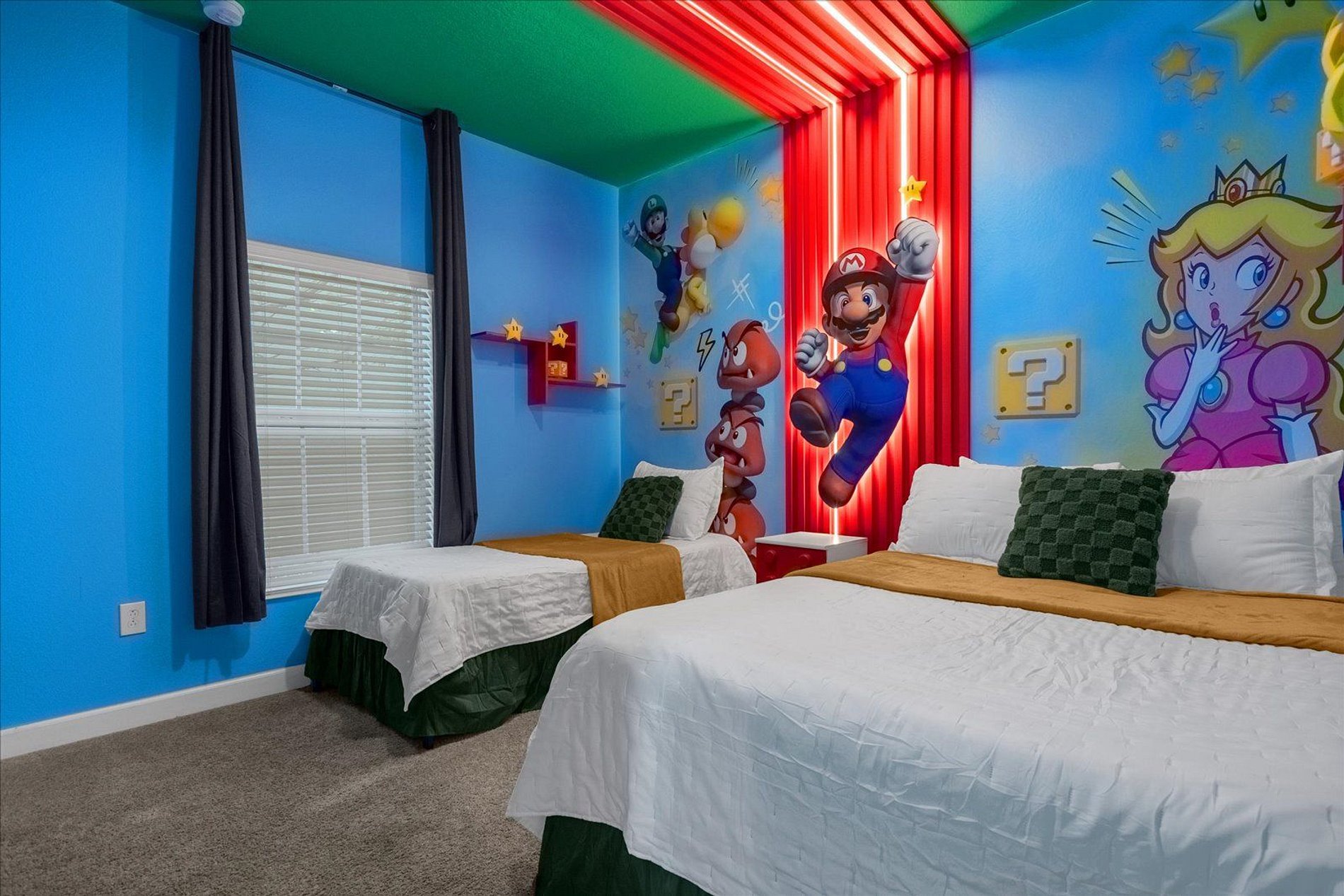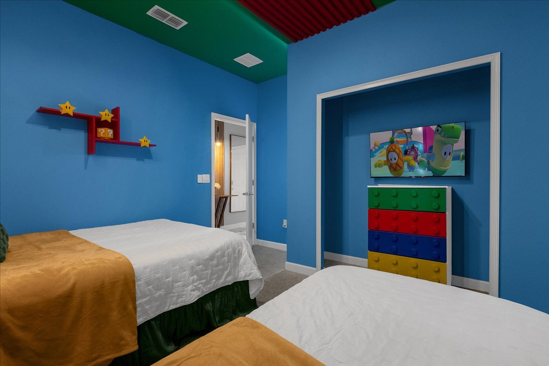 2ND FLOOR: Bedroom 3: 1 king bed (private bathroom) Bedroom 4: 1 bunk bed (twin over full) + 1 single folding bed Bedroom 5: 1 king bed (private bathroom) Full bathroom in front of this room THIS HAS 2 SUITES.