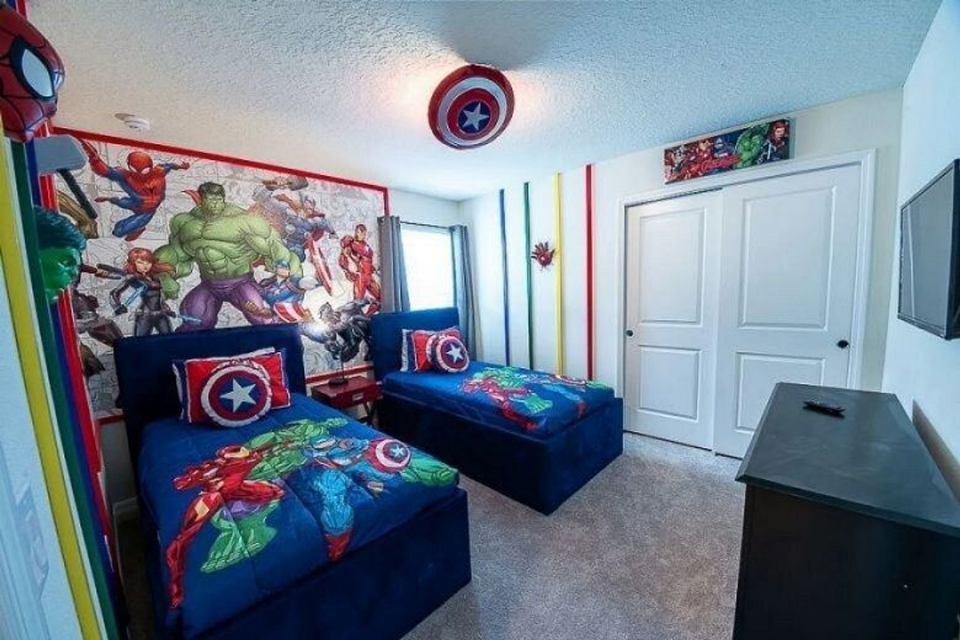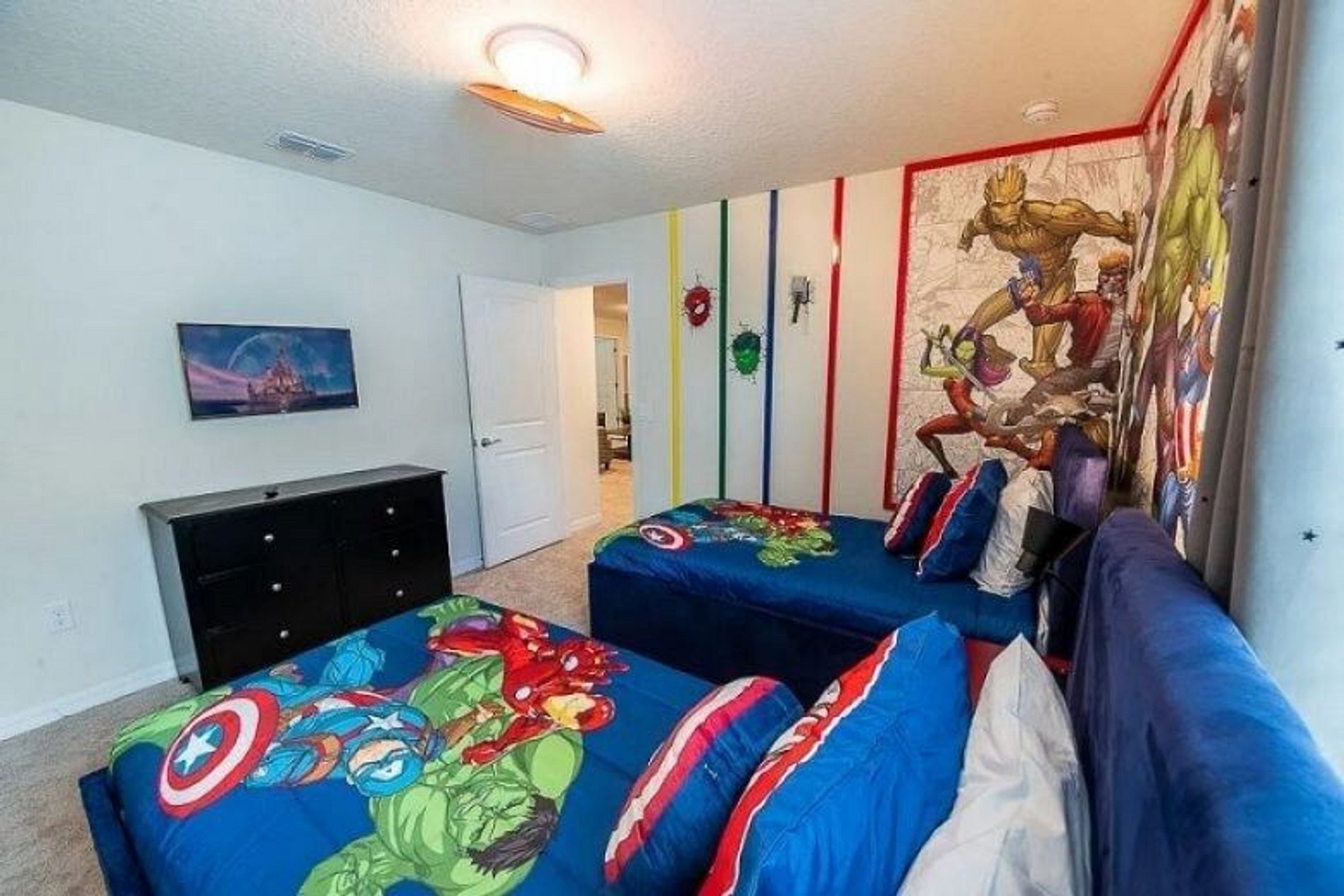 Bedroom 9: "The Avengers" themed room with 2 twin beds, shared --bathroom (sleeps 2);