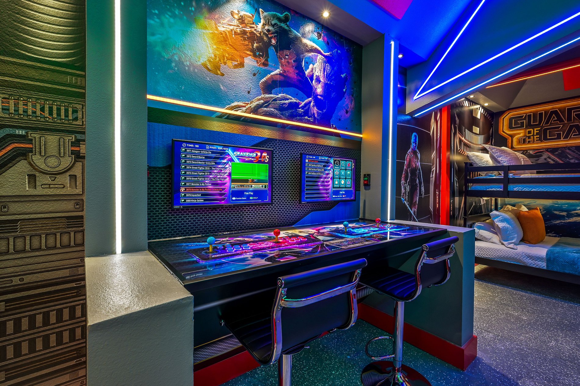 The house is located in the Windsor Island Resort, 19 minutes from Disney World. This unit is just steps away from the clubhouse. Enjoy the water park, basketball, sand volleyball, golf... Decoration and design of the highest quality. Wi-Fi Internet, cable TV, full kitchen and comfortably accommodates 28 guests. Room decorated with a princess theme, with a realistic castle and a Buzz Lightyear theme. And amazing game room, guardians of the galaxy and also a cinema room with disney characters.
