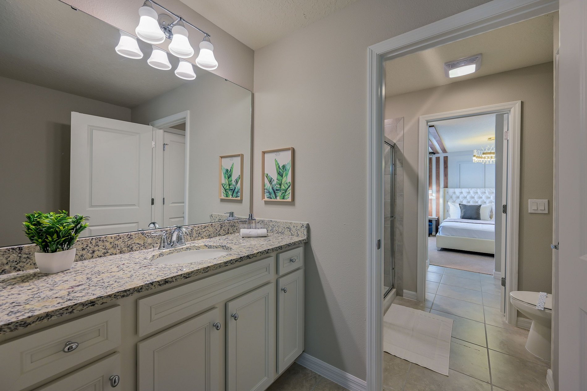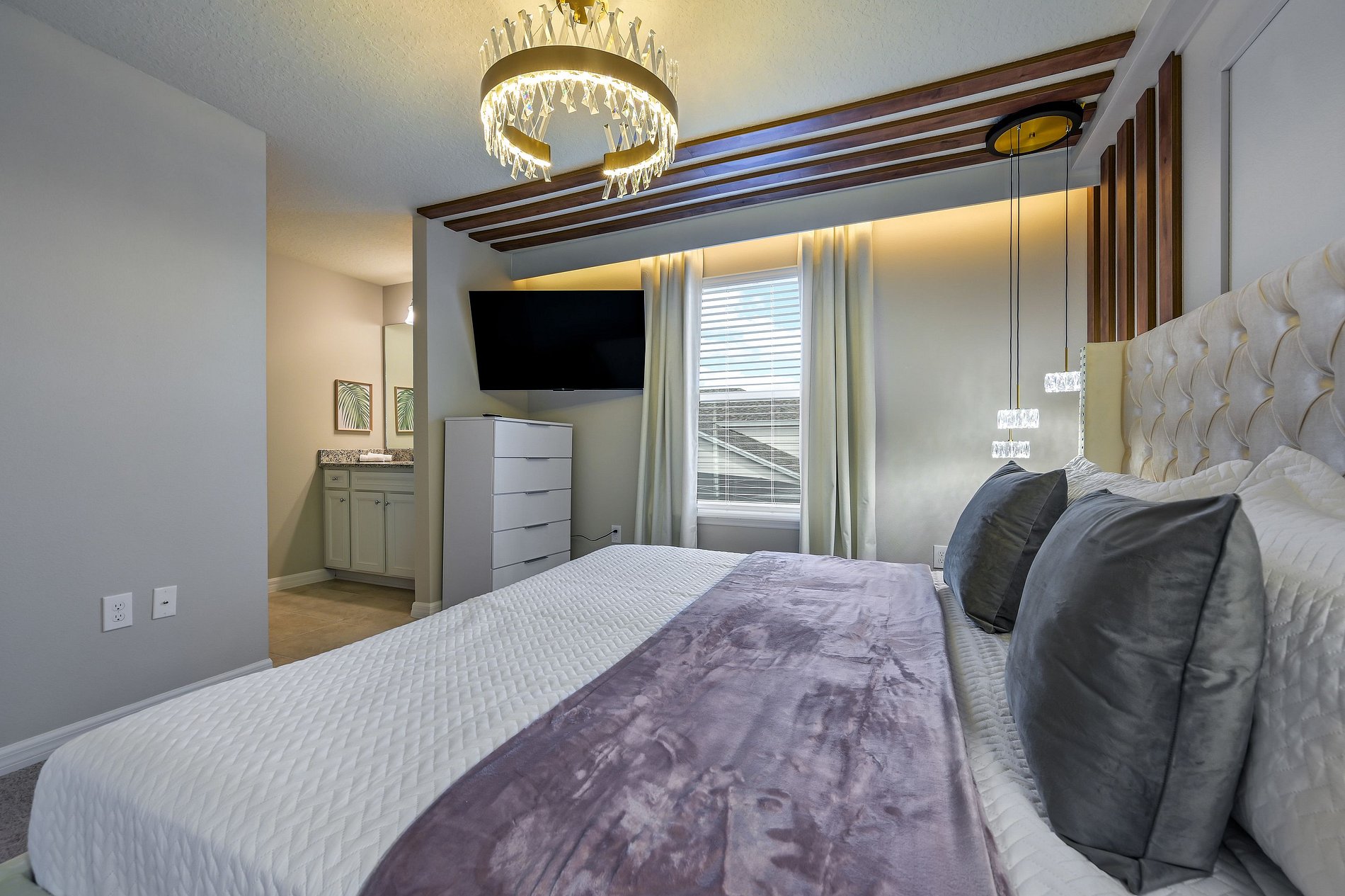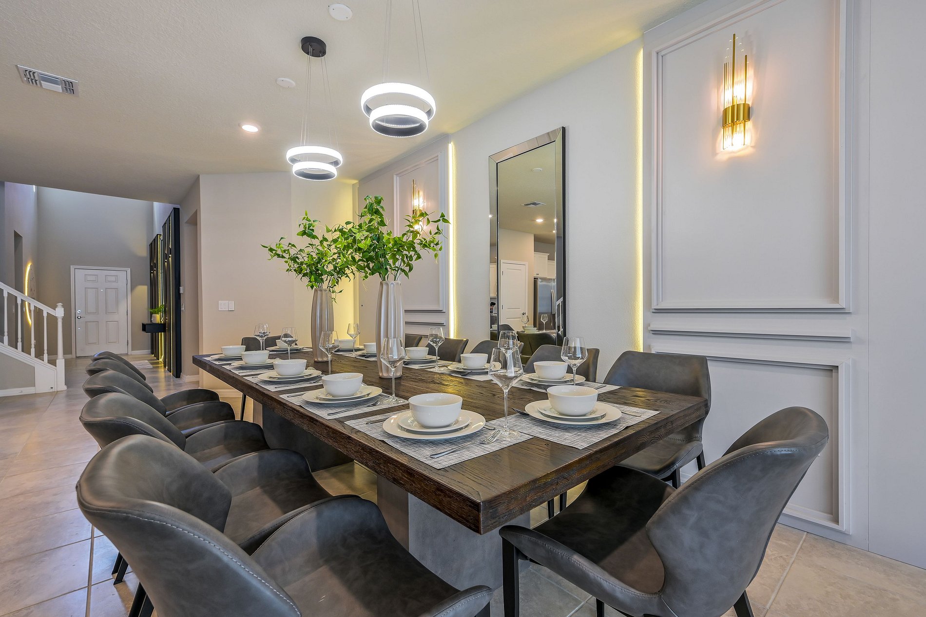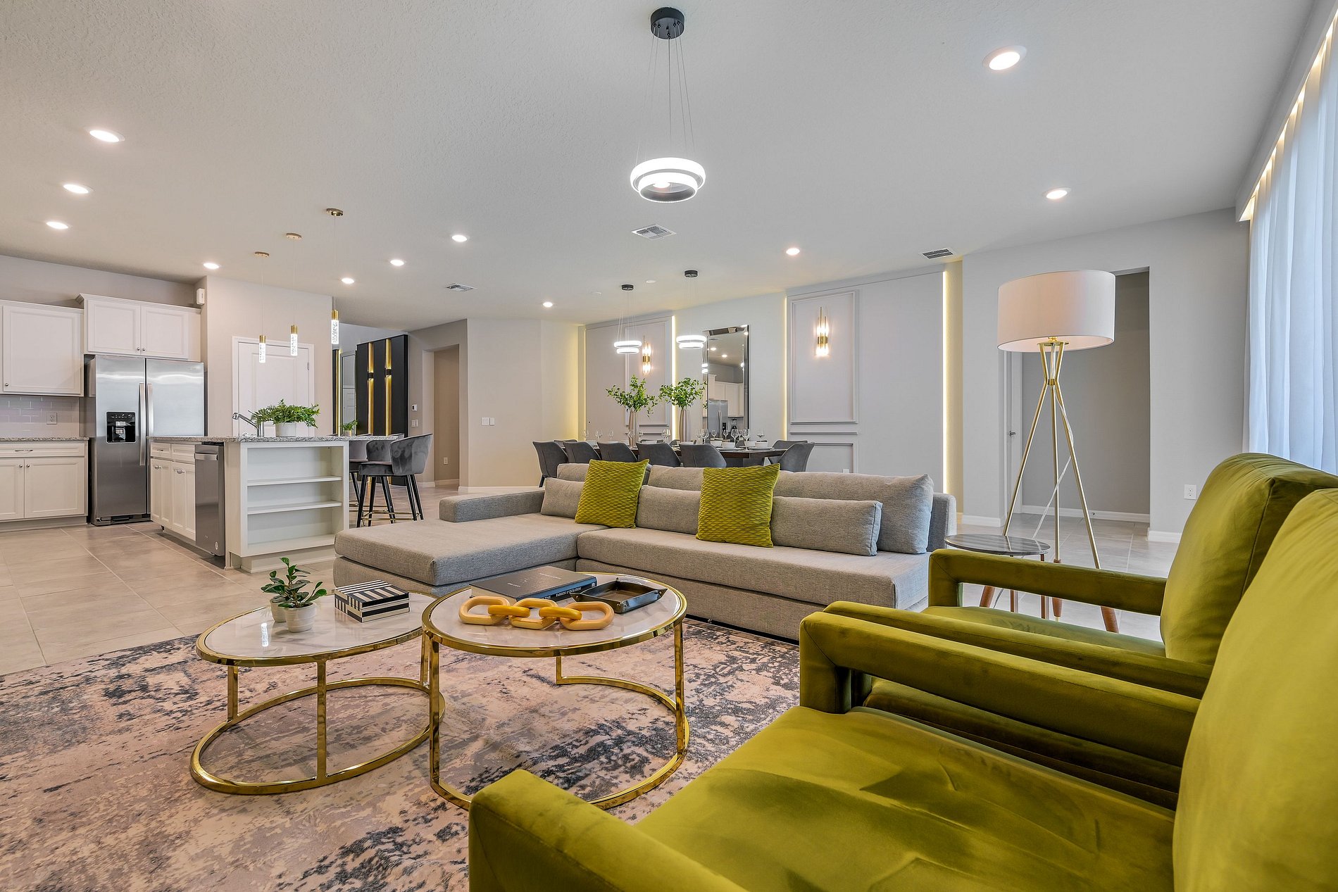 We stayed here because of the very large group (6 families) and the house had more than enough space. The rooms were large enough a few even had pack and plays for younger guests. The resort has a lazy river, pool, kids pool with slides, miniature golf, arcade, and gym. Overall the facilities were awesome and there weren't any issues. Working with the host was great and weren't any issues. Any questions I had he responded to quickly and the best he could to solve any issues. The only downside here is the entire community is a short term rental and parking as a whole is limited. I'd recommend having no more than 3-4 cars here so you don't have to park around the corner or somewhere else. You could fit four cars in the driveway if you get them close together. We had a suburban, minivan, and SUV. I'd recommend the place for other families or groups looking for a nice place, lots of space, and close to Disney/Sea World/Universal. Our drive was about 30-60 min to Disney.
