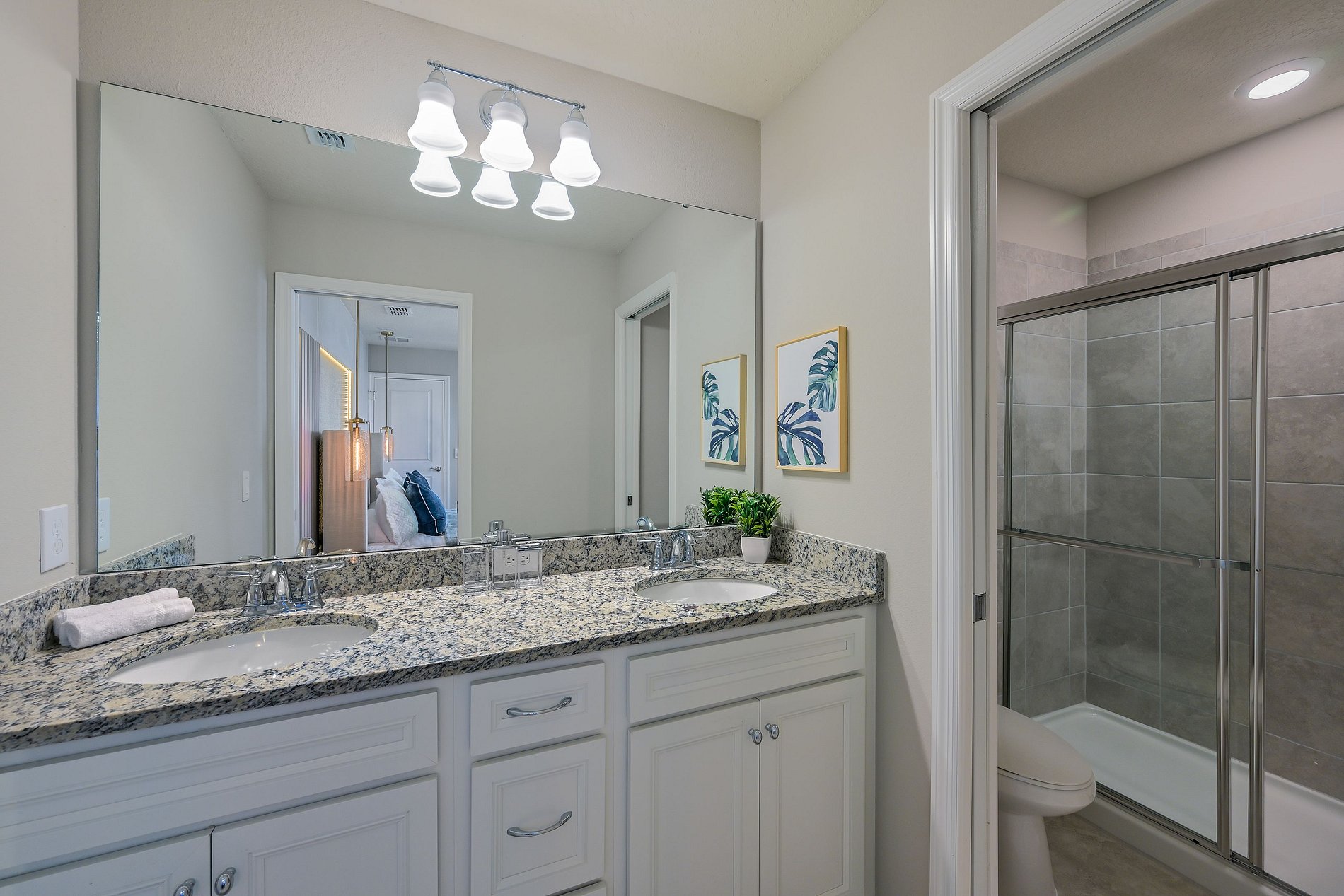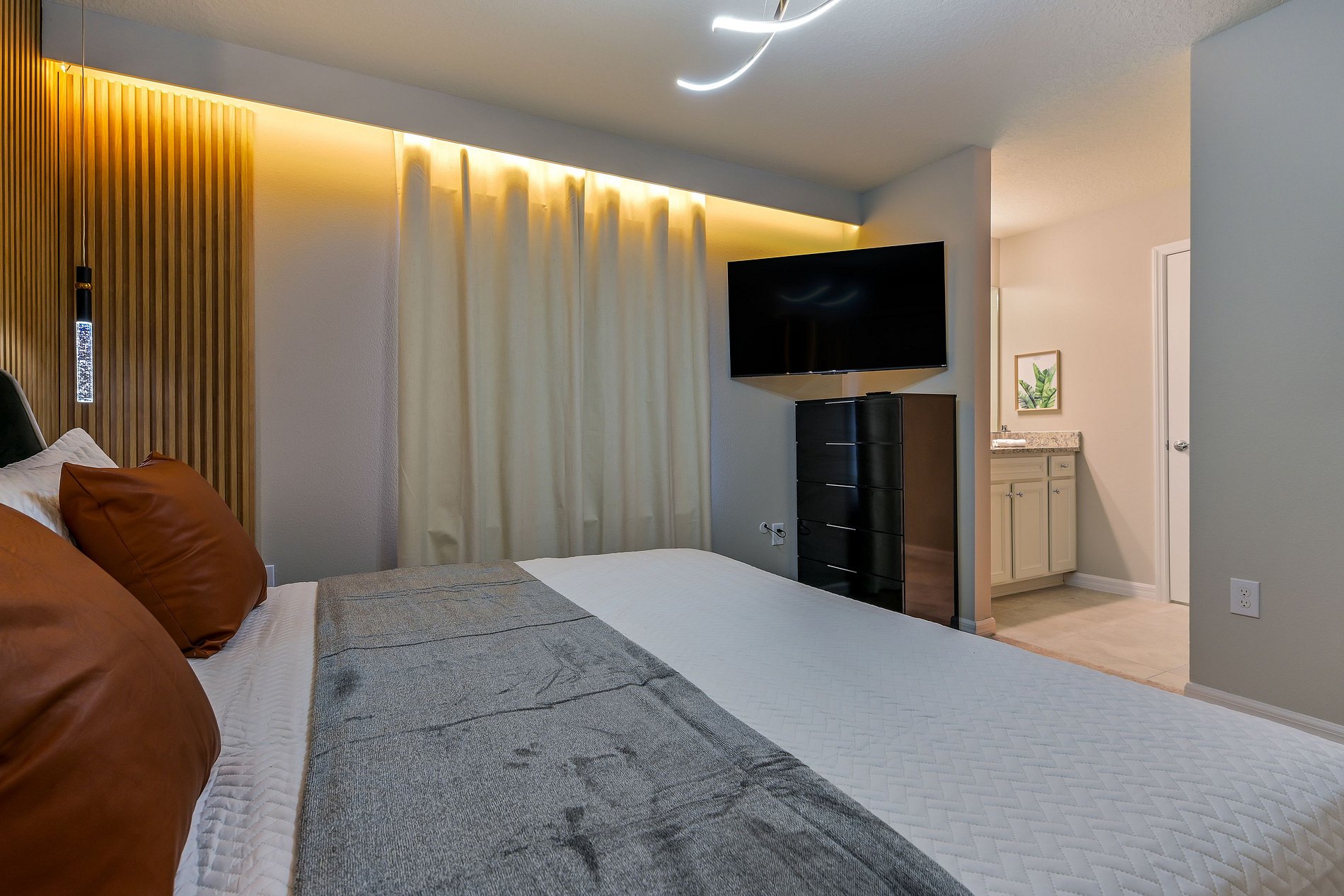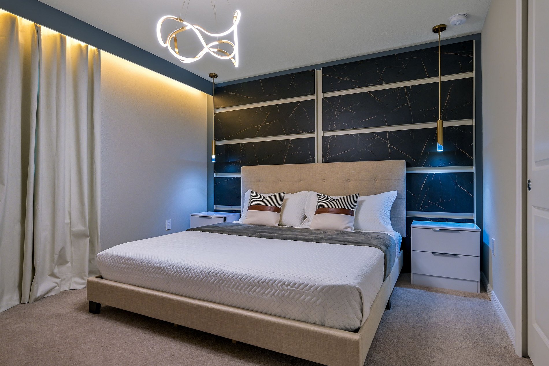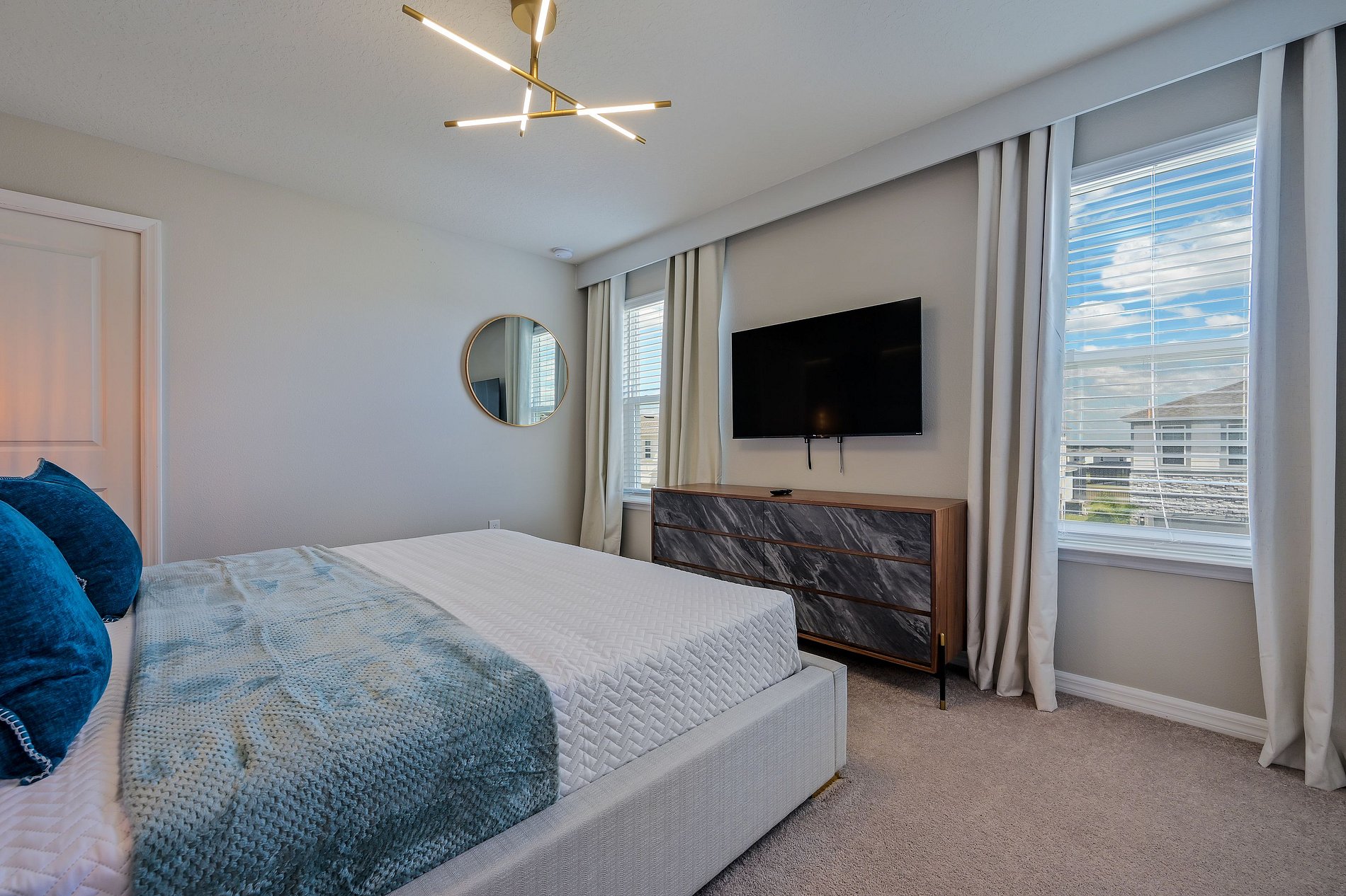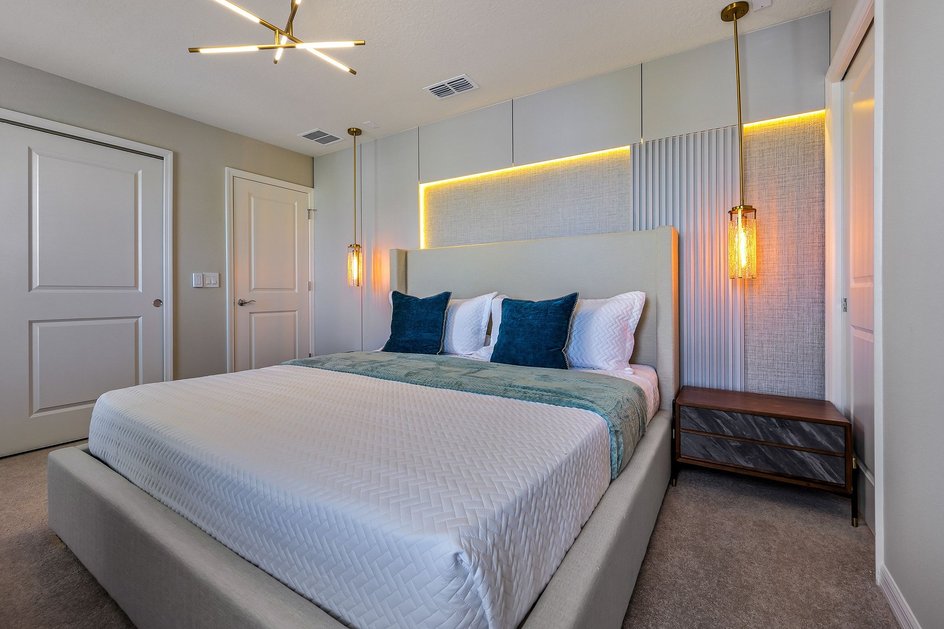 We stayed here because of the very large group (6 families) and the house had more than enough space. The rooms were large enough a few even had pack and plays for younger guests. The resort has a lazy river, pool, kids pool with slides, miniature golf, arcade, and gym. Overall the facilities were awesome and there weren't any issues. Working with the host was great and weren't any issues. Any questions I had he responded to quickly and the best he could to solve any issues. The only downside here is the entire community is a short term rental and parking as a whole is limited. I'd recommend having no more than 3-4 cars here so you don't have to park around the corner or somewhere else. You could fit four cars in the driveway if you get them close together. We had a suburban, minivan, and SUV. I'd recommend the place for other families or groups looking for a nice place, lots of space, and close to Disney/Sea World/Universal. Our drive was about 30-60 min to Disney.