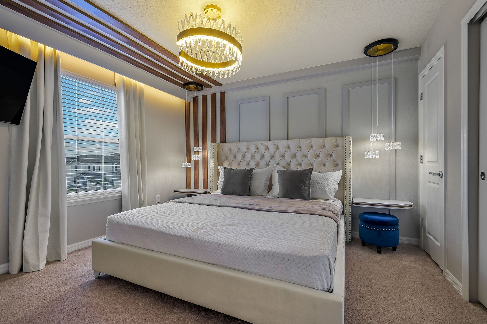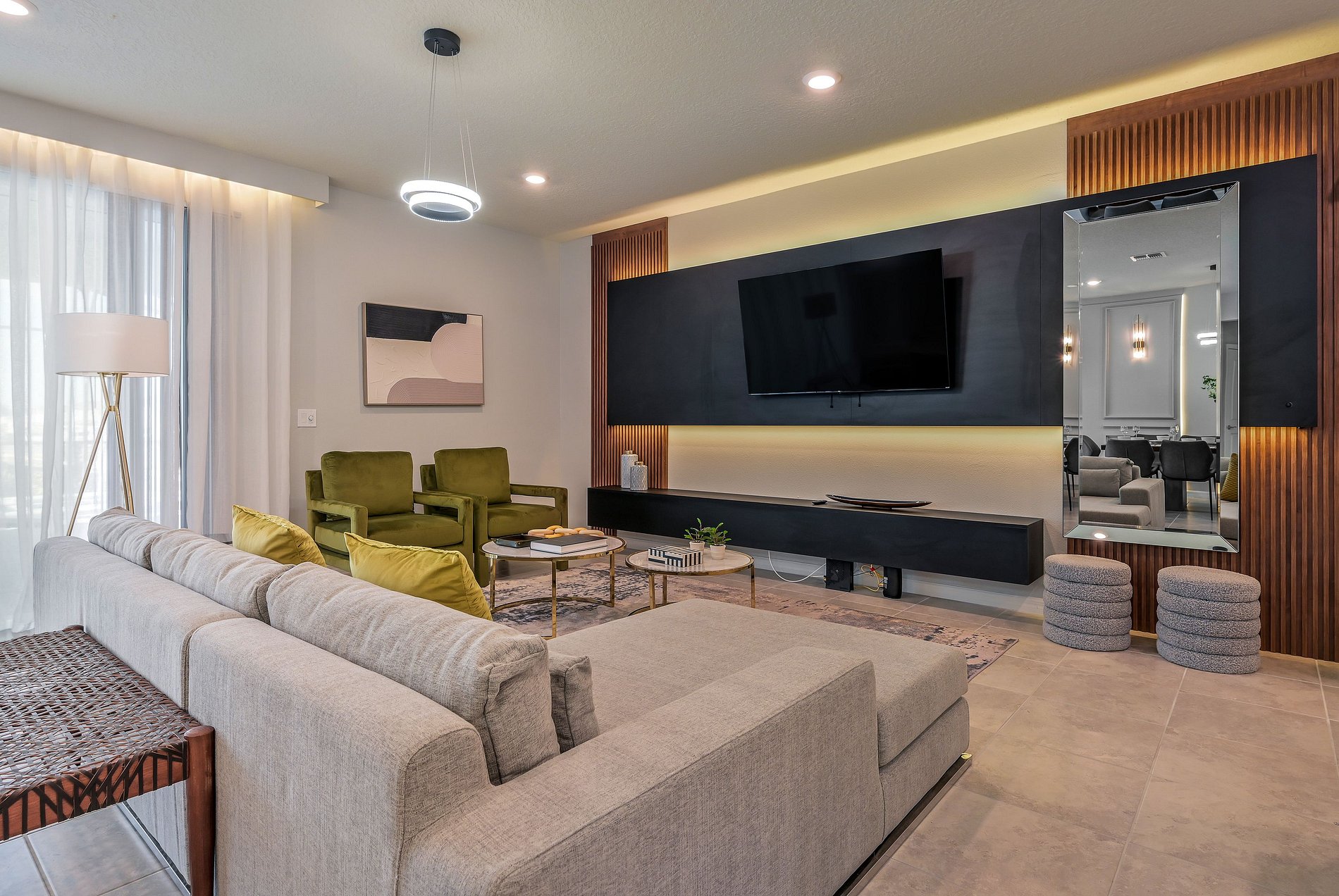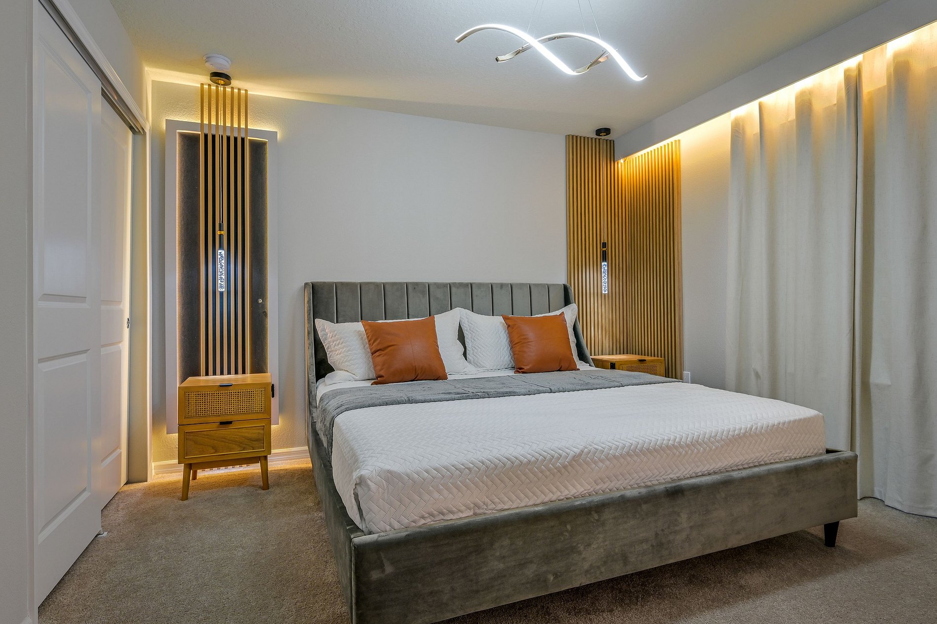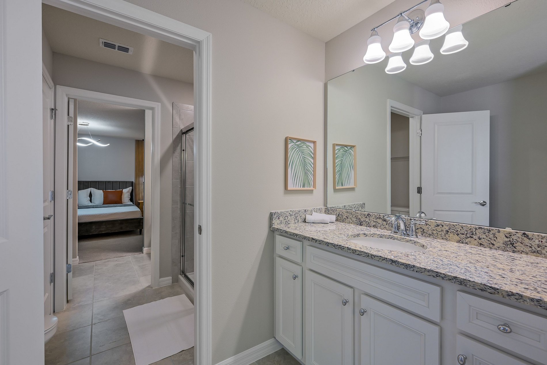 We stayed here because of the very large group (6 families) and the house had more than enough space. The rooms were large enough a few even had pack and plays for younger guests. The resort has a lazy river, pool, kids pool with slides, miniature golf, arcade, and gym. Overall the facilities were awesome and there weren't any issues. Working with the host was great and weren't any issues. Any questions I had he responded to quickly and the best he could to solve any issues. The only downside here is the entire community is a short term rental and parking as a whole is limited. I'd recommend having no more than 3-4 cars here so you don't have to park around the corner or somewhere else. You could fit four cars in the driveway if you get them close together. We had a suburban, minivan, and SUV. I'd recommend the place for other families or groups looking for a nice place, lots of space, and close to Disney/Sea World/Universal. Our drive was about 30-60 min to Disney.
