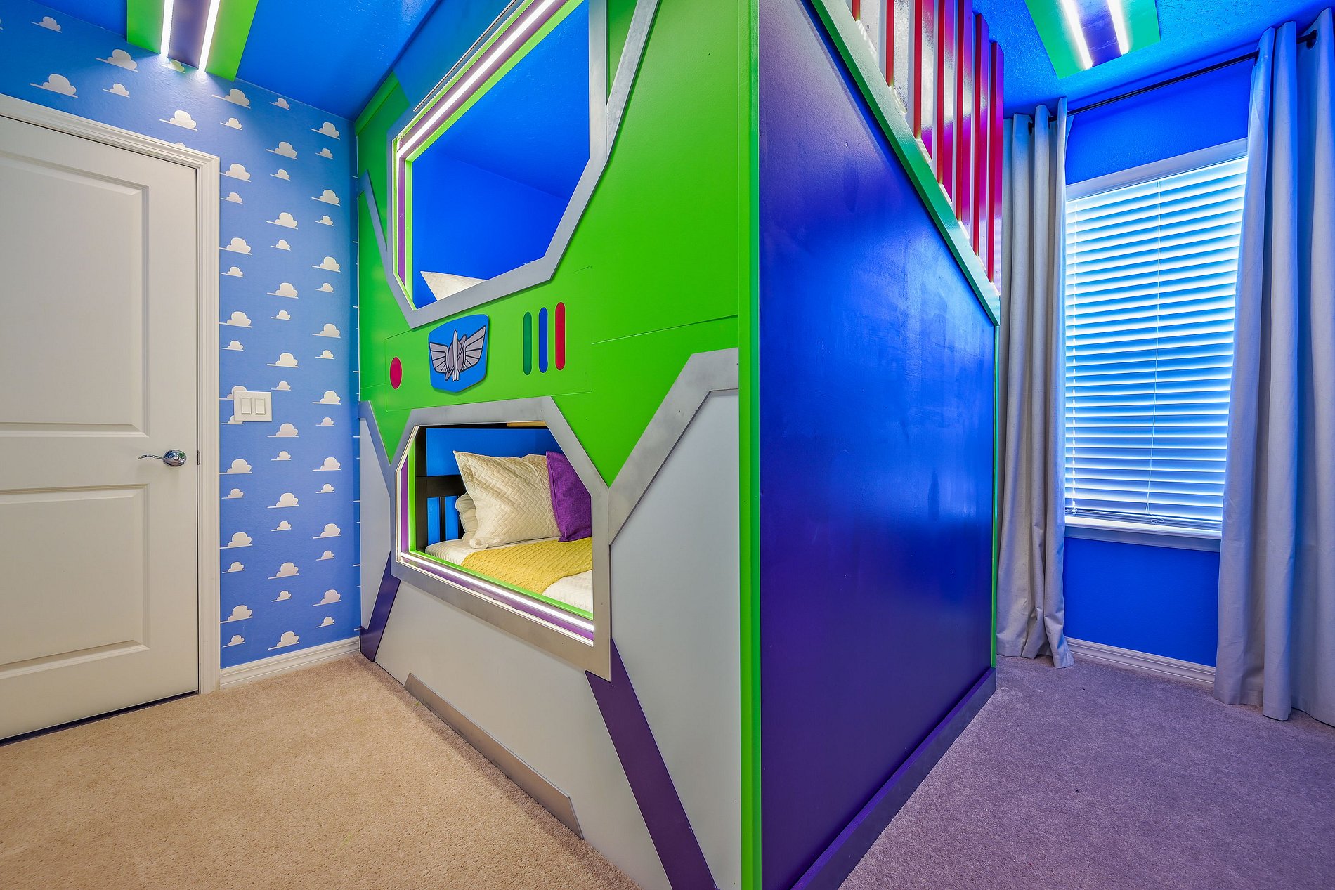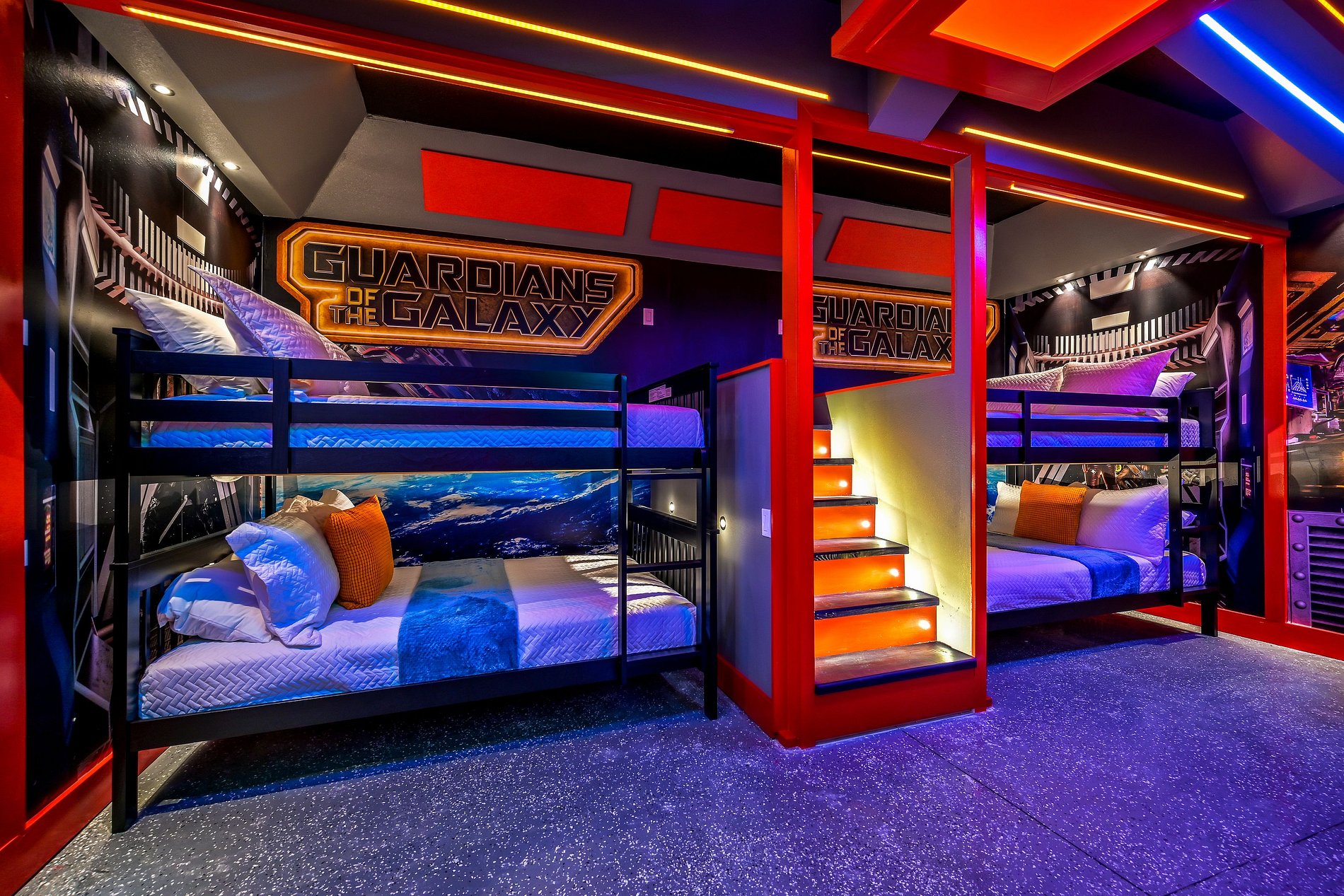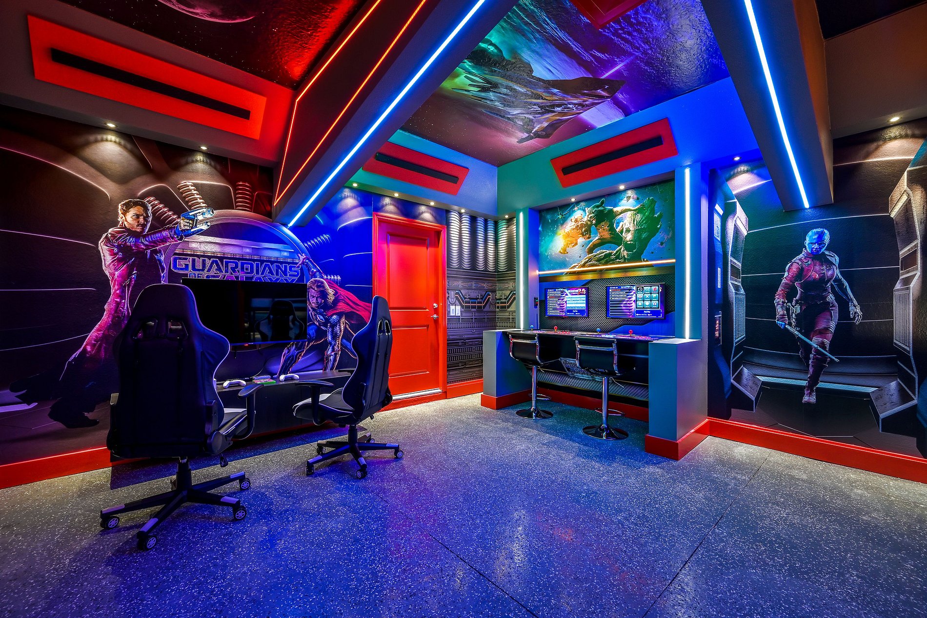 The house is located in the Windsor Island Resort, 19 minutes from Disney World. This unit is just steps away from the clubhouse. Enjoy the water park, basketball, sand volleyball, golf... Decoration and design of the highest quality. Wi-Fi Internet, cable TV, full kitchen and comfortably accommodates 28 guests. Room decorated with a princess theme, with a realistic castle and a Buzz Lightyear theme. And amazing game room, guardians of the galaxy and also a cinema room with disney characters.