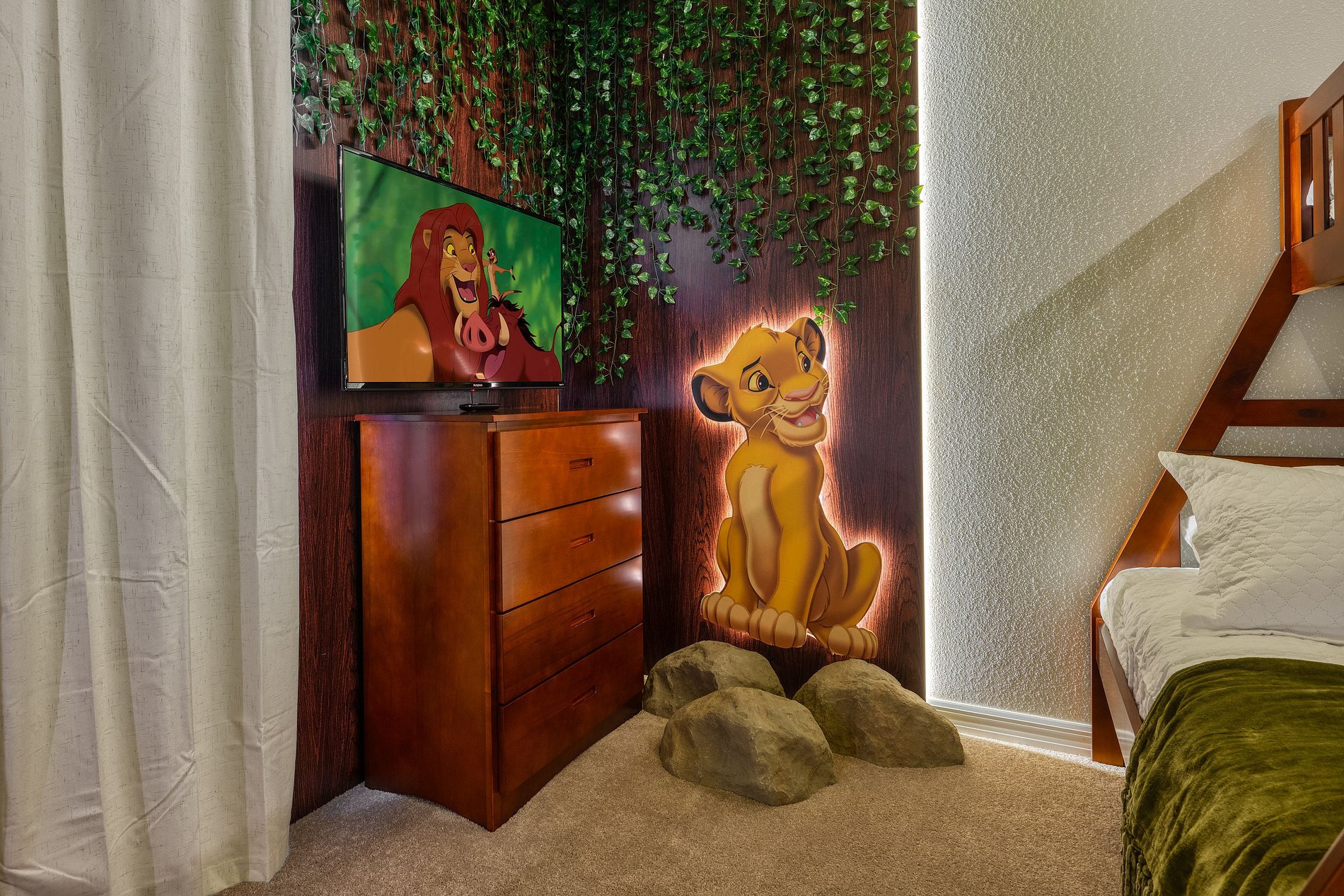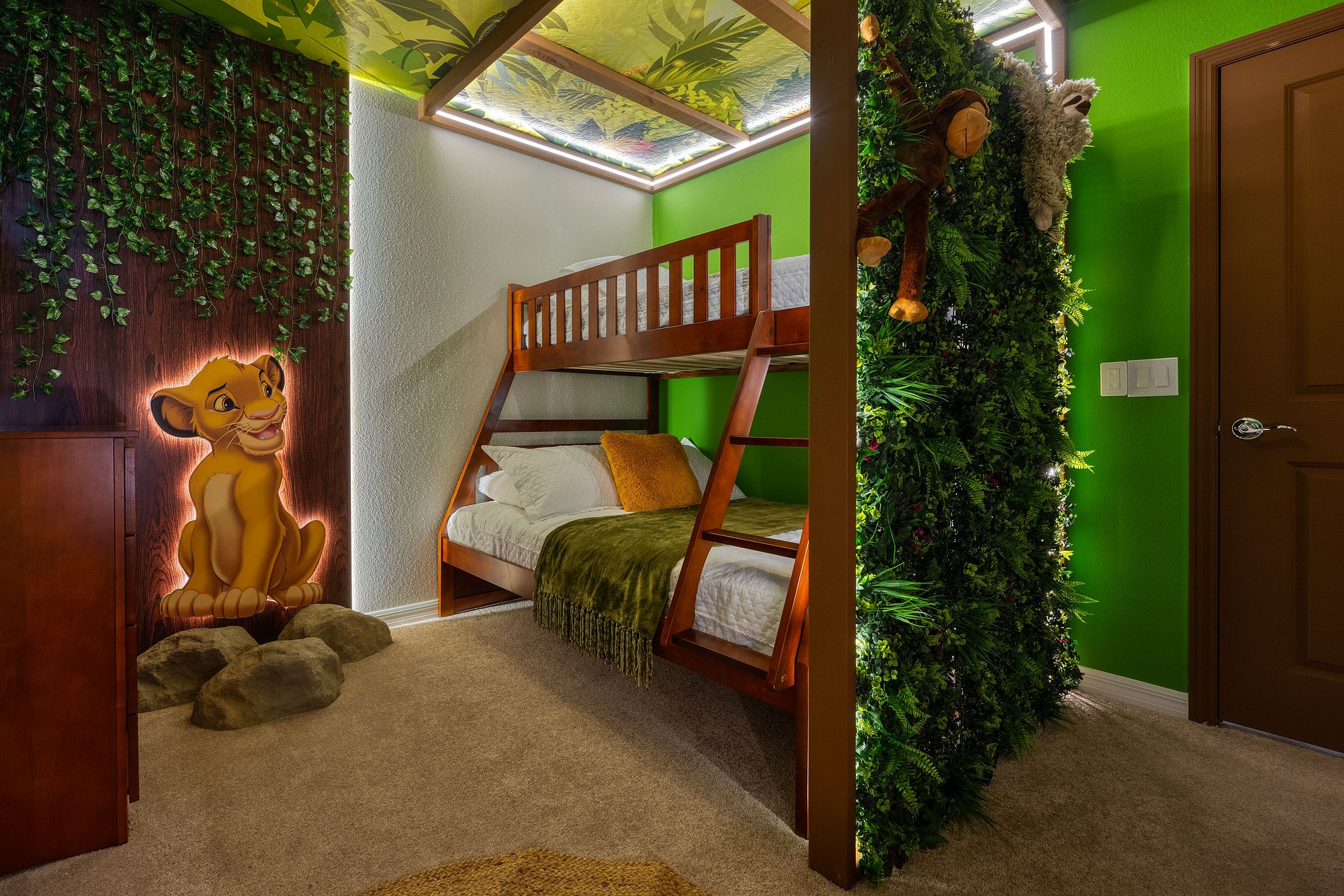 -1 bedroom with bunk bed, 1 full bed and 1 double bed; Lion King theme.
